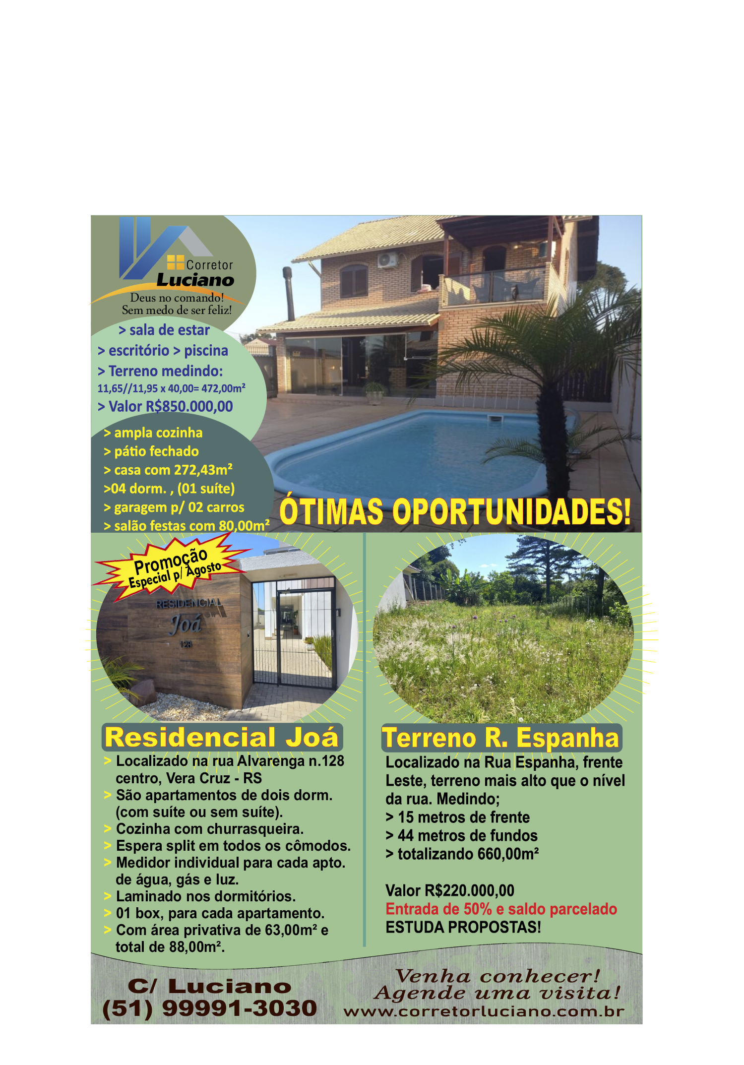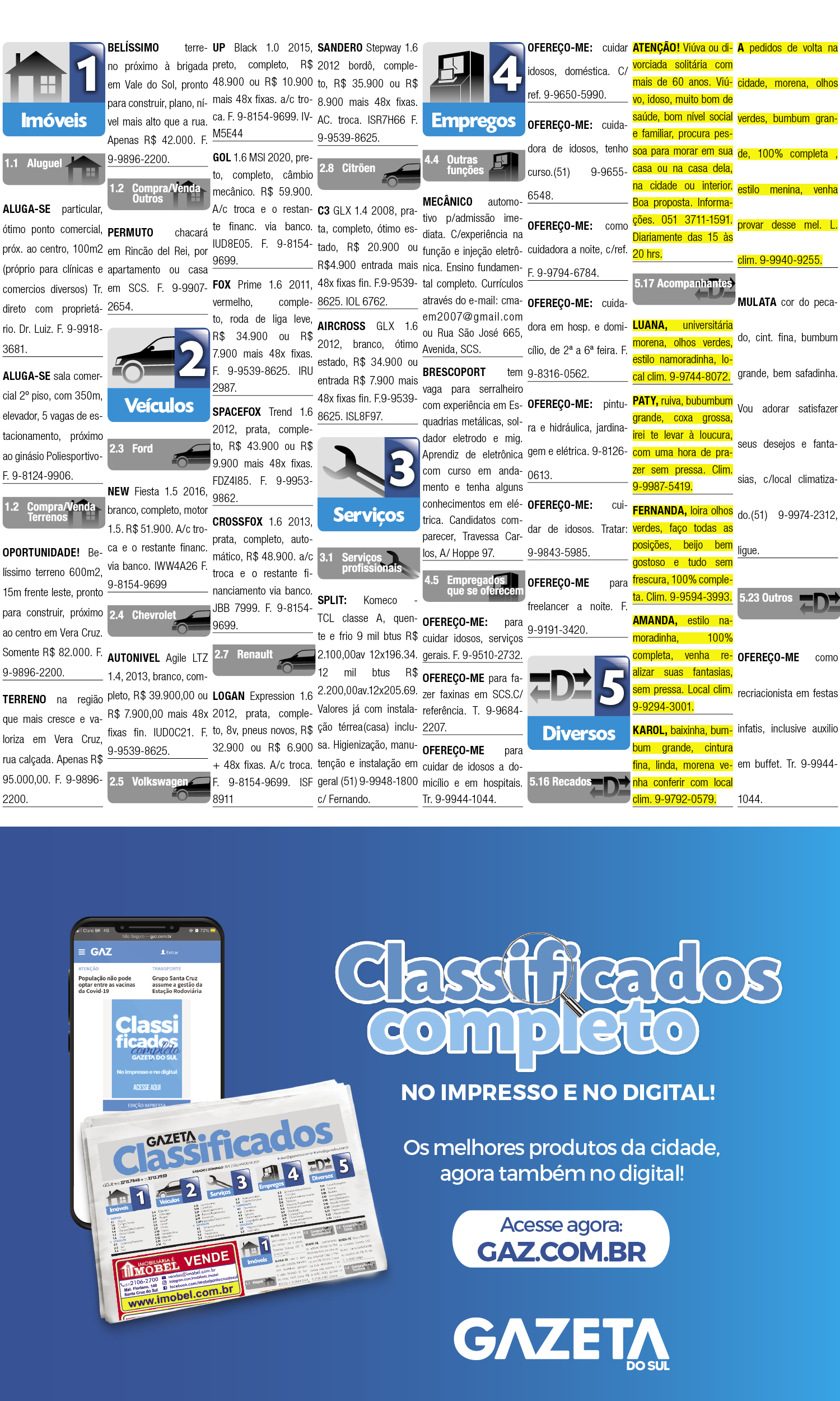 O suplemento de Classificados, que circula nas edições de terças, quintas e sábados, é um dos mais tradicionais da Gazeta do Sul, como vitrine e canal de negócios, de oferta, compra e venda em toda a região central do Rio Grande do Sul. E, para enriquecer pesquisas de produtos e serviços e possibilitar resultado ainda melhor a usuários e parceiros, nos anúncios de clientes cadastrados, o leitor tem acesso direto com link ao site do anunciante, onde poderá verificar mais detalhes sobre os itens. Confira as ofertas: