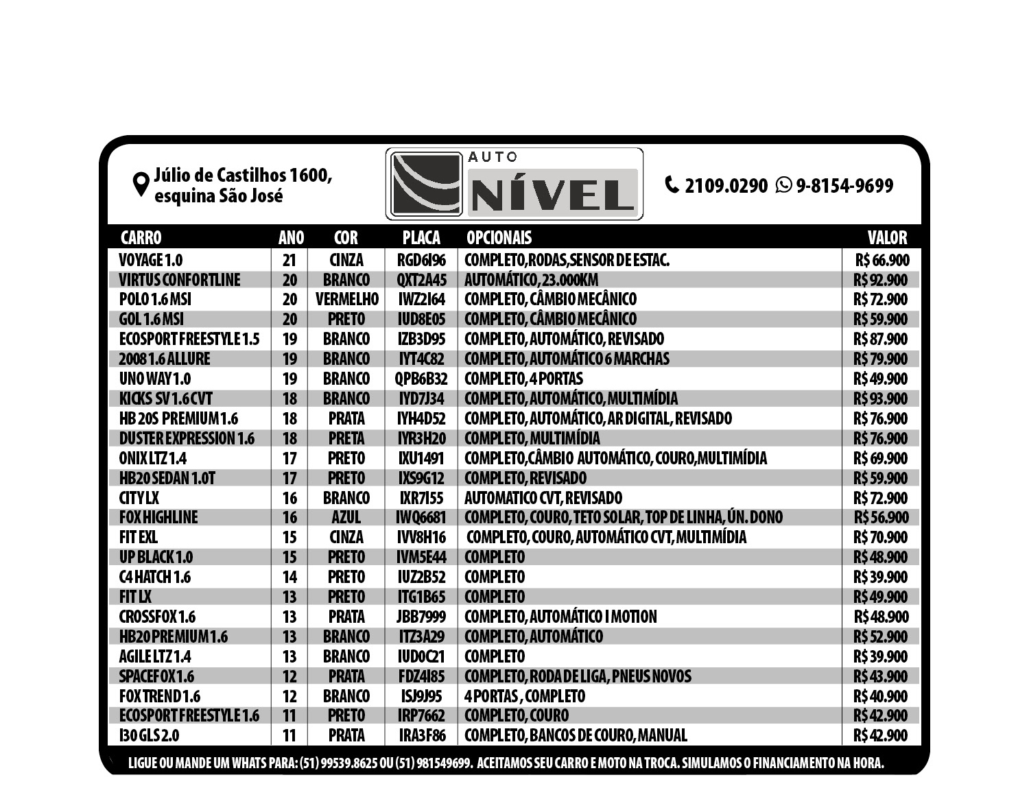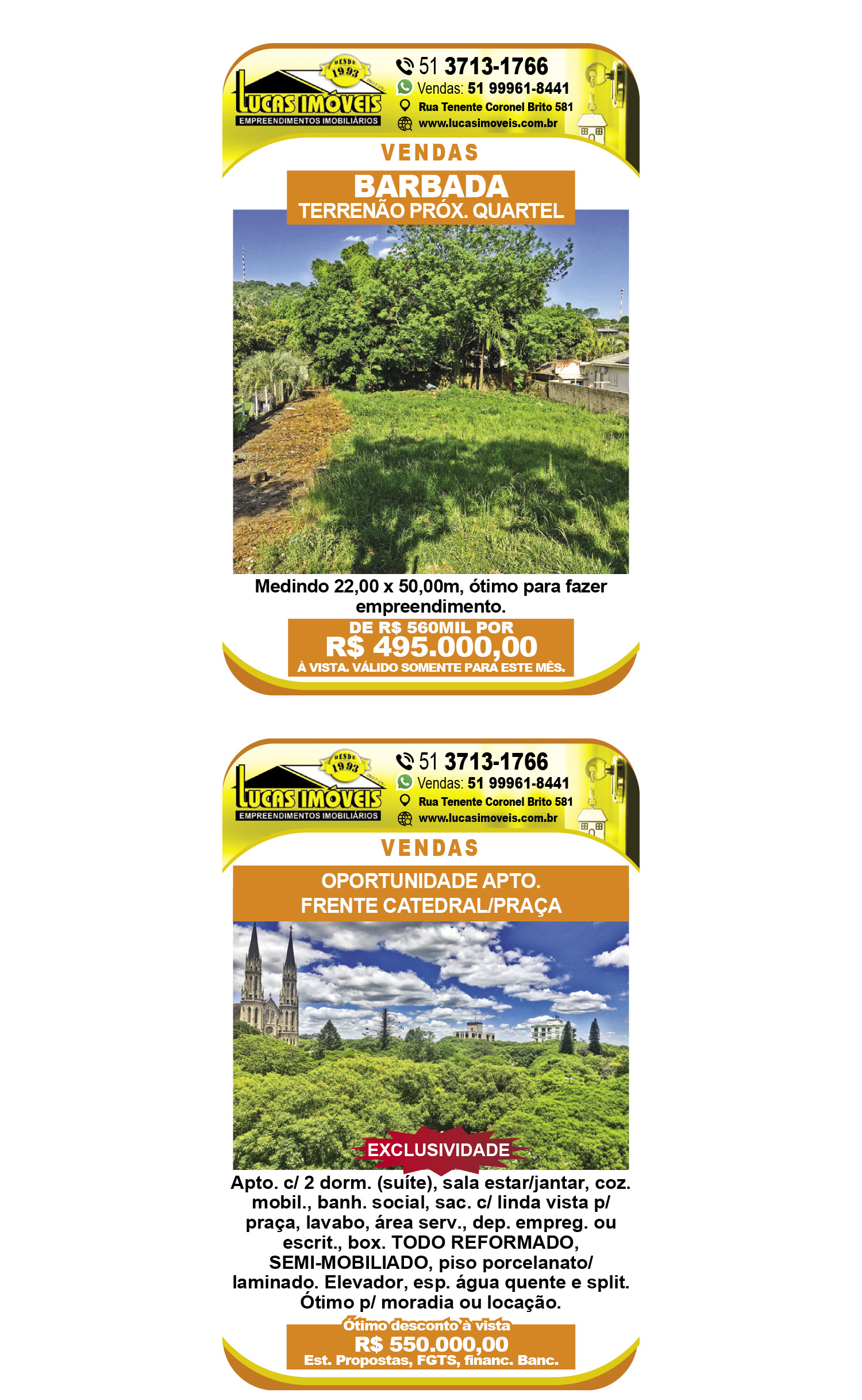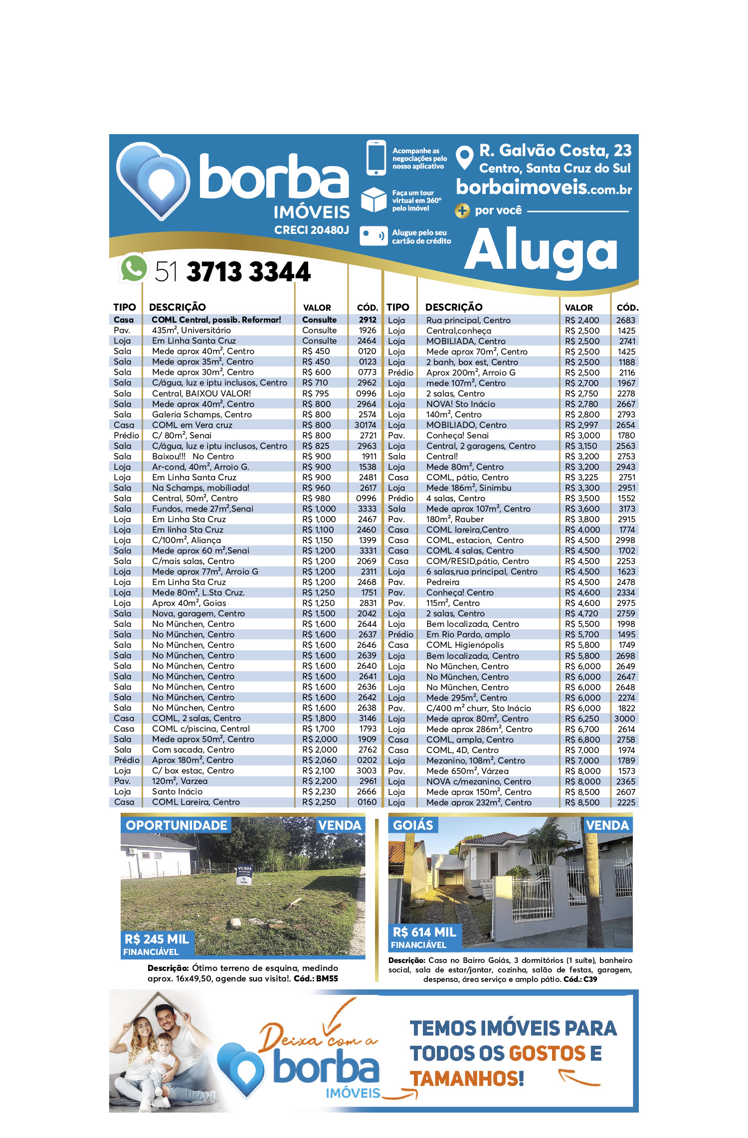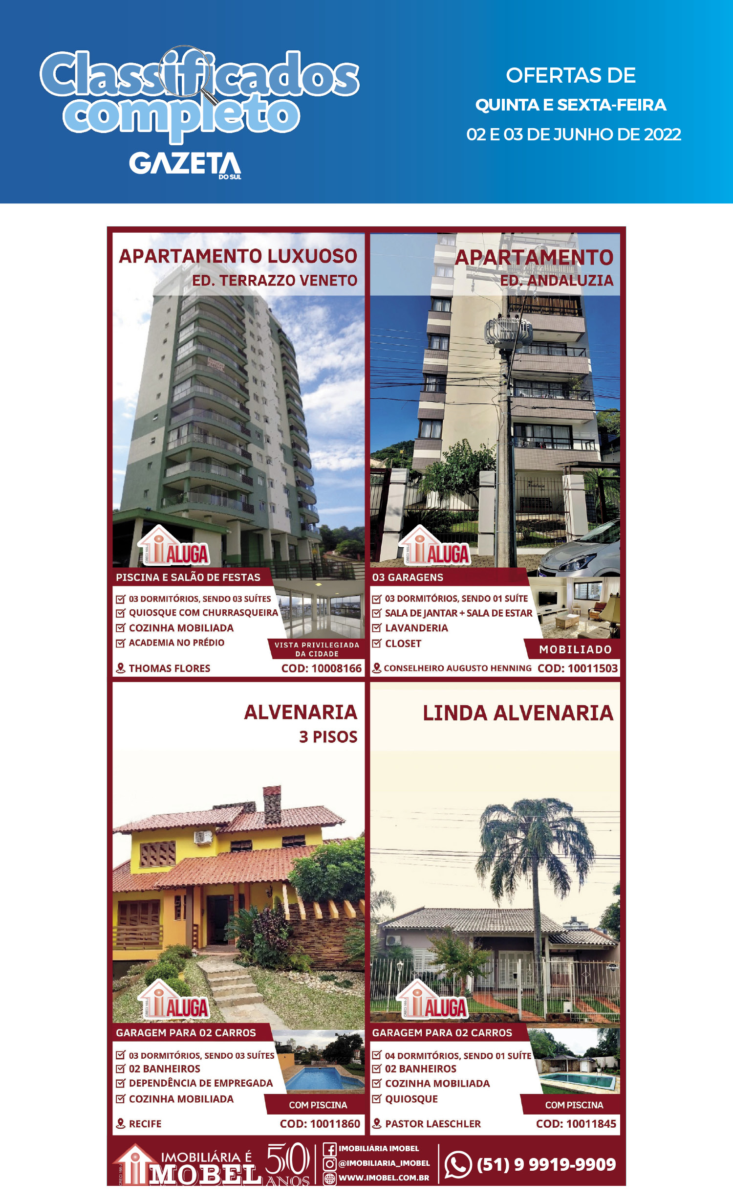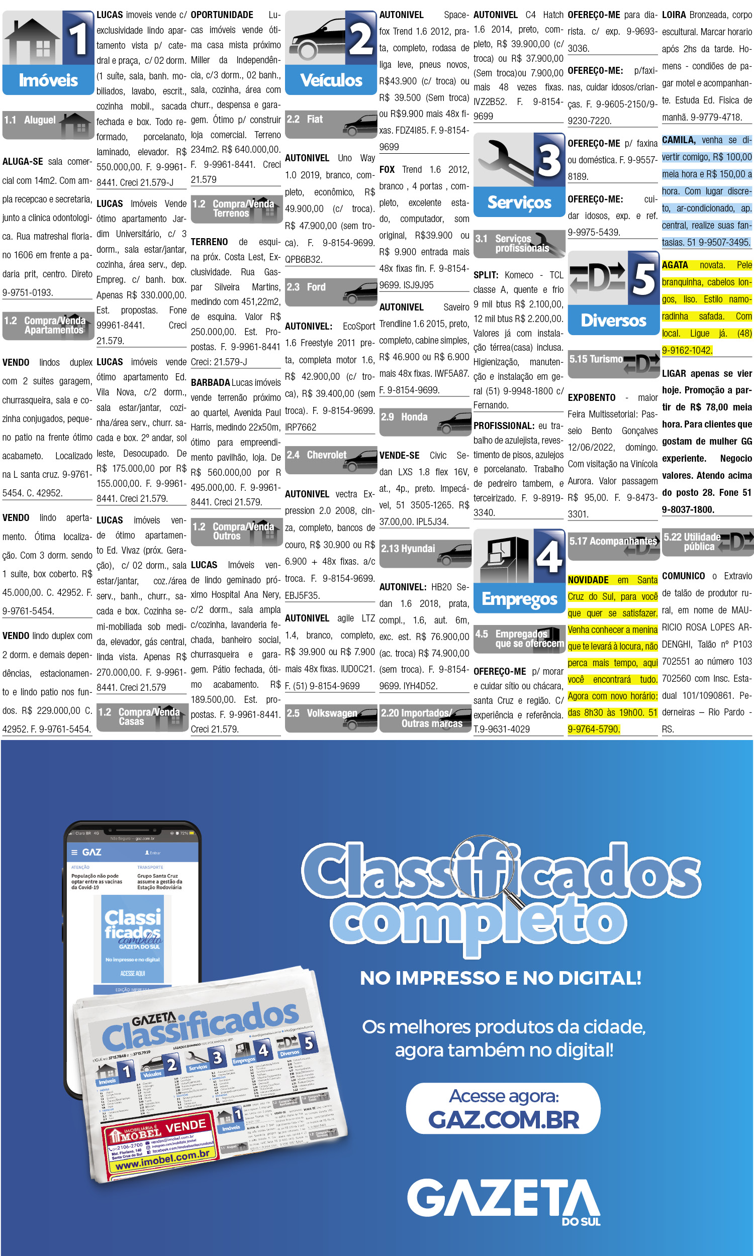 O suplemento de Classificados, que circula nas edições de terças, quintas e sábados, é um dos mais tradicionais da Gazeta do Sul, como vitrine e canal de negócios, de oferta, compra e venda em toda a região central do Rio Grande do Sul. E, para enriquecer pesquisas de produtos e serviços e possibilitar resultado ainda melhor a usuários e parceiros, nos anúncios de clientes cadastrados, o leitor tem acesso direto com link ao site do anunciante, onde poderá verificar mais detalhes sobre os itens. Confira as ofertas: