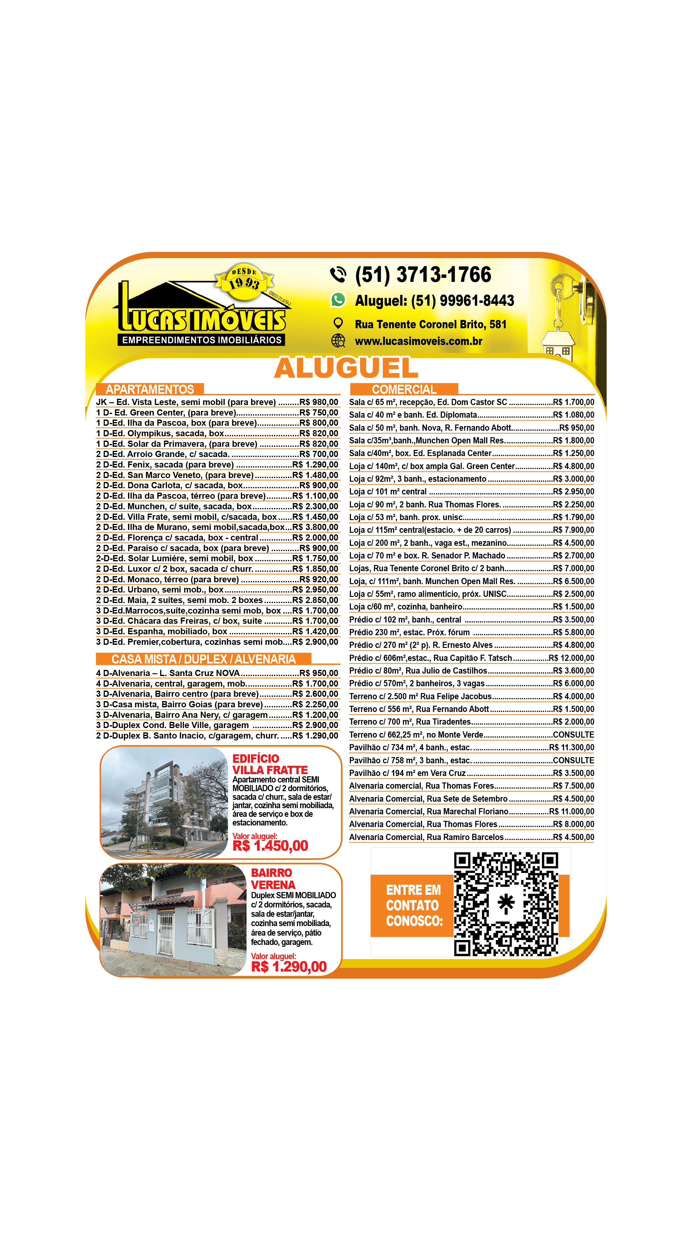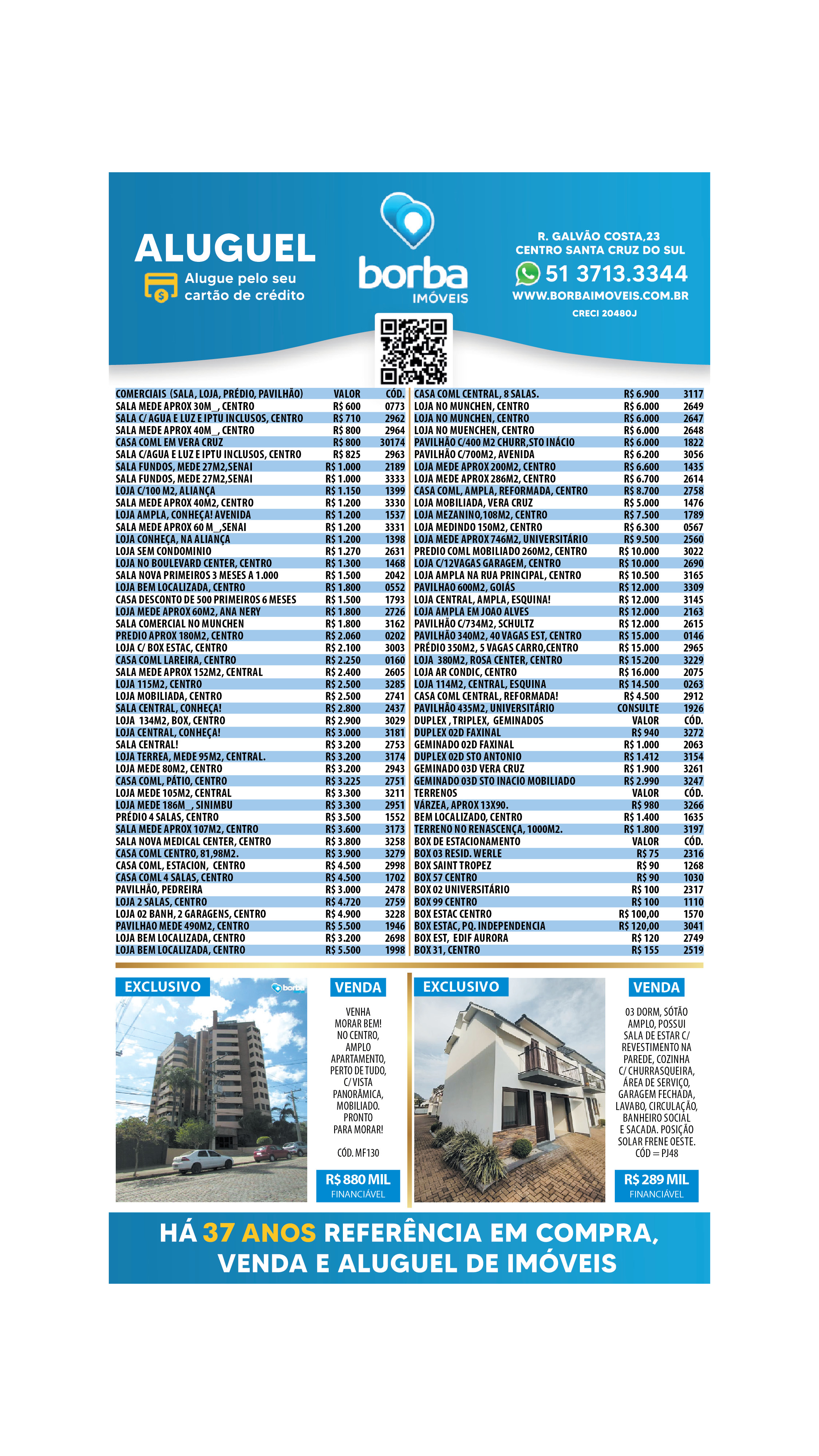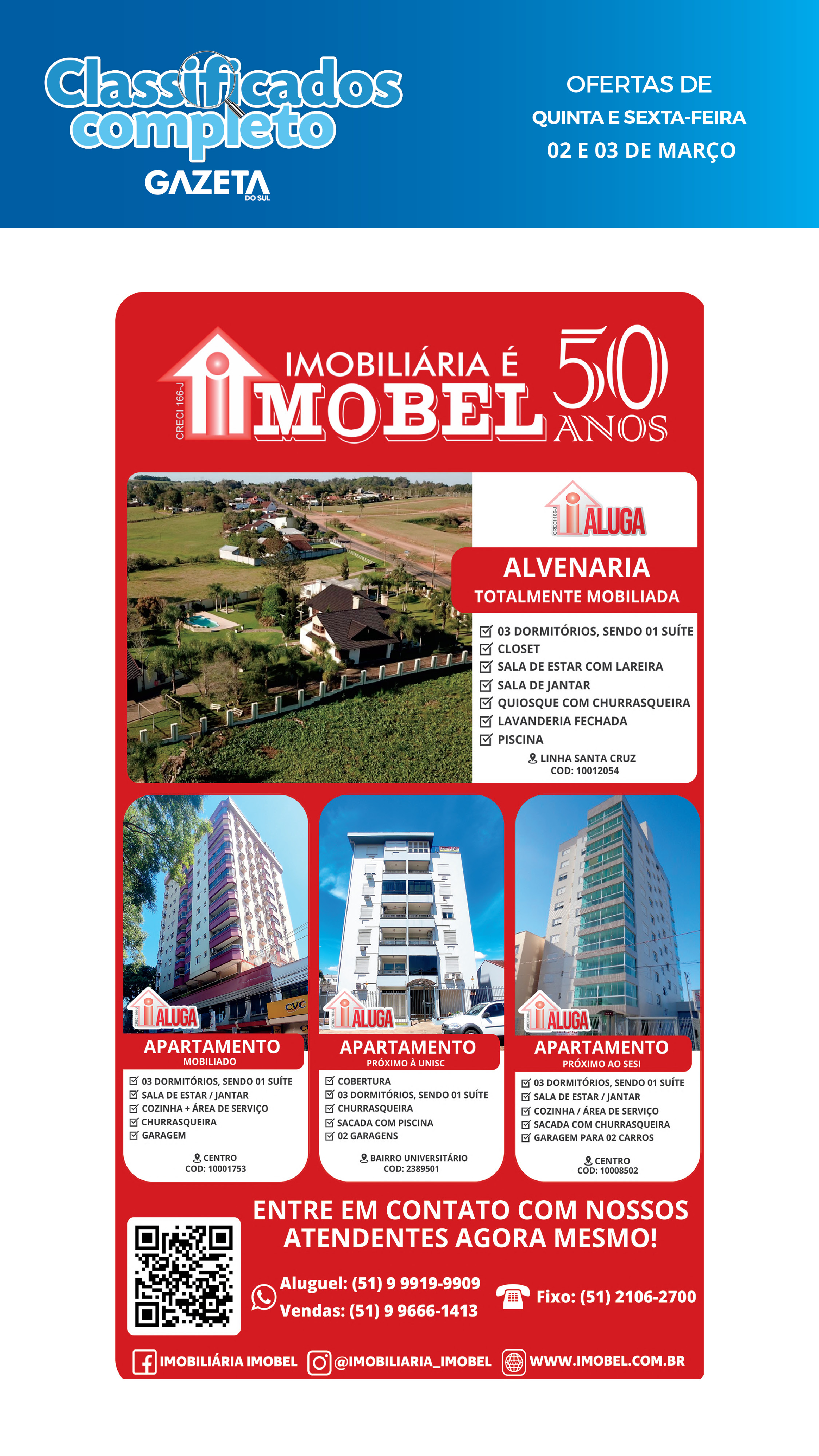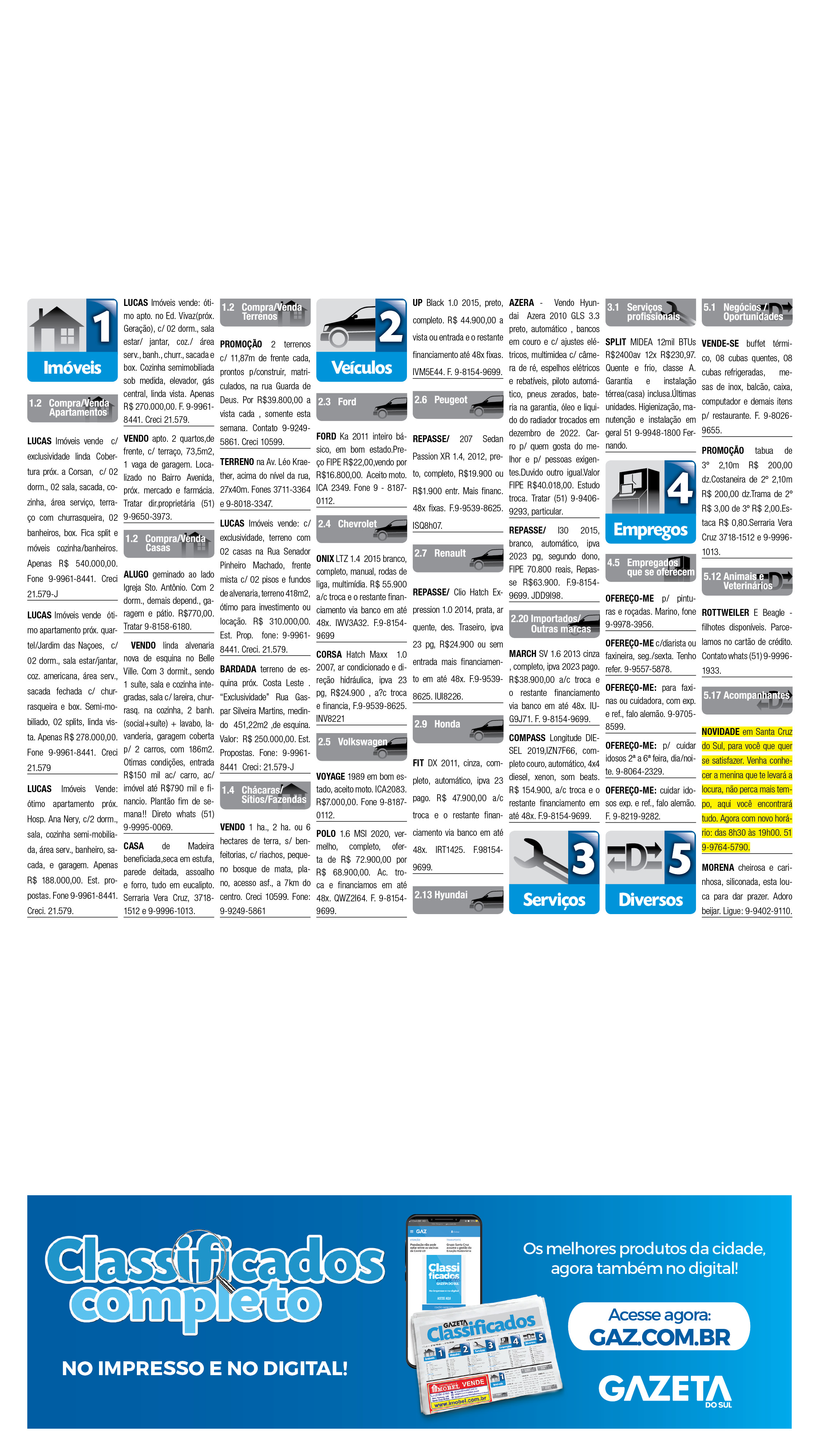 O suplemento de Classificados, que circula nas edições de terças, quintas e sábados, é um dos mais tradicionais da Gazeta do Sul, como vitrine e canal de negócios, de oferta, compra e venda em toda a região central do Rio Grande do Sul. E, para enriquecer pesquisas de produtos e serviços e possibilitar resultado ainda melhor a usuários e parceiros, nos anúncios de clientes cadastrados, o leitor tem acesso direto com link ao site do anunciante, onde poderá verificar mais detalhes sobre os itens. Confira as ofertas: