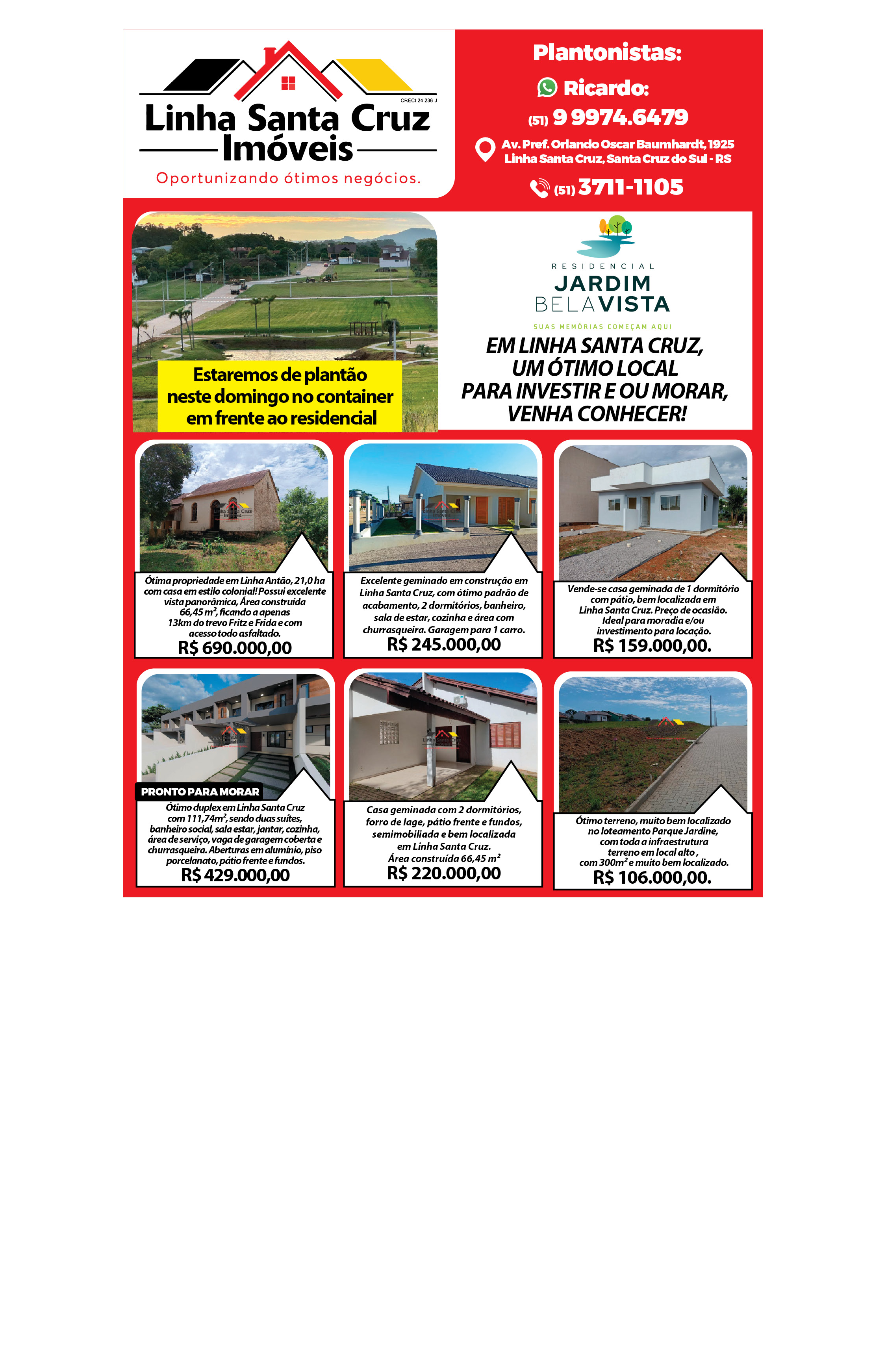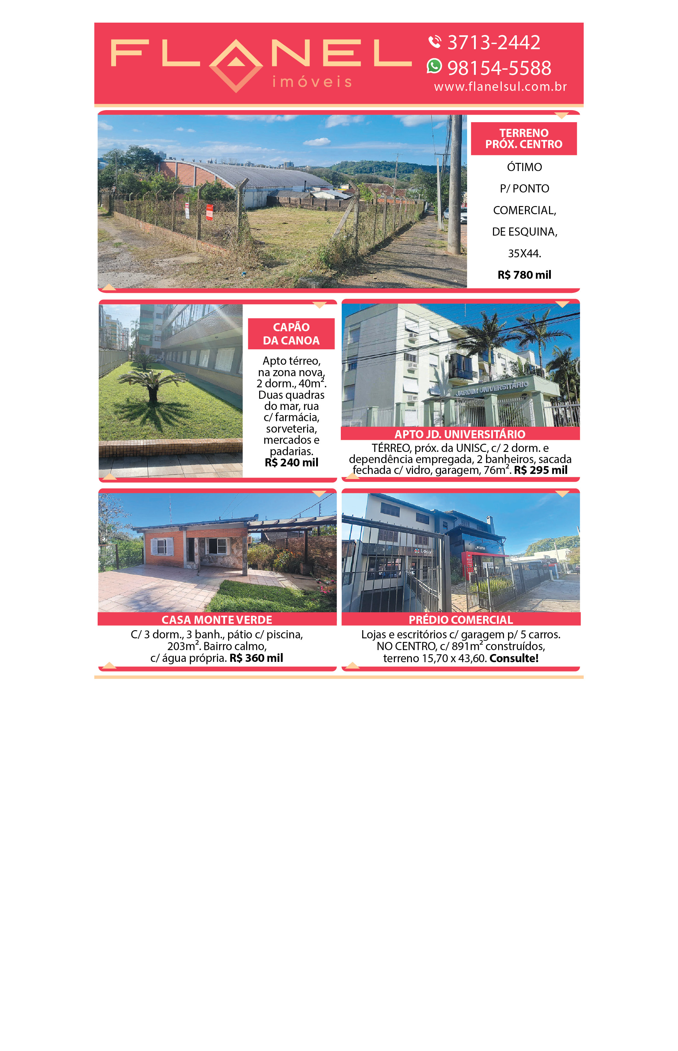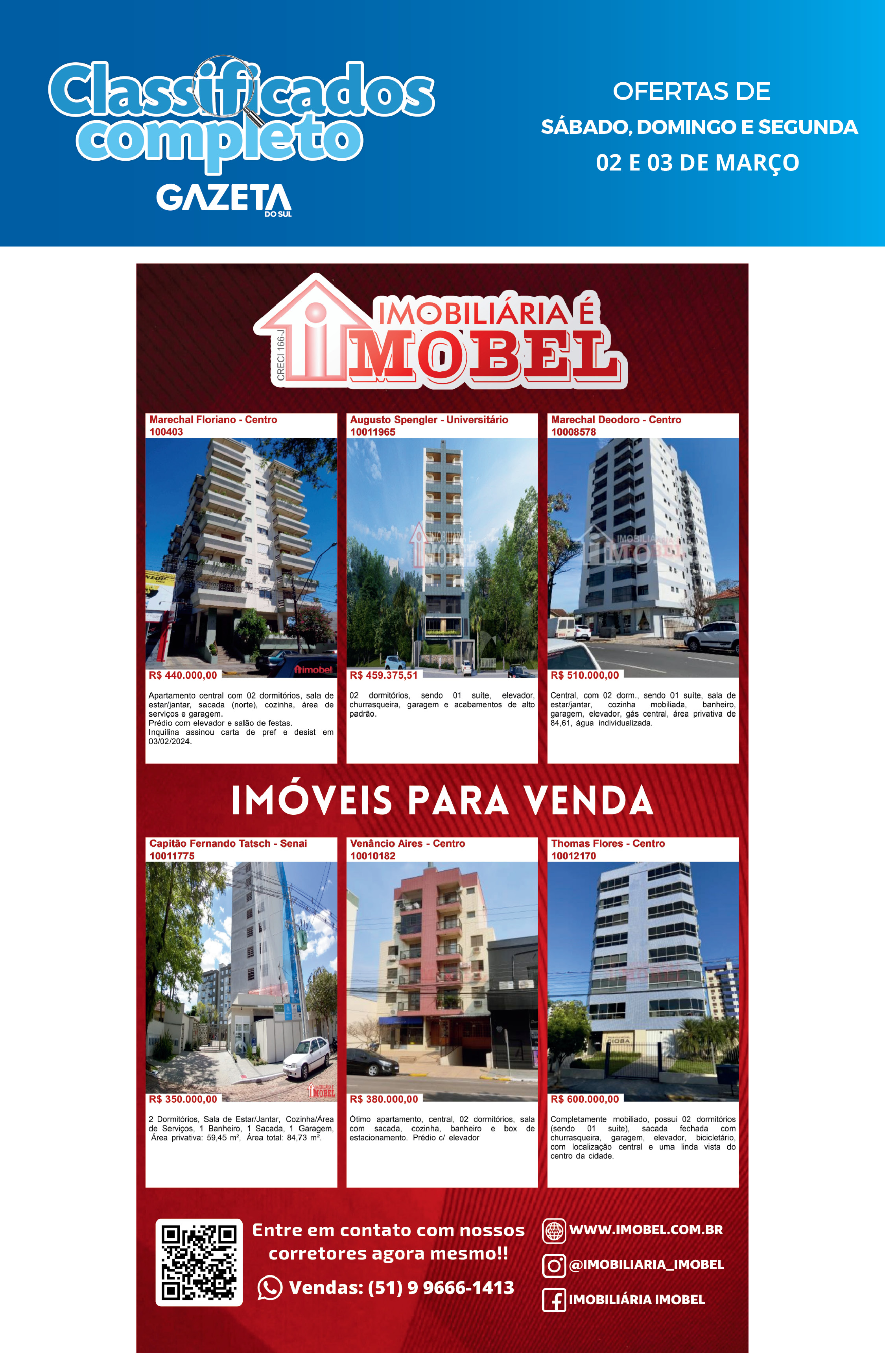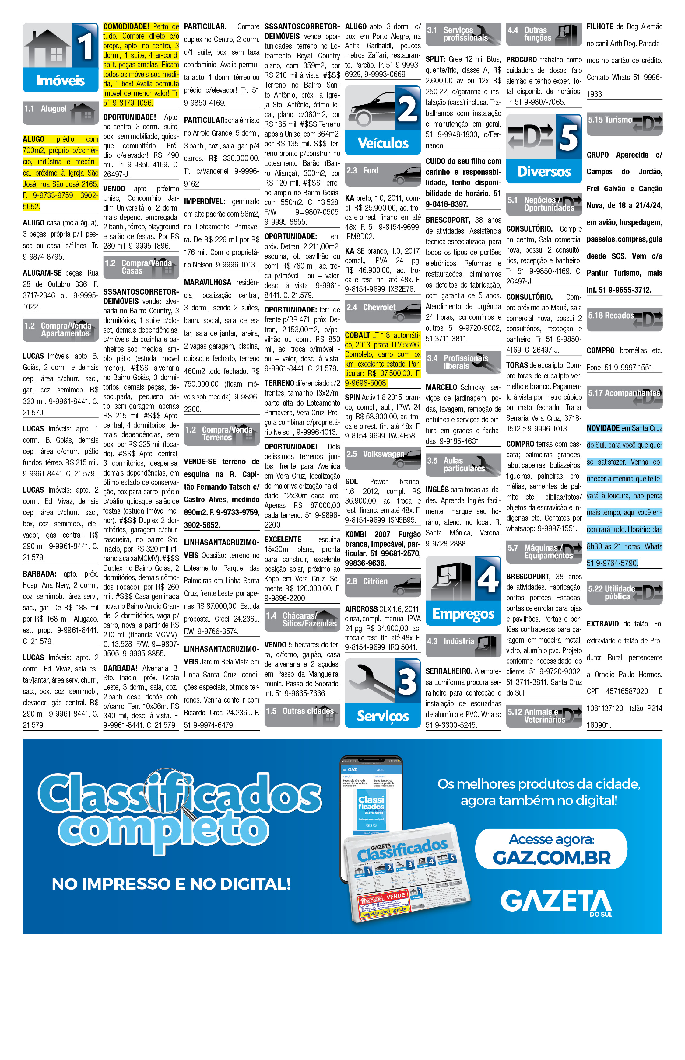 O suplemento de Classificados, que circula nas edições de terças, quintas e sábados, é um dos mais tradicionais da Gazeta do Sul, como vitrine e canal de negócios, de oferta, compra e venda em toda a região central do Rio Grande do Sul. E, para enriquecer pesquisas de produtos e serviços e possibilitar resultado ainda melhor a usuários e parceiros, nos anúncios de clientes cadastrados, o leitor tem acesso direto com link ao site do anunciante, onde poderá verificar mais detalhes sobre os itens. Confira as ofertas: