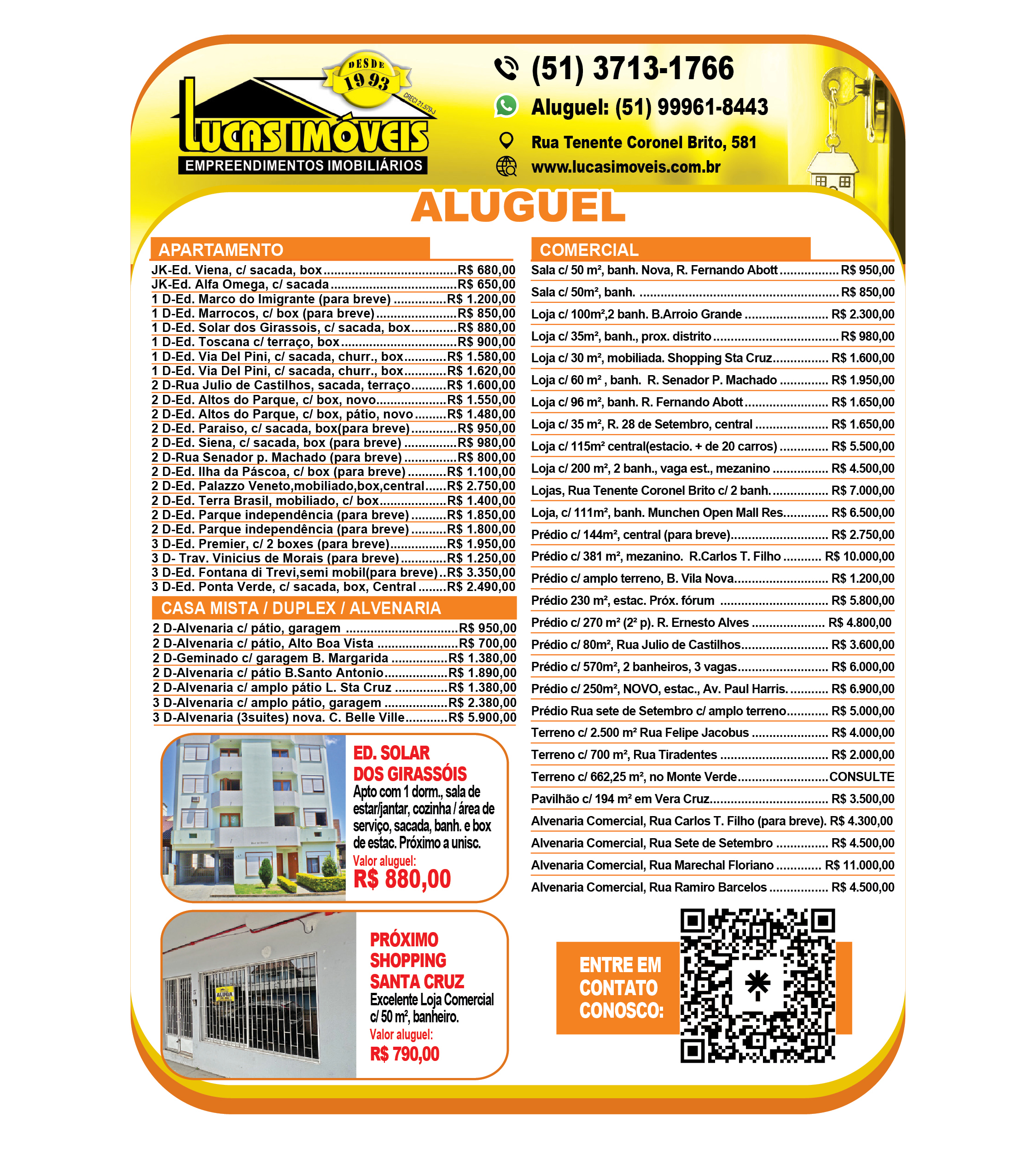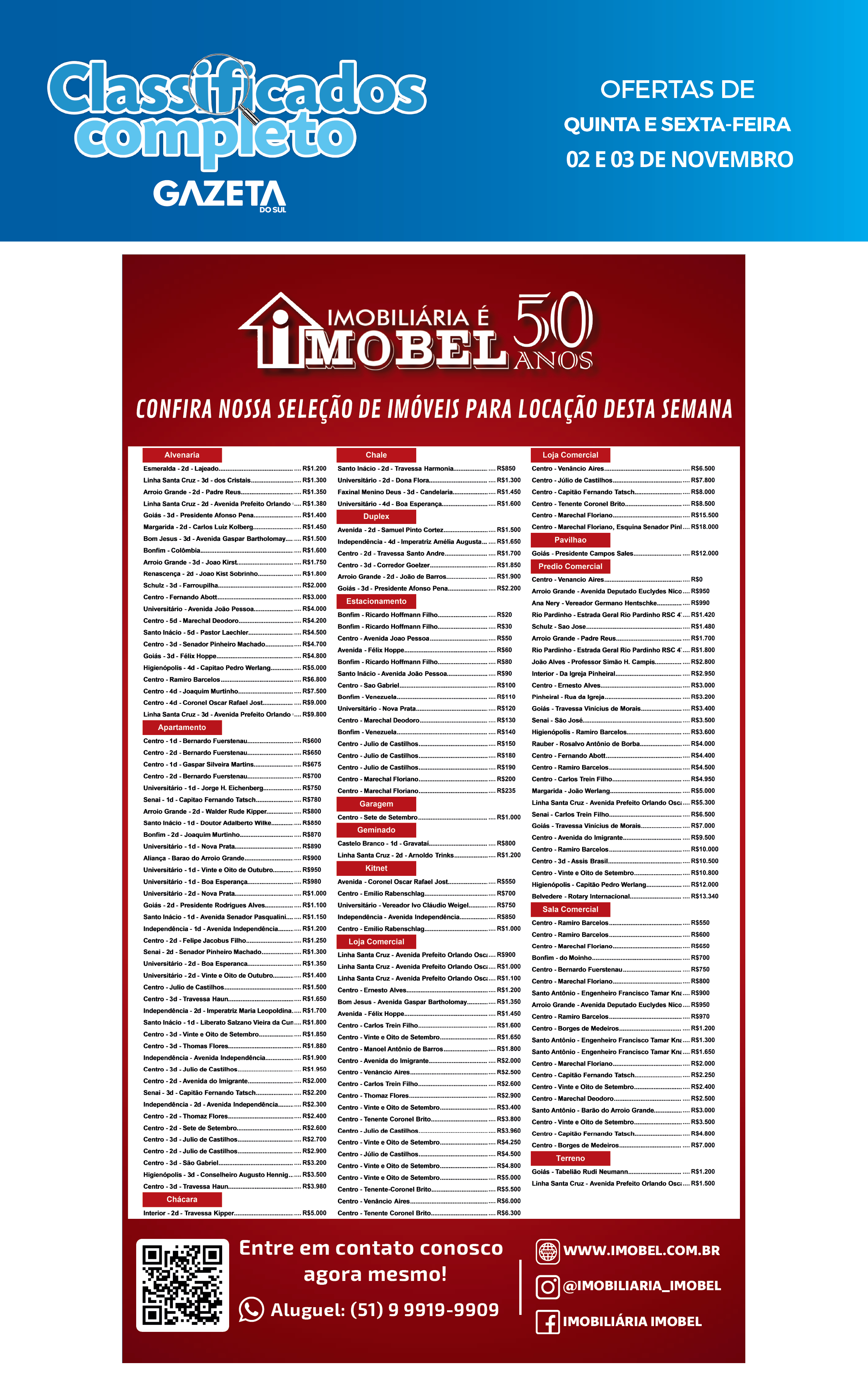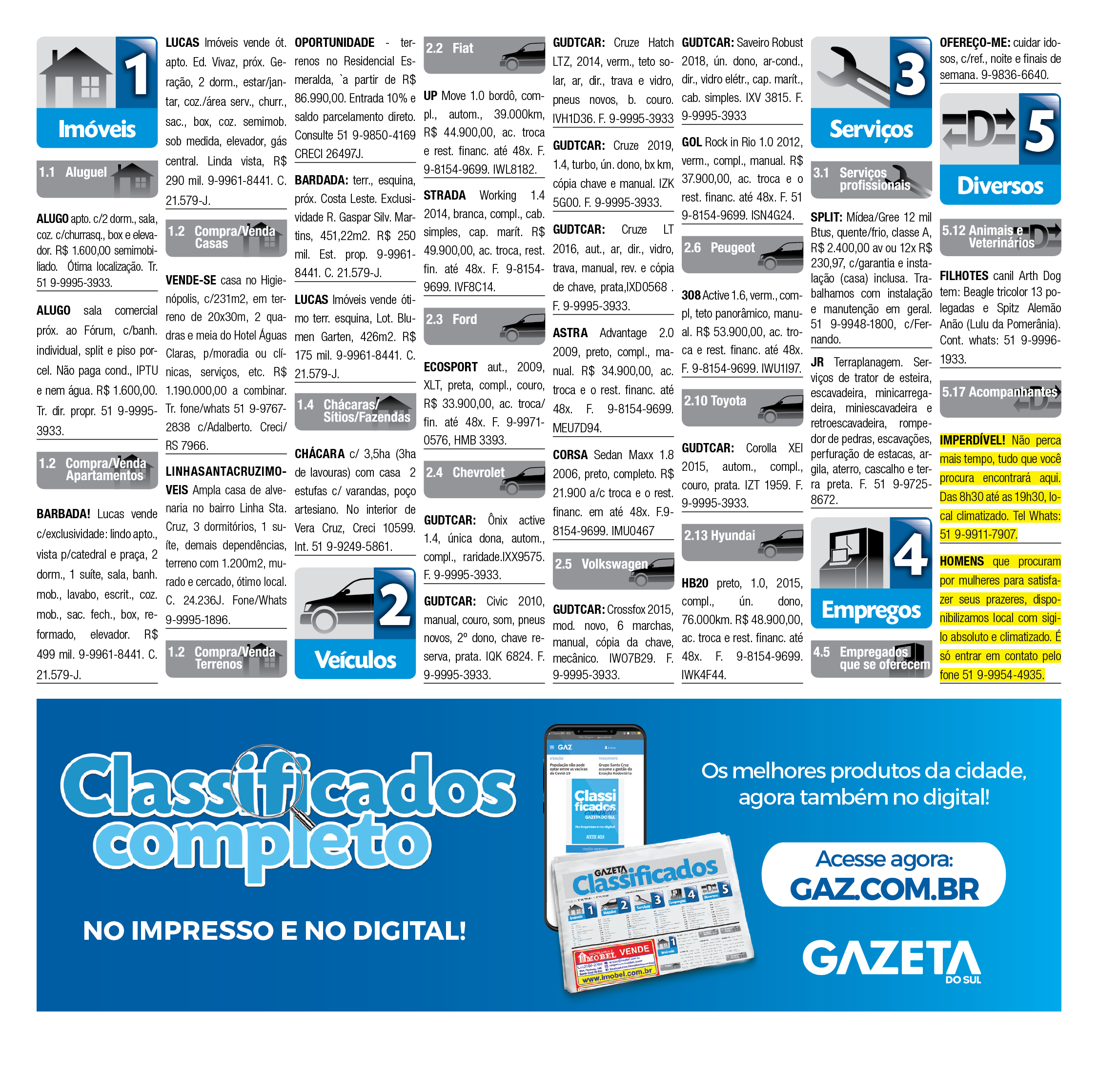 O suplemento de Classificados, que circula nas edições de terças, quintas e sábados, é um dos mais tradicionais da Gazeta do Sul, como vitrine e canal de negócios, de oferta, compra e venda em toda a região central do Rio Grande do Sul. E, para enriquecer pesquisas de produtos e serviços e possibilitar resultado ainda melhor a usuários e parceiros, nos anúncios de clientes cadastrados, o leitor tem acesso direto com link ao site do anunciante, onde poderá verificar mais detalhes sobre os itens. Confira as ofertas: