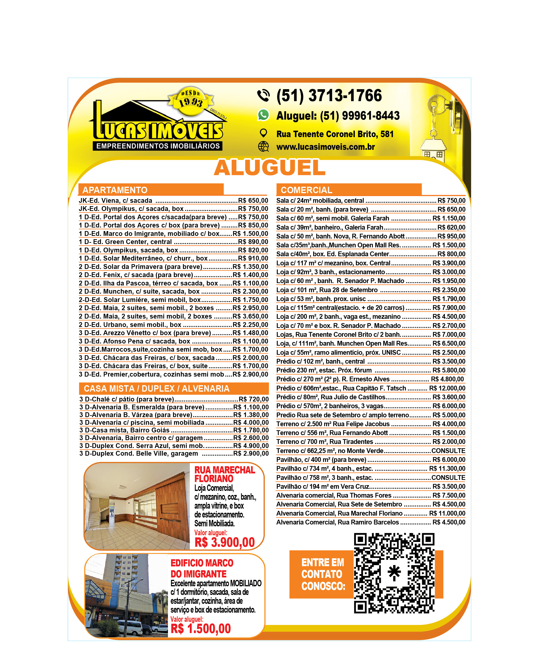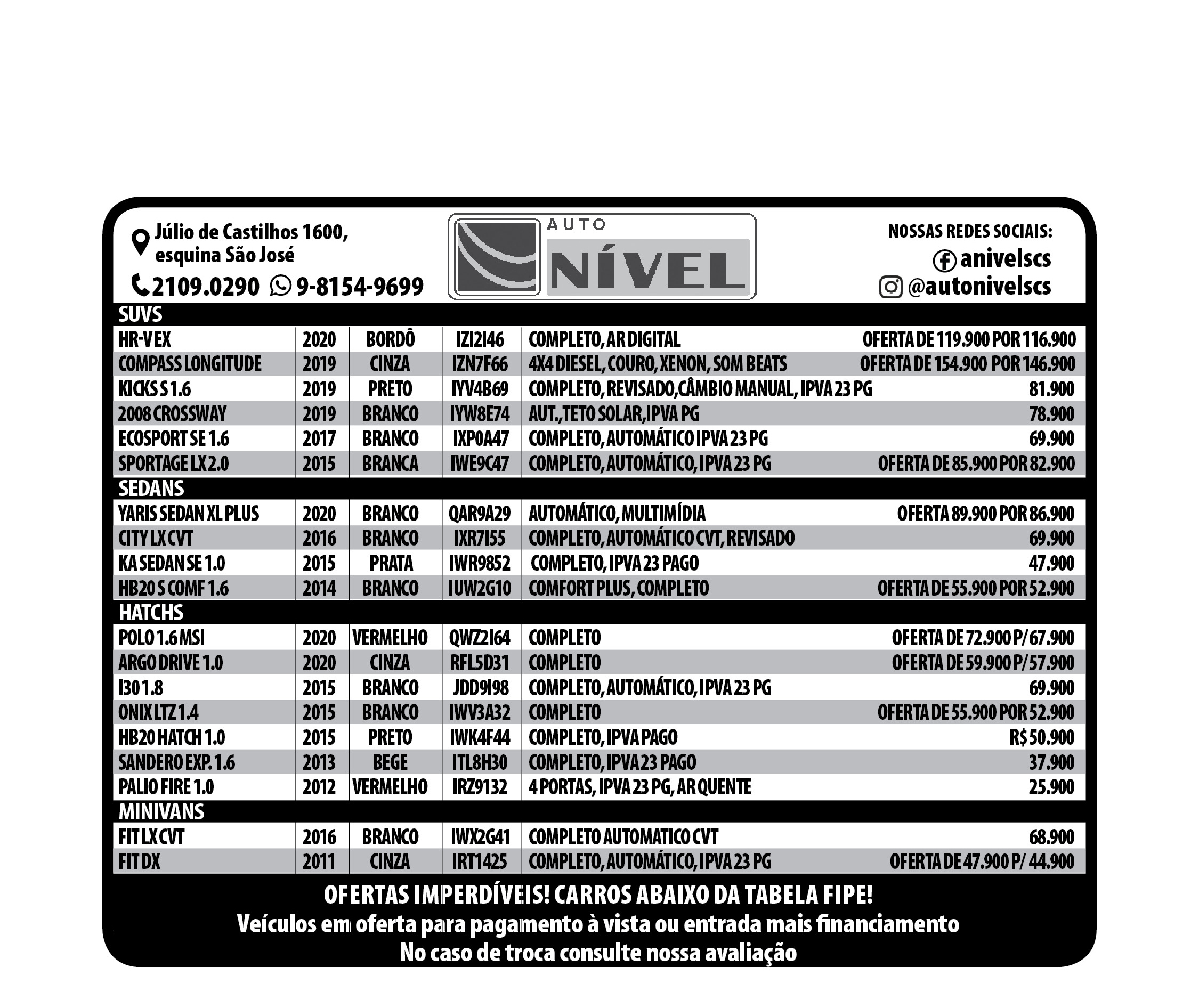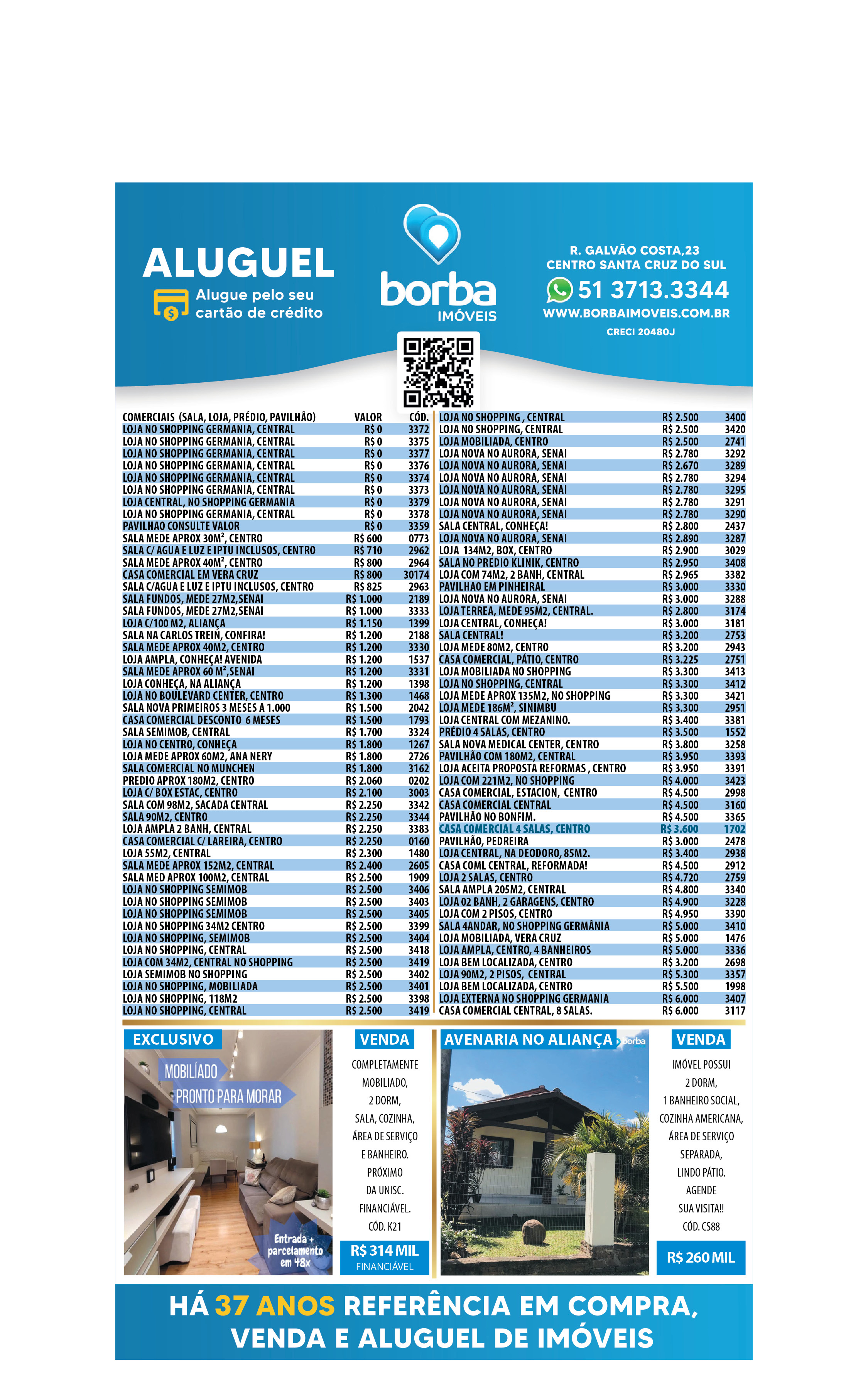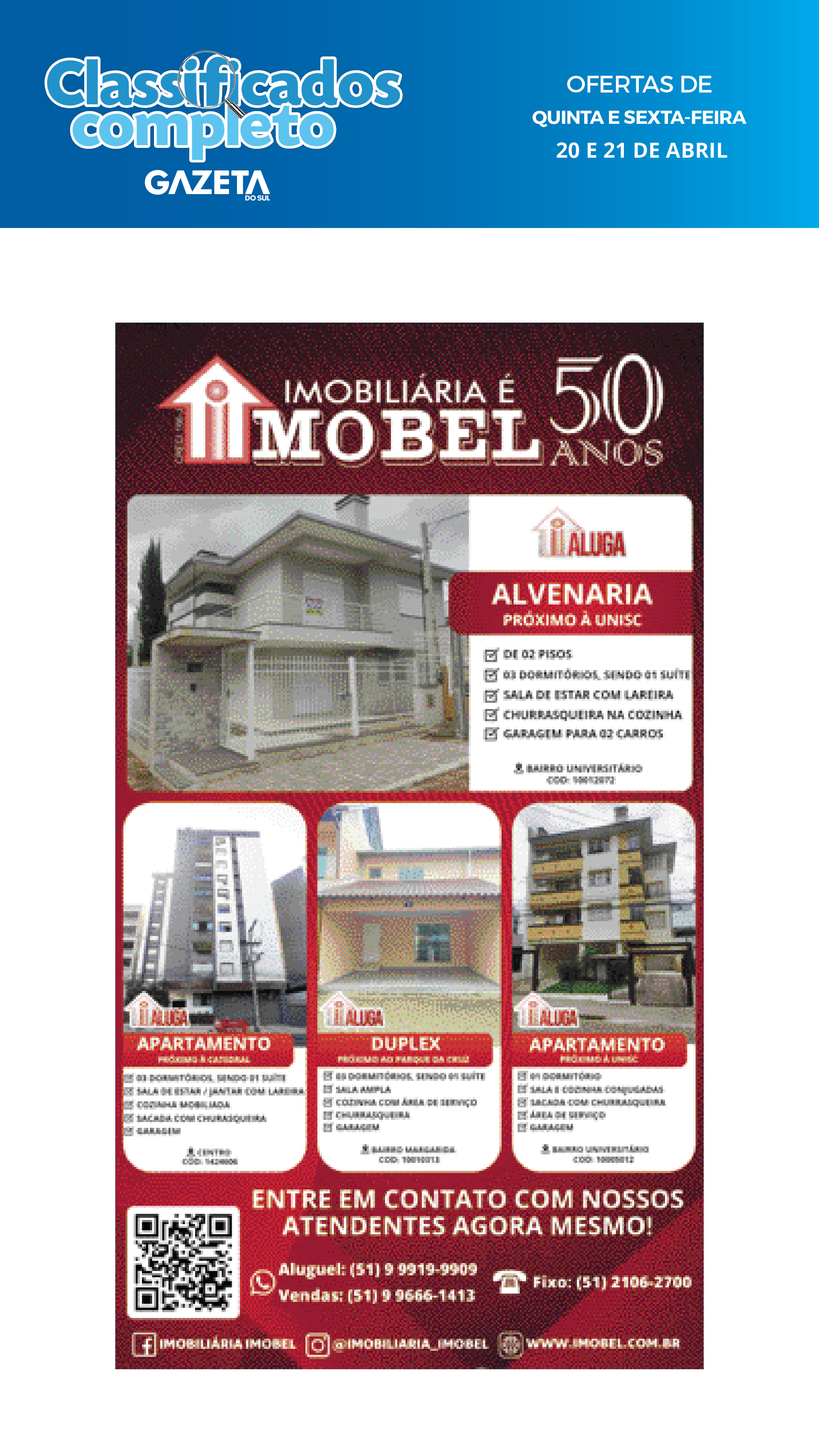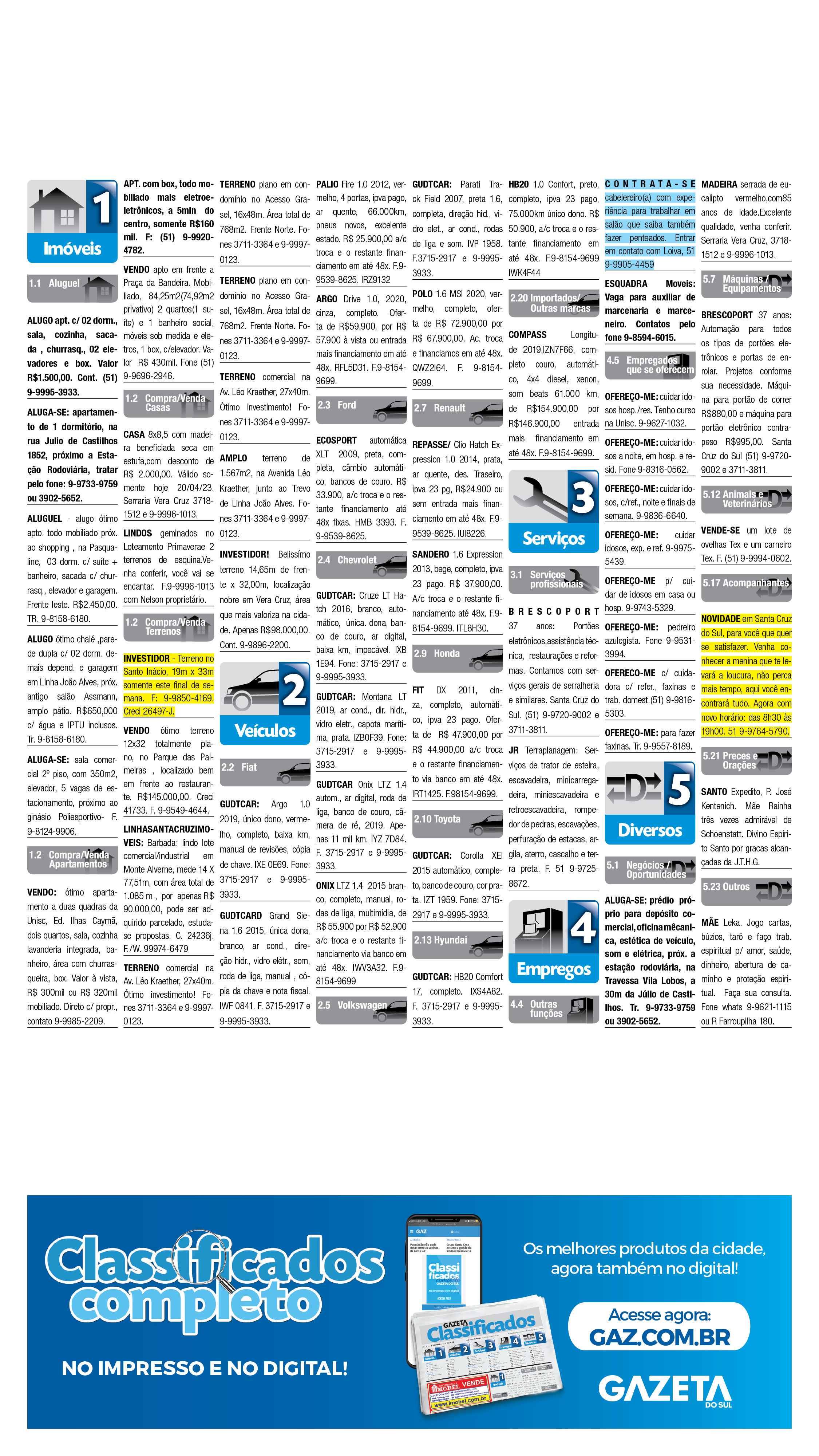 O suplemento de Classificados, que circula nas edições de terças, quintas e sábados, é um dos mais tradicionais da Gazeta do Sul, como vitrine e canal de negócios, de oferta, compra e venda em toda a região central do Rio Grande do Sul. E, para enriquecer pesquisas de produtos e serviços e possibilitar resultado ainda melhor a usuários e parceiros, nos anúncios de clientes cadastrados, o leitor tem acesso direto com link ao site do anunciante, onde poderá verificar mais detalhes sobre os itens. Confira as ofertas: