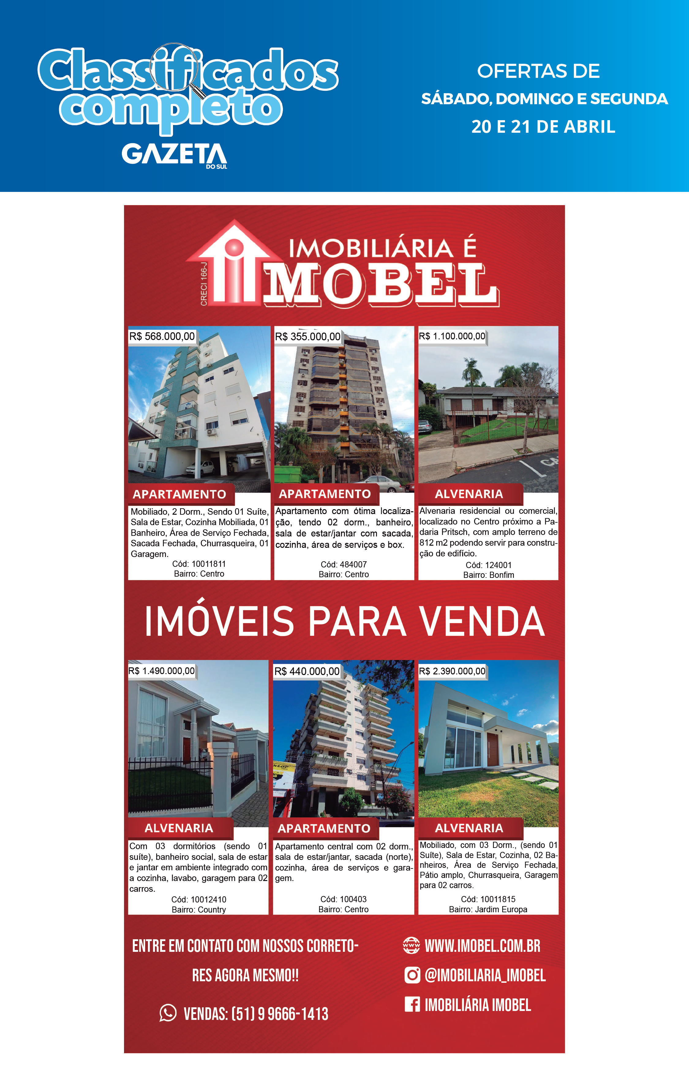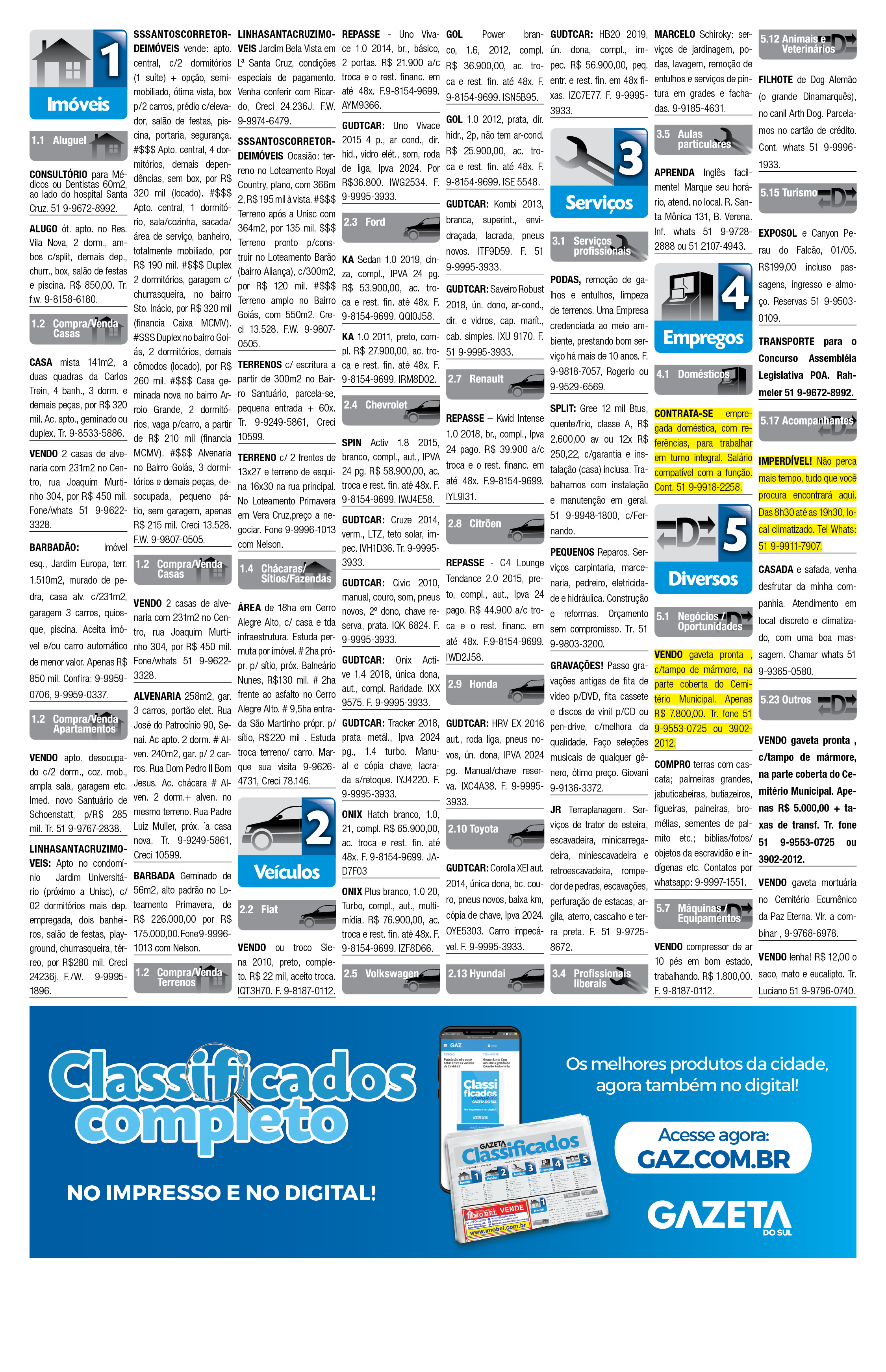 O suplemento de Classificados, que circula nas edições de terças, quintas e sábados, é um dos mais tradicionais da Gazeta do Sul, como vitrine e canal de negócios, de oferta, compra e venda em toda a região central do Rio Grande do Sul. E, para enriquecer pesquisas de produtos e serviços e possibilitar resultado ainda melhor a usuários e parceiros, nos anúncios de clientes cadastrados, o leitor tem acesso direto com link ao site do anunciante, onde poderá verificar mais detalhes sobre os itens. Confira as ofertas: