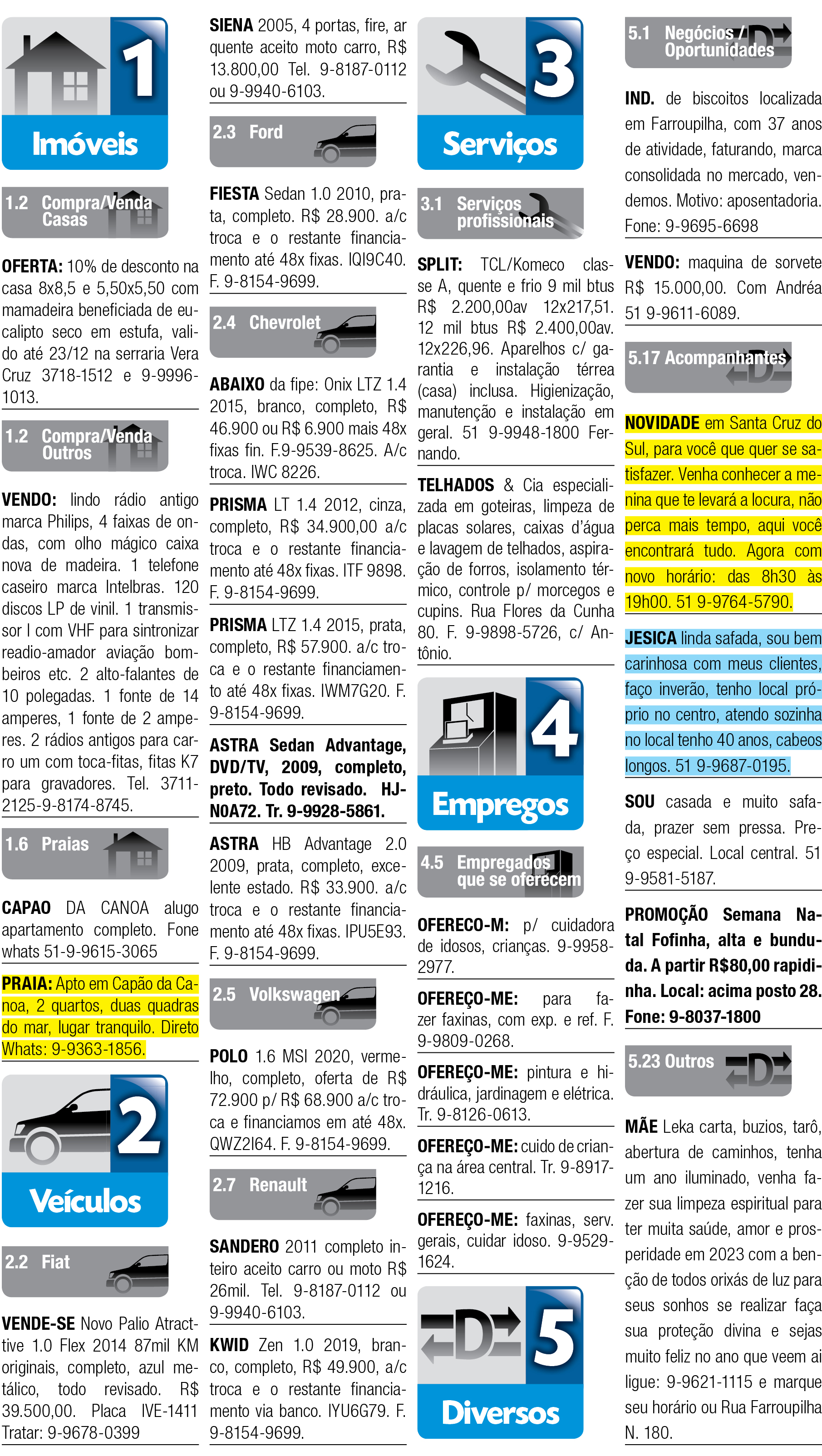 O suplemento de Classificados, que circula nas edições de terças, quintas e sábados, é um dos mais tradicionais da Gazeta do Sul, como vitrine e canal de negócios, de oferta, compra e venda em toda a região central do Rio Grande do Sul. E, para enriquecer pesquisas de produtos e serviços e possibilitar resultado ainda melhor a usuários e parceiros, nos anúncios de clientes cadastrados, o leitor tem acesso direto com link ao site do anunciante, onde poderá verificar mais detalhes sobre os itens. Confira as ofertas: