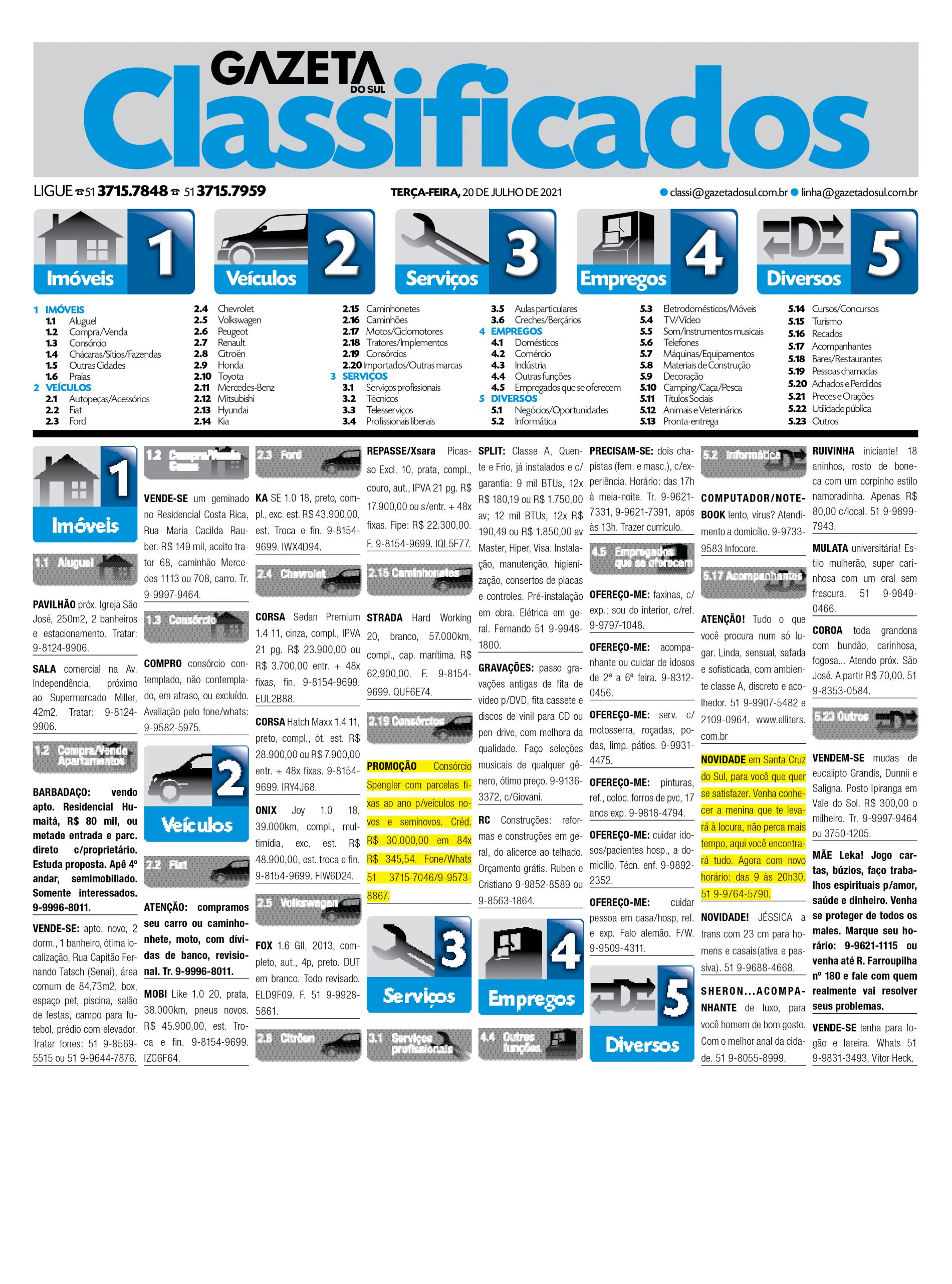 O suplemento de Classificados, que circula nas edições de terças, quintas e sábados, é um dos mais tradicionais da Gazeta do Sul, como vitrine e canal de negócios, de oferta, compra e venda em toda a região central do Rio Grande do Sul. E, para enriquecer pesquisas de produtos e serviços e possibilitar resultado ainda melhor a usuários e parceiros, nos anúncios de clientes cadastrados, o leitor tem acesso direto com link ao site do anunciante, onde poderá verificar mais detalhes sobre os itens. Confira: