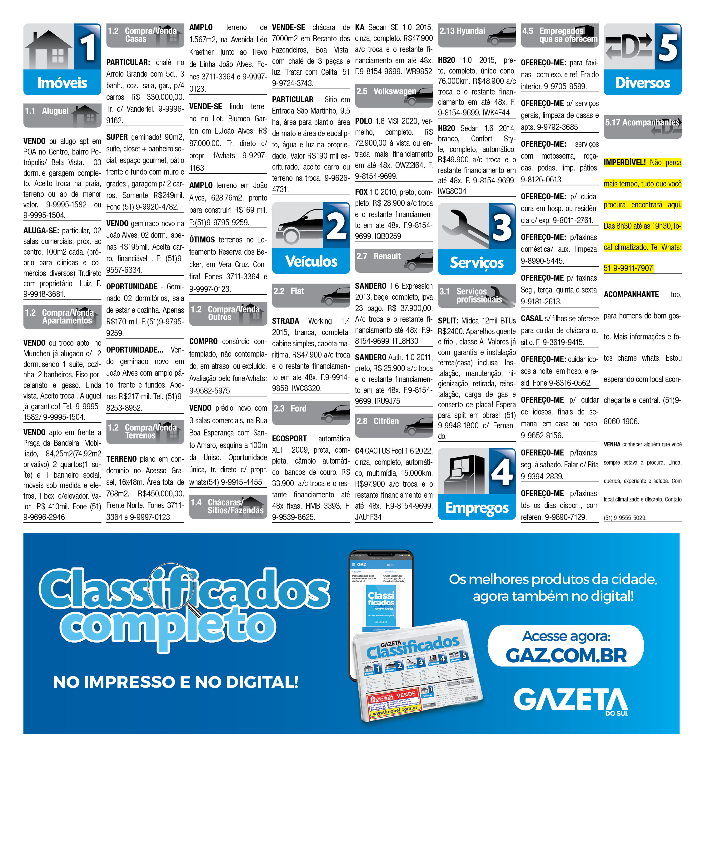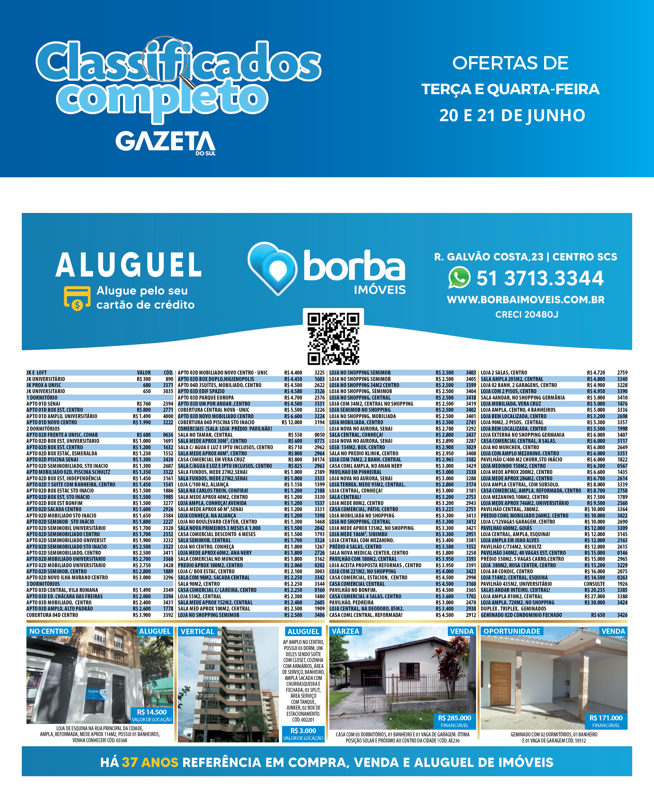 O suplemento de Classificados, que circula nas edições de terças, quintas e sábados, é um dos mais tradicionais da Gazeta do Sul, como vitrine e canal de negócios, de oferta, compra e venda em toda a região central do Rio Grande do Sul. E, para enriquecer pesquisas de produtos e serviços e possibilitar resultado ainda melhor a usuários e parceiros, nos anúncios de clientes cadastrados, o leitor tem acesso direto com link ao site do anunciante, onde poderá verificar mais detalhes sobre os itens. Confira as ofertas: