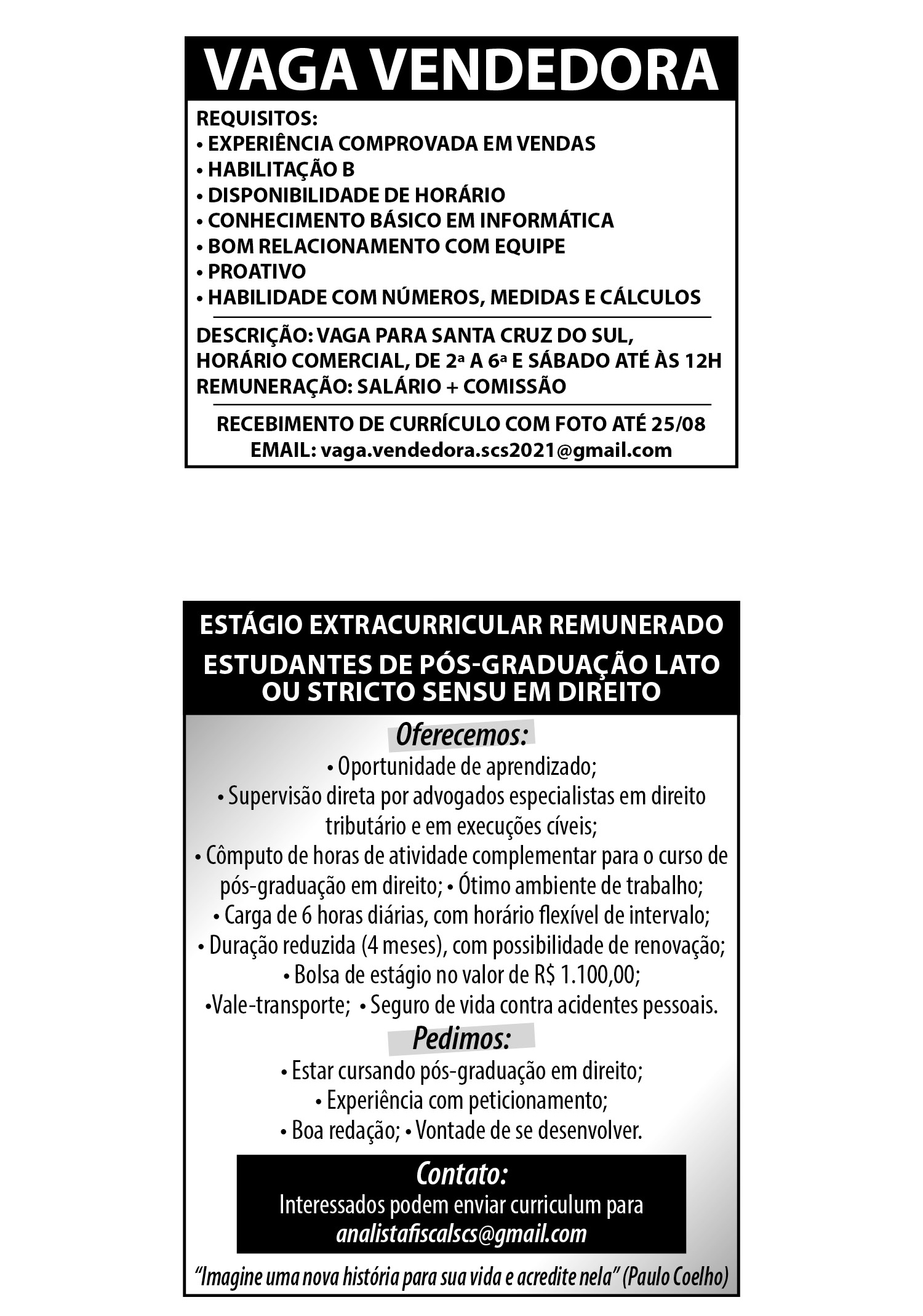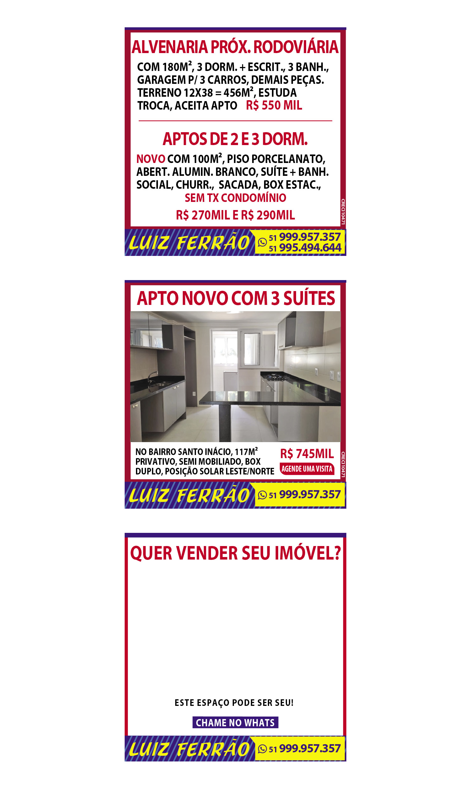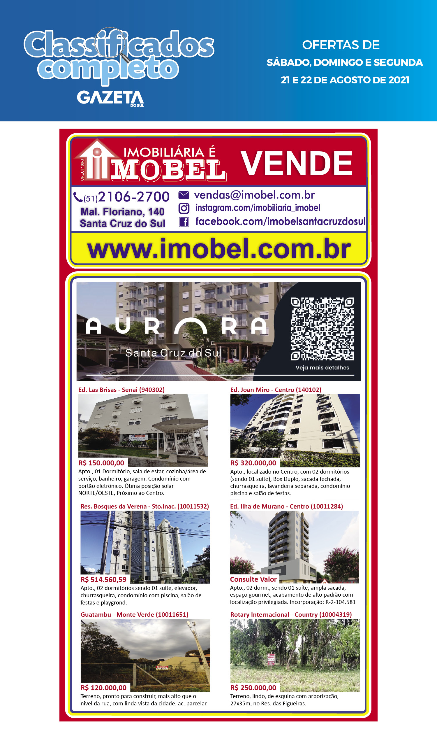 O suplemento de Classificados, que circula nas edições de terças, quintas e sábados, é um dos mais tradicionais da Gazeta do Sul, como vitrine e canal de negócios, de oferta, compra e venda em toda a região central do Rio Grande do Sul. E, para enriquecer pesquisas de produtos e serviços e possibilitar resultado ainda melhor a usuários e parceiros, nos anúncios de clientes cadastrados, o leitor tem acesso direto com link ao site do anunciante, onde poderá verificar mais detalhes sobre os itens. Confira: