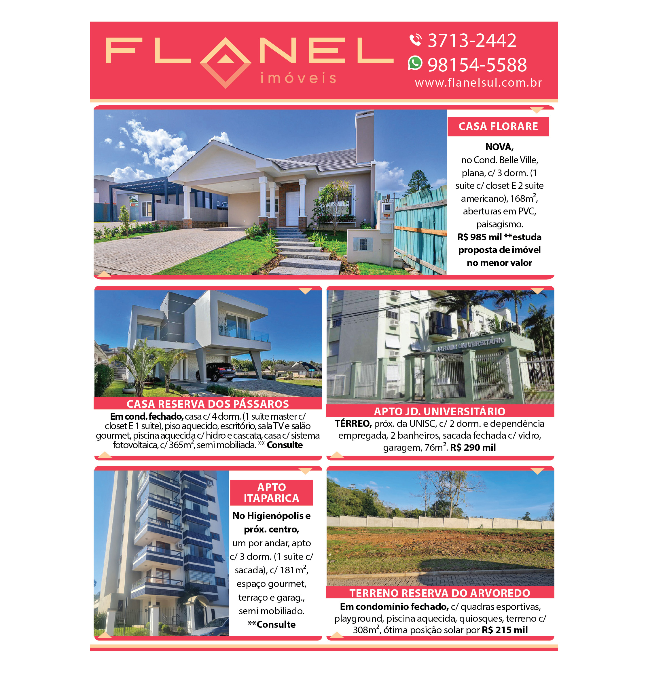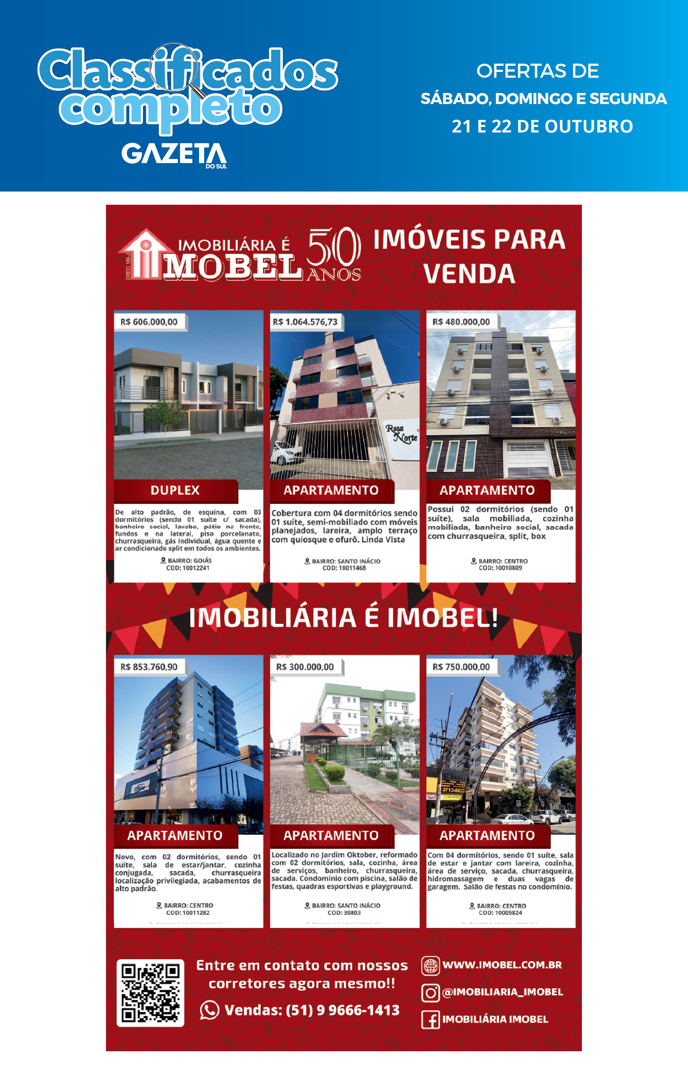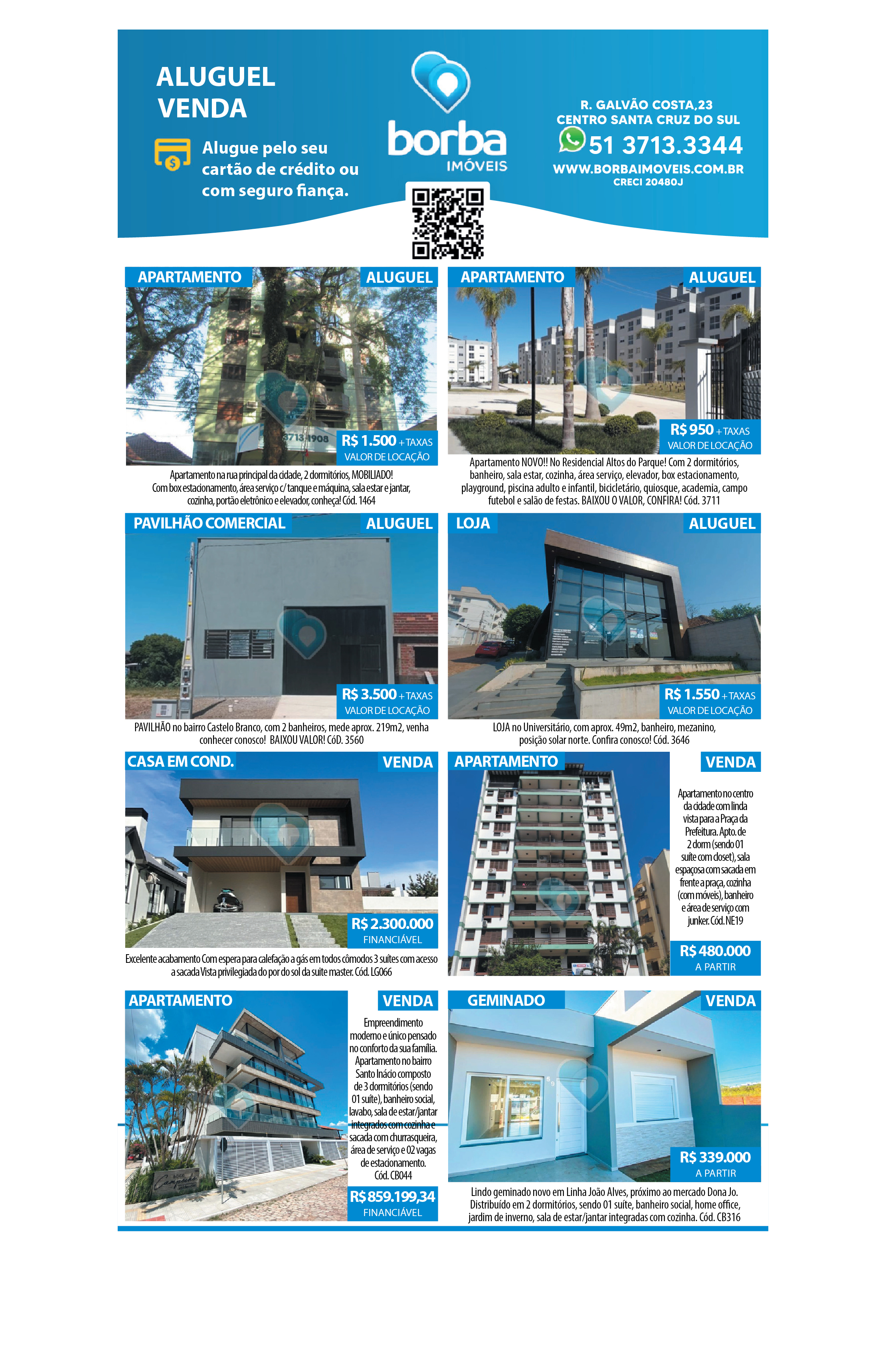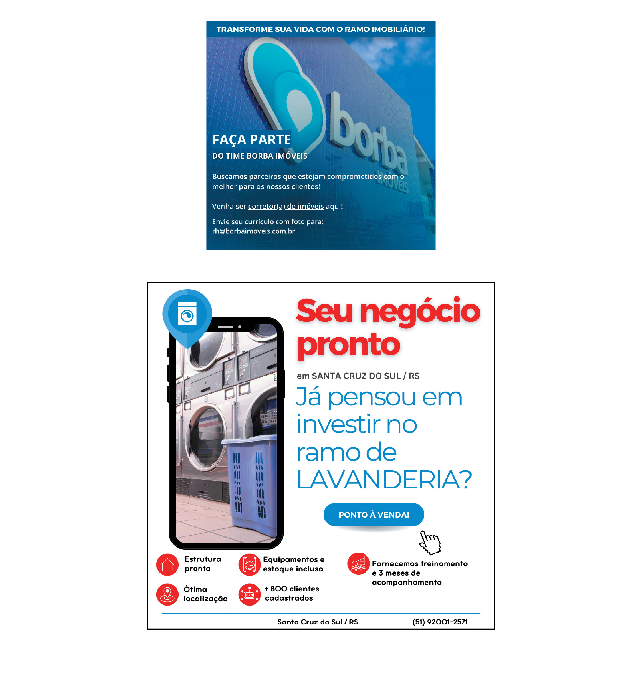 O suplemento de Classificados, que circula nas edições de terças, quintas e sábados, é um dos mais tradicionais da Gazeta do Sul, como vitrine e canal de negócios, de oferta, compra e venda em toda a região central do Rio Grande do Sul. E, para enriquecer pesquisas de produtos e serviços e possibilitar resultado ainda melhor a usuários e parceiros, nos anúncios de clientes cadastrados, o leitor tem acesso direto com link ao site do anunciante, onde poderá verificar mais detalhes sobre os itens. Confira as ofertas:
