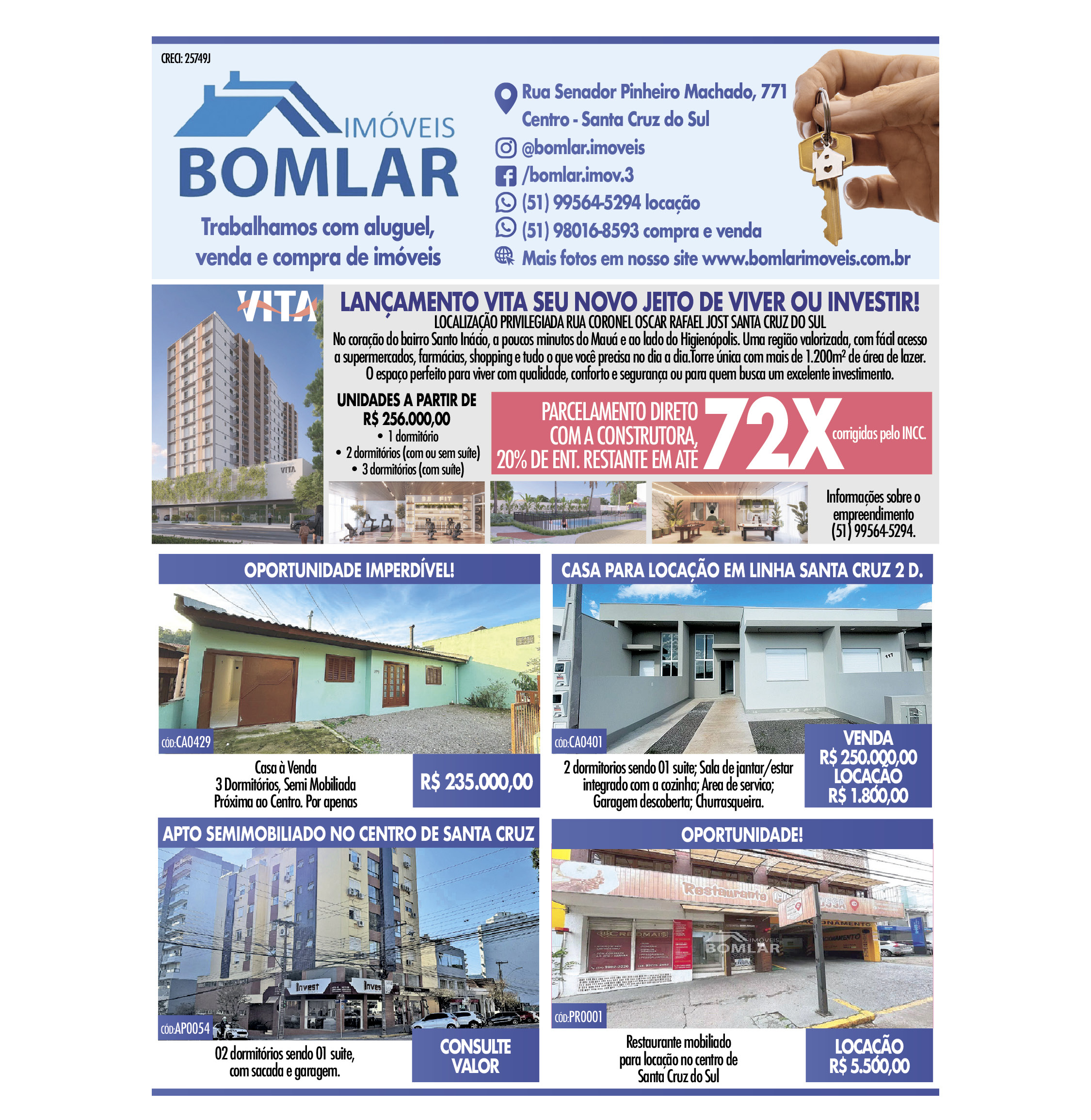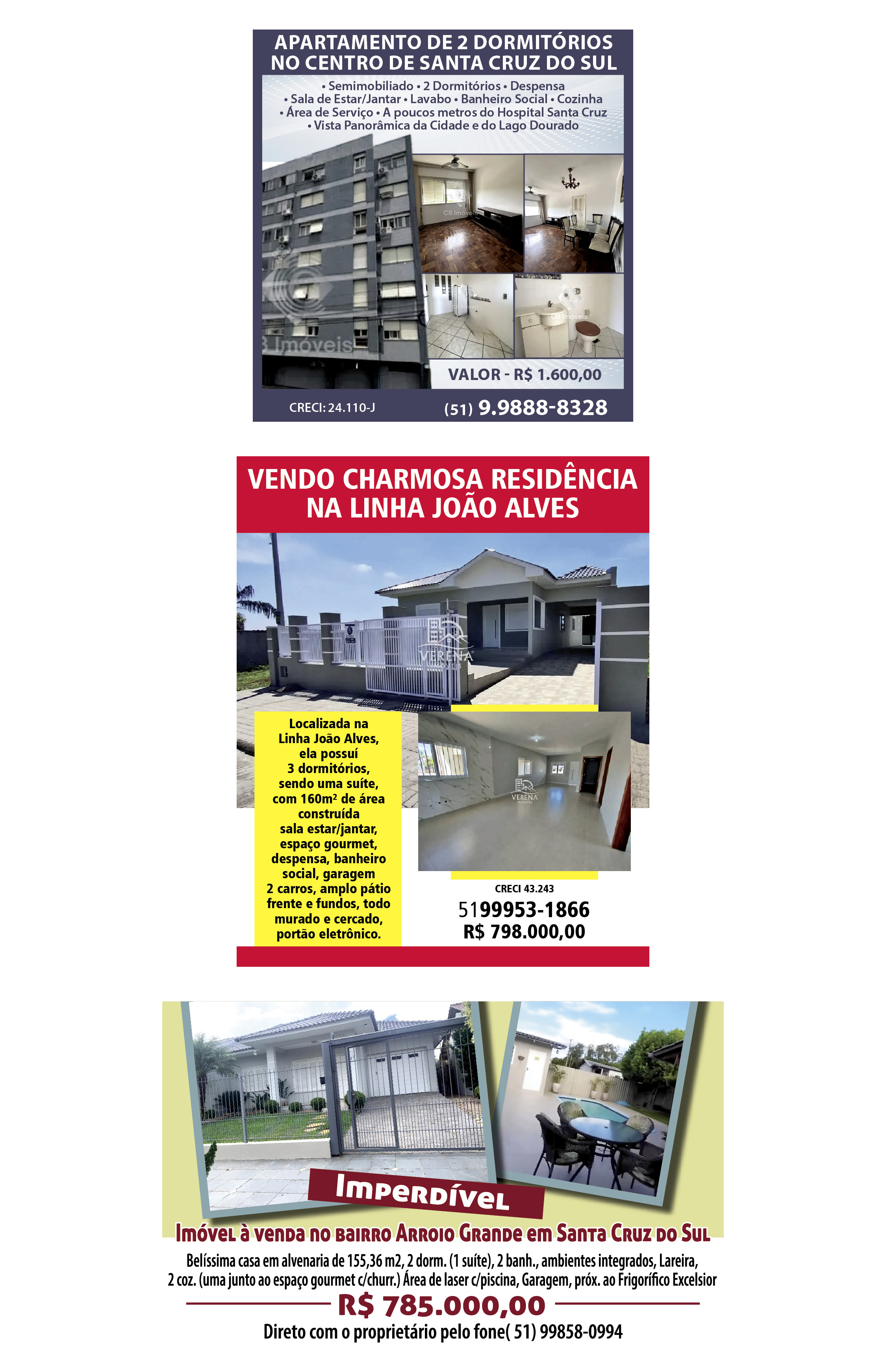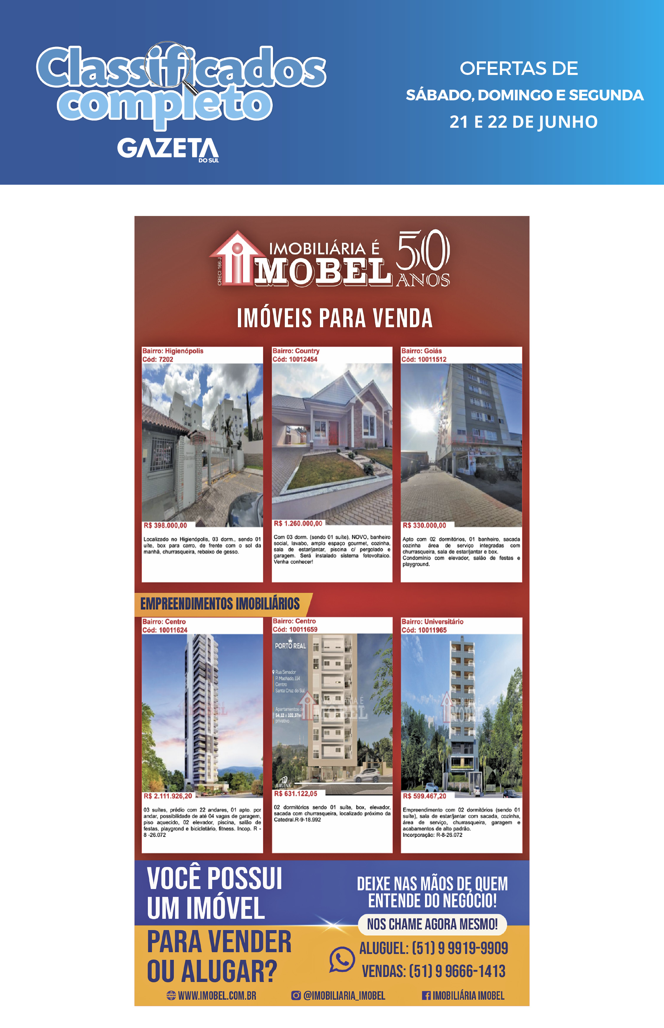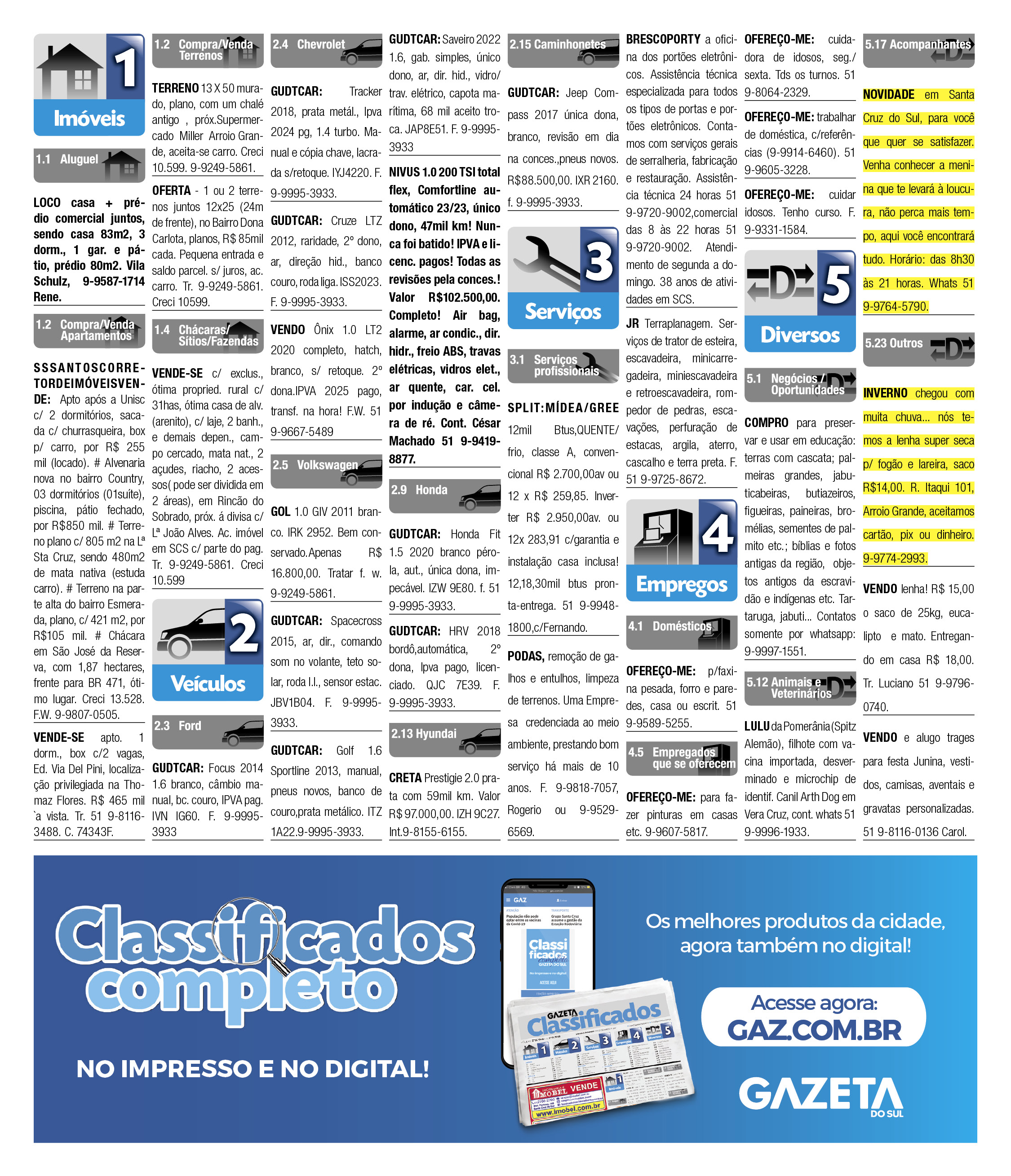 O suplemento de Classificados, que circula nas edições de terças, quintas e sábados, é um dos mais tradicionais da Gazeta do Sul, como vitrine e canal de negócios, de oferta, compra e venda em toda a região central do Rio Grande do Sul. E, para enriquecer pesquisas de produtos e serviços e possibilitar resultado ainda melhor a usuários e parceiros, nos anúncios de clientes cadastrados, o leitor tem acesso direto com link ao site do anunciante, onde poderá verificar mais detalhes sobre os itens. Confira as ofertas: