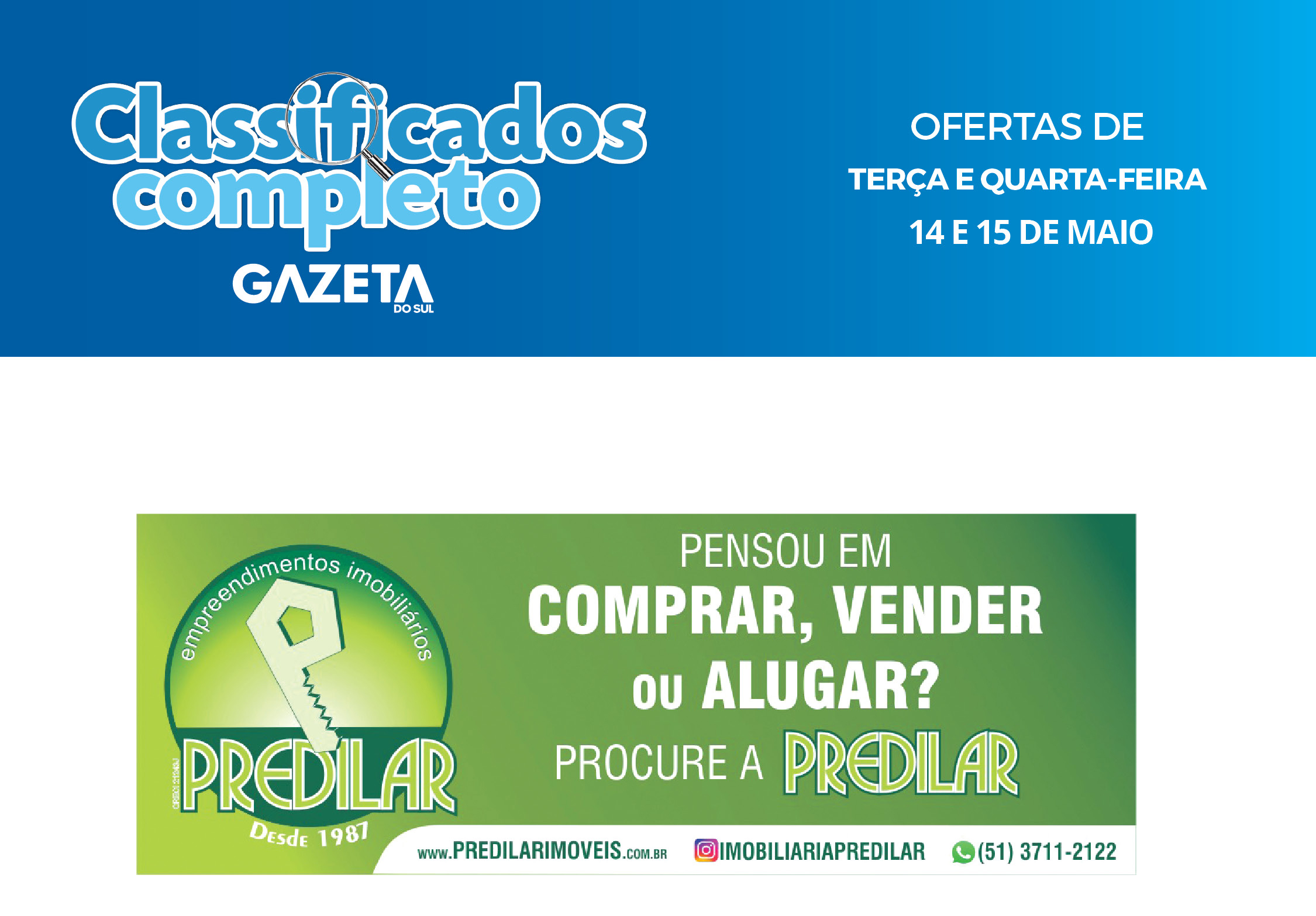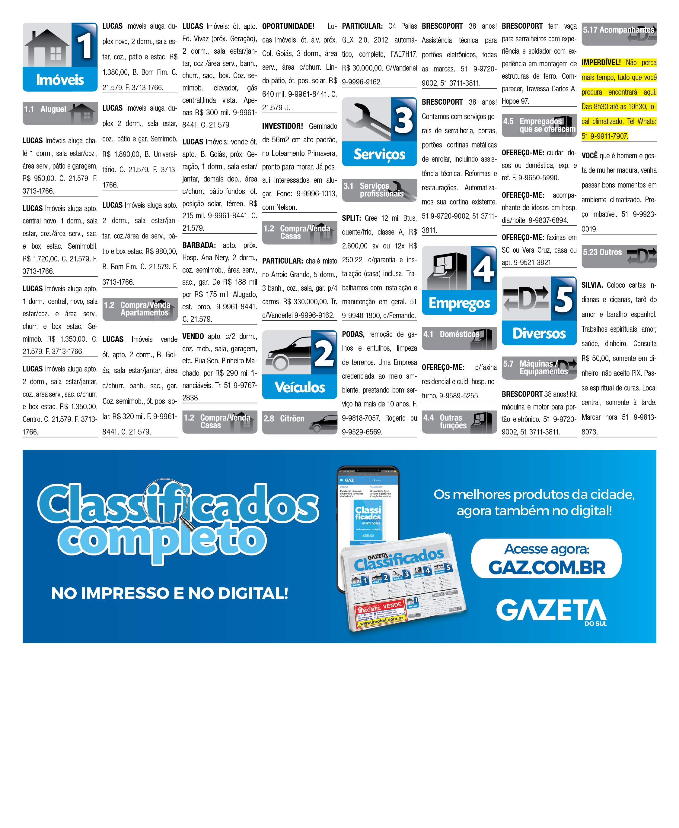 O suplemento de Classificados, que circula nas edições de terças, quintas e sábados, é um dos mais tradicionais da Gazeta do Sul, como vitrine e canal de negócios, de oferta, compra e venda em toda a região central do Rio Grande do Sul. E, para enriquecer pesquisas de produtos e serviços e possibilitar resultado ainda melhor a usuários e parceiros, nos anúncios de clientes cadastrados, o leitor tem acesso direto com link ao site do anunciante, onde poderá verificar mais detalhes sobre os itens. Confira as ofertas:
