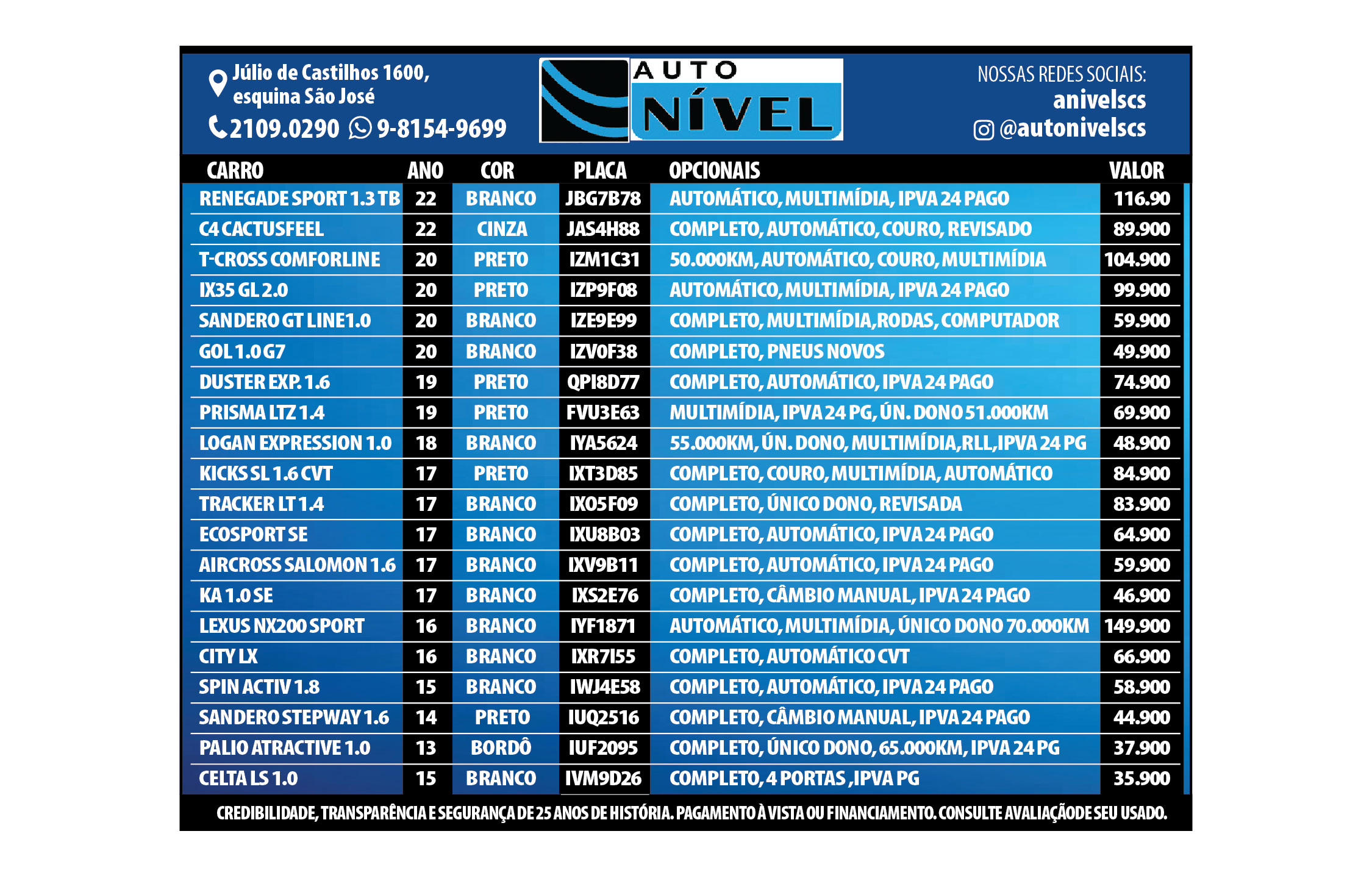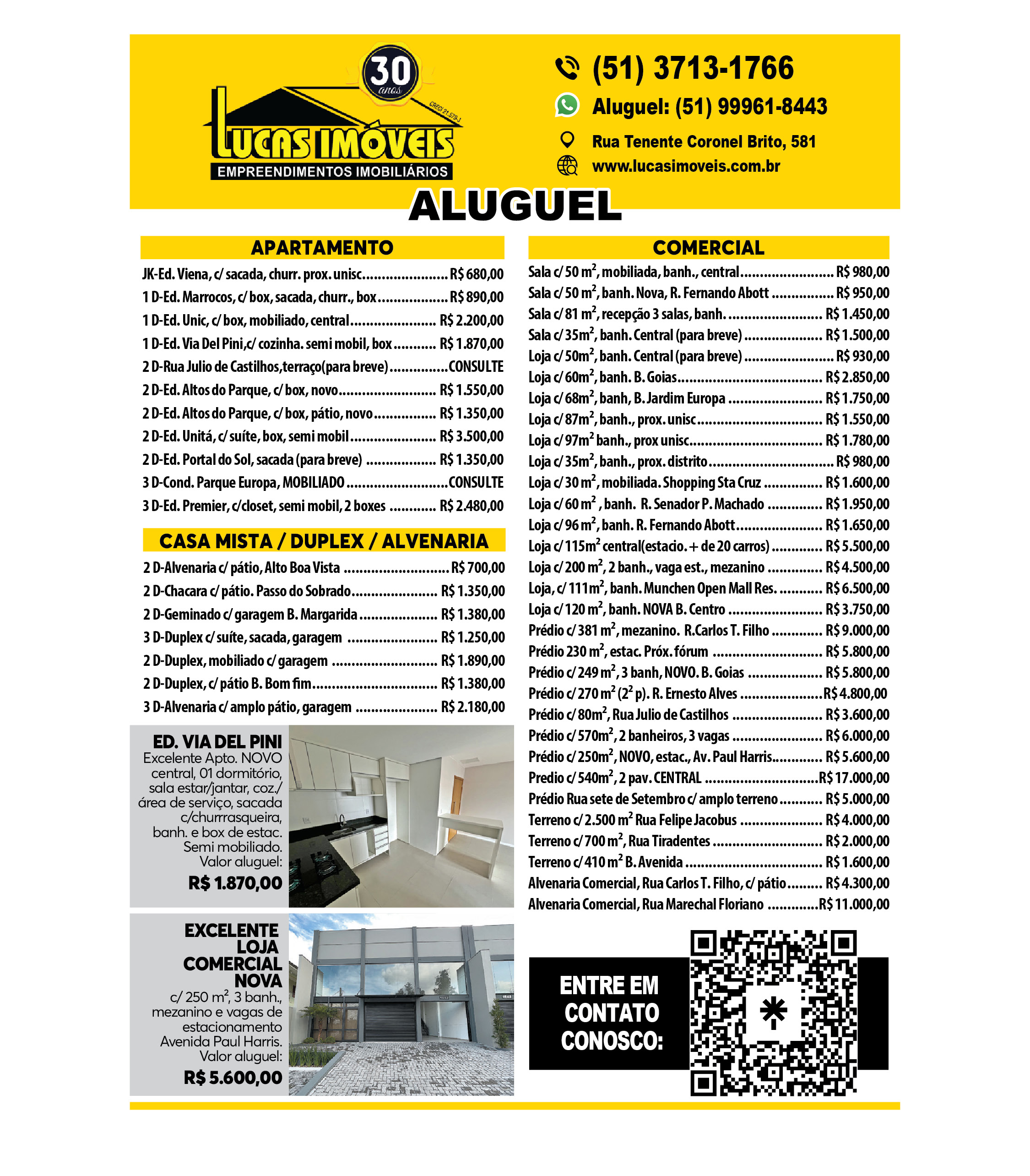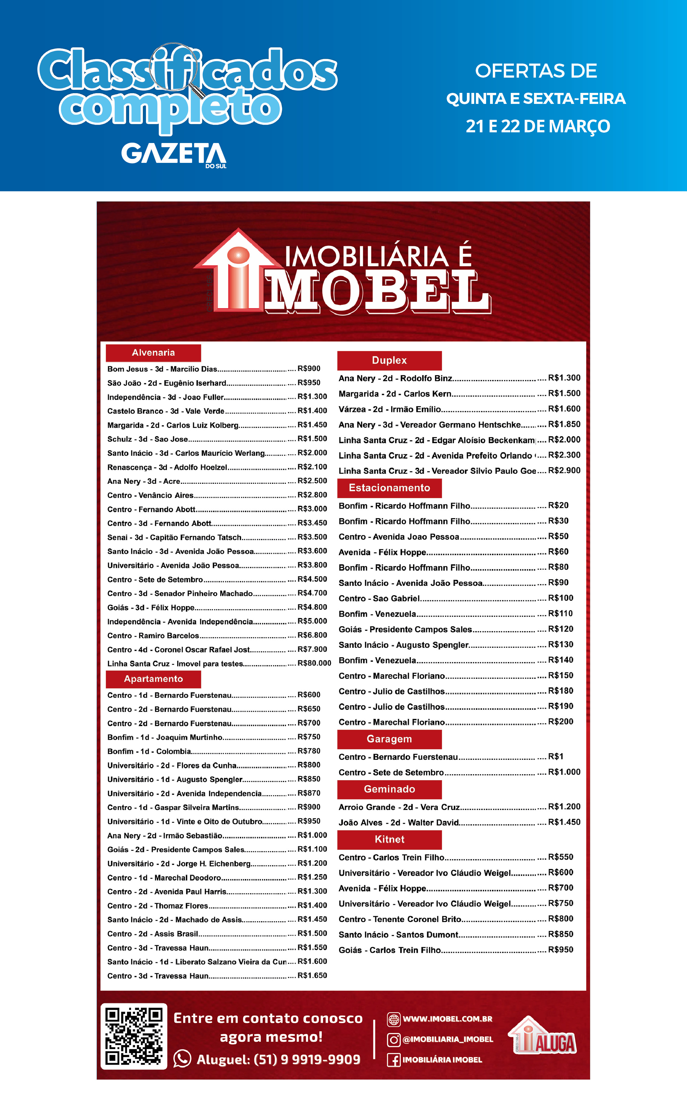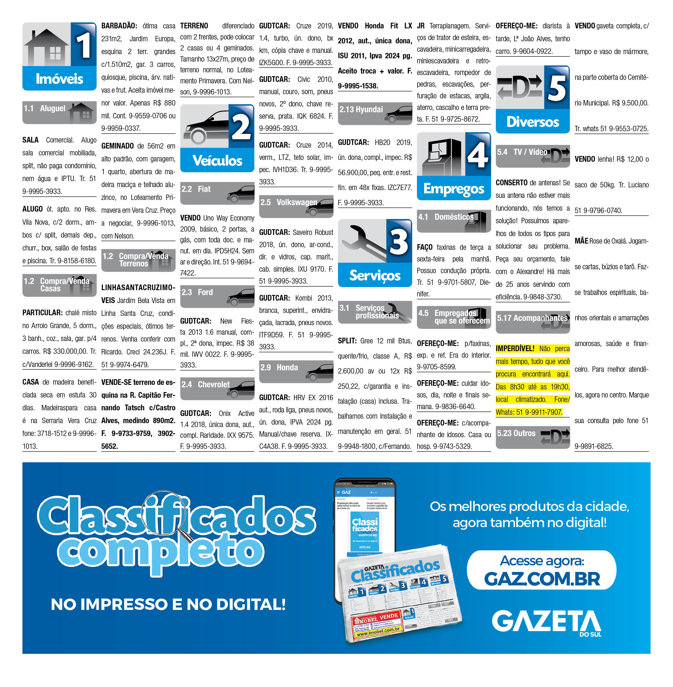 O suplemento de Classificados, que circula nas edições de terças, quintas e sábados, é um dos mais tradicionais da Gazeta do Sul, como vitrine e canal de negócios, de oferta, compra e venda em toda a região central do Rio Grande do Sul. E, para enriquecer pesquisas de produtos e serviços e possibilitar resultado ainda melhor a usuários e parceiros, nos anúncios de clientes cadastrados, o leitor tem acesso direto com link ao site do anunciante, onde poderá verificar mais detalhes sobre os itens. Confira as ofertas: