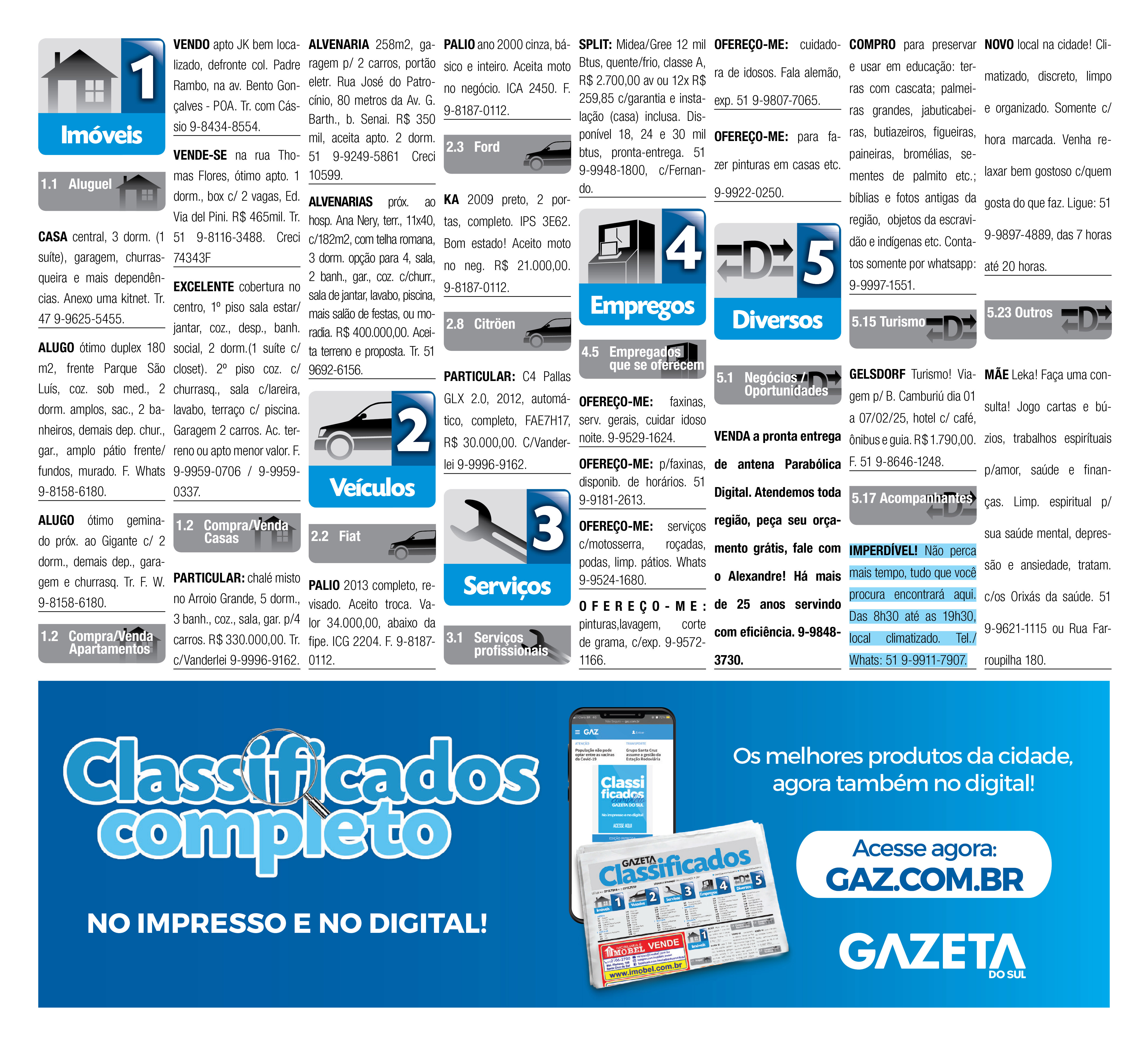 O suplemento de Classificados, que circula nas edições de terças, quintas e sábados, é um dos mais tradicionais da Gazeta do Sul, como vitrine e canal de negócios, de oferta, compra e venda em toda a região central do Rio Grande do Sul. E, para enriquecer pesquisas de produtos e serviços e possibilitar resultado ainda melhor a usuários e parceiros, nos anúncios de clientes cadastrados, o leitor tem acesso direto com link ao site do anunciante, onde poderá verificar mais detalhes sobre os itens. Confira as ofertas: