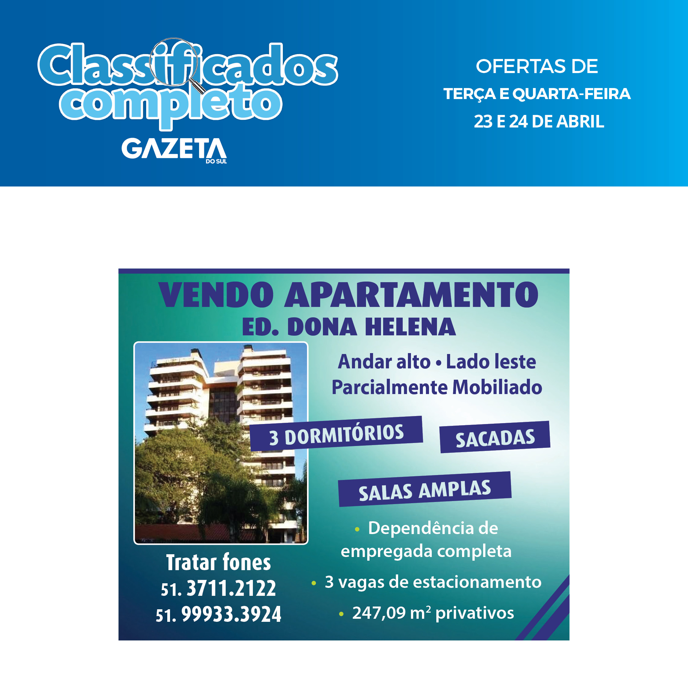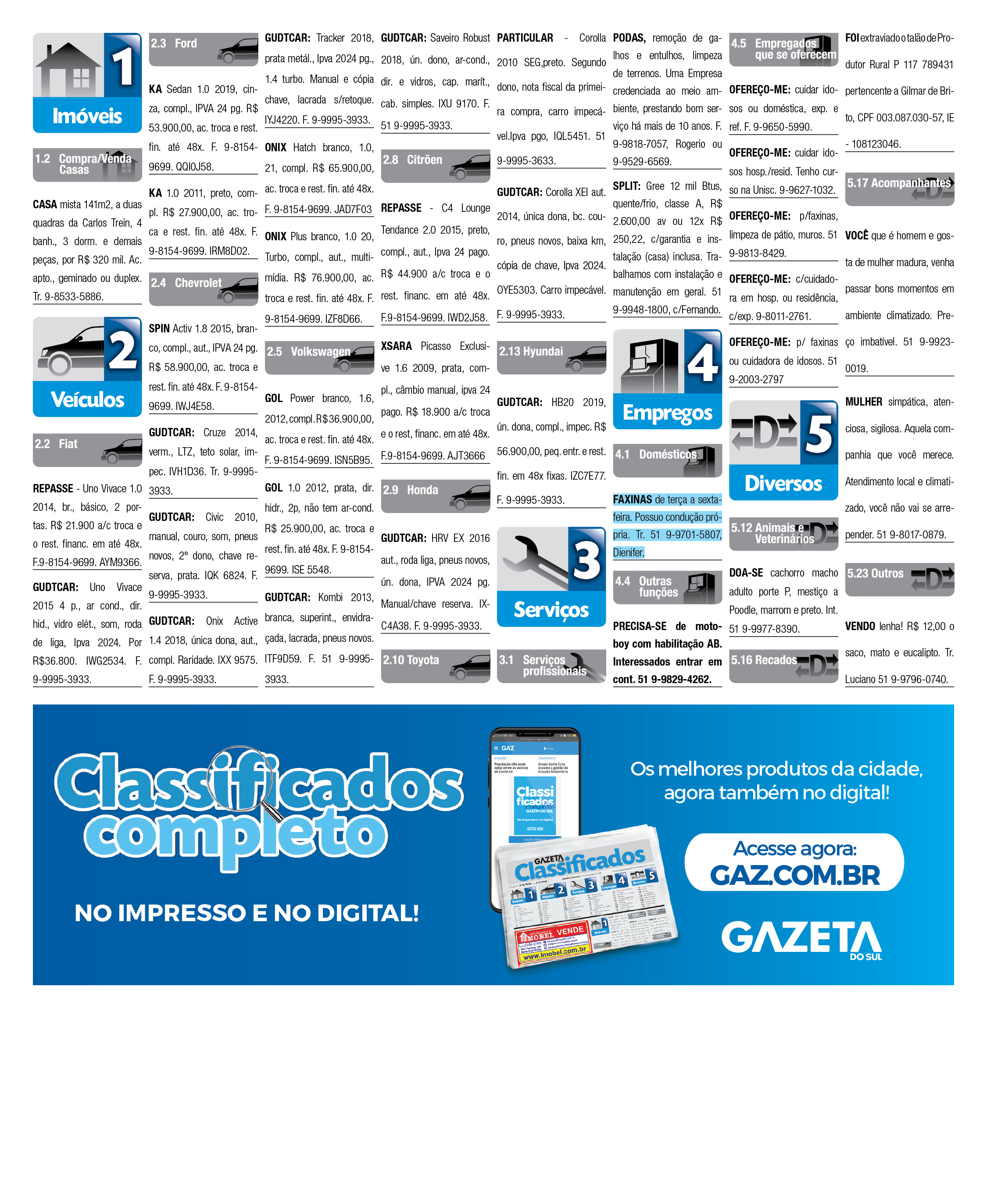 O suplemento de Classificados, que circula nas edições de terças, quintas e sábados, é um dos mais tradicionais da Gazeta do Sul, como vitrine e canal de negócios, de oferta, compra e venda em toda a região central do Rio Grande do Sul. E, para enriquecer pesquisas de produtos e serviços e possibilitar resultado ainda melhor a usuários e parceiros, nos anúncios de clientes cadastrados, o leitor tem acesso direto com link ao site do anunciante, onde poderá verificar mais detalhes sobre os itens. Confira as ofertas: