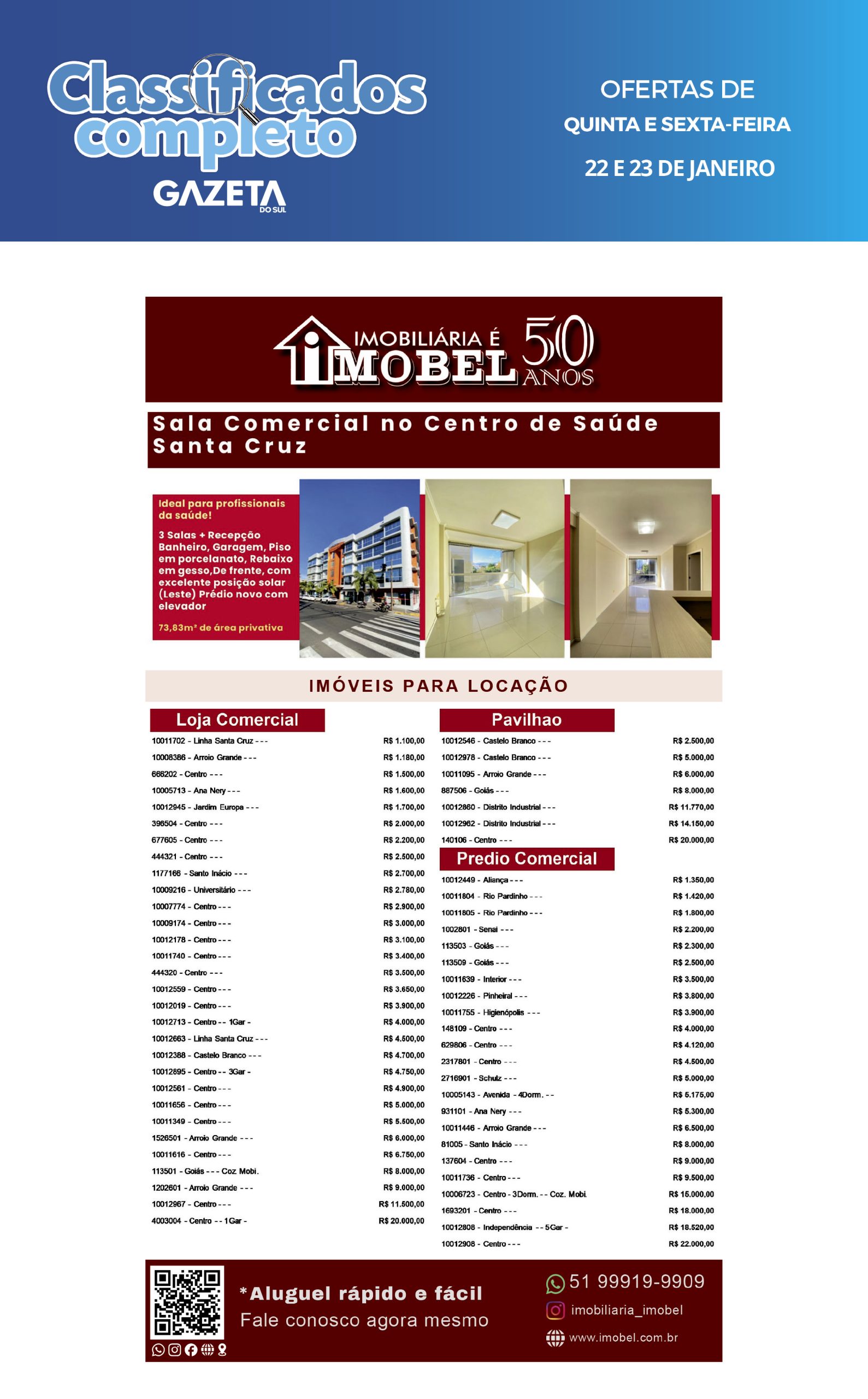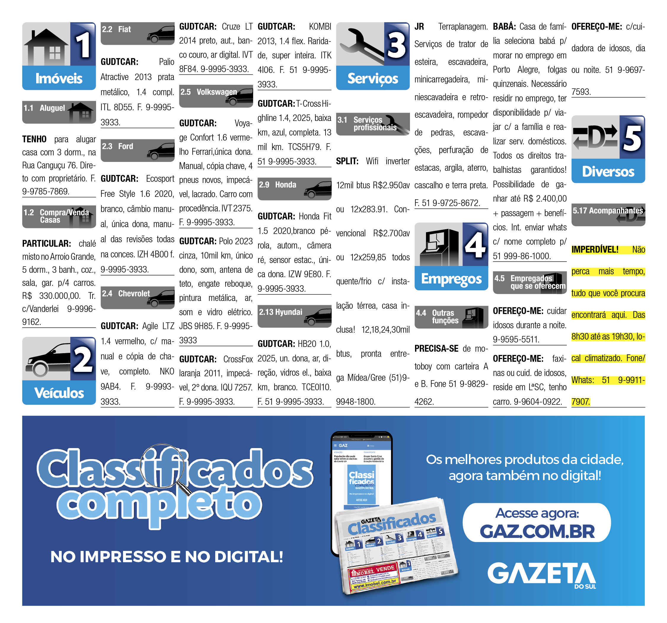 O suplemento de Classificados, que circula nas edições de terças, quintas e sábados, é um dos mais tradicionais da Gazeta do Sul, como vitrine e canal de negócios, de oferta, compra e venda em toda a região central do Rio Grande do Sul. E, para enriquecer pesquisas de produtos e serviços e possibilitar resultado ainda melhor a usuários e parceiros, nos anúncios de clientes cadastrados, o leitor tem acesso direto com link ao site do anunciante, onde poderá verificar mais detalhes sobre os itens. Confira as ofertas: