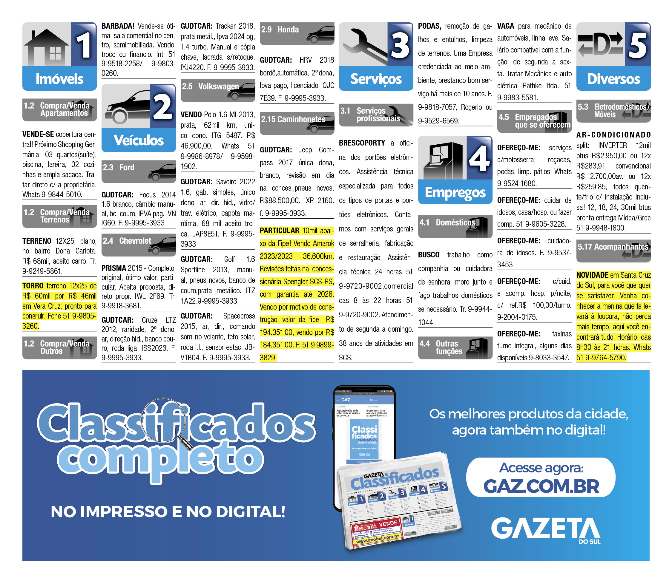 O suplemento de Classificados, que circula nas edições de terças, quintas e sábados, é um dos mais tradicionais da Gazeta do Sul, como vitrine e canal de negócios, de oferta, compra e venda em toda a região central do Rio Grande do Sul. E, para enriquecer pesquisas de produtos e serviços e possibilitar resultado ainda melhor a usuários e parceiros, nos anúncios de clientes cadastrados, o leitor tem acesso direto com link ao site do anunciante, onde poderá verificar mais detalhes sobre os itens. Confira as ofertas: