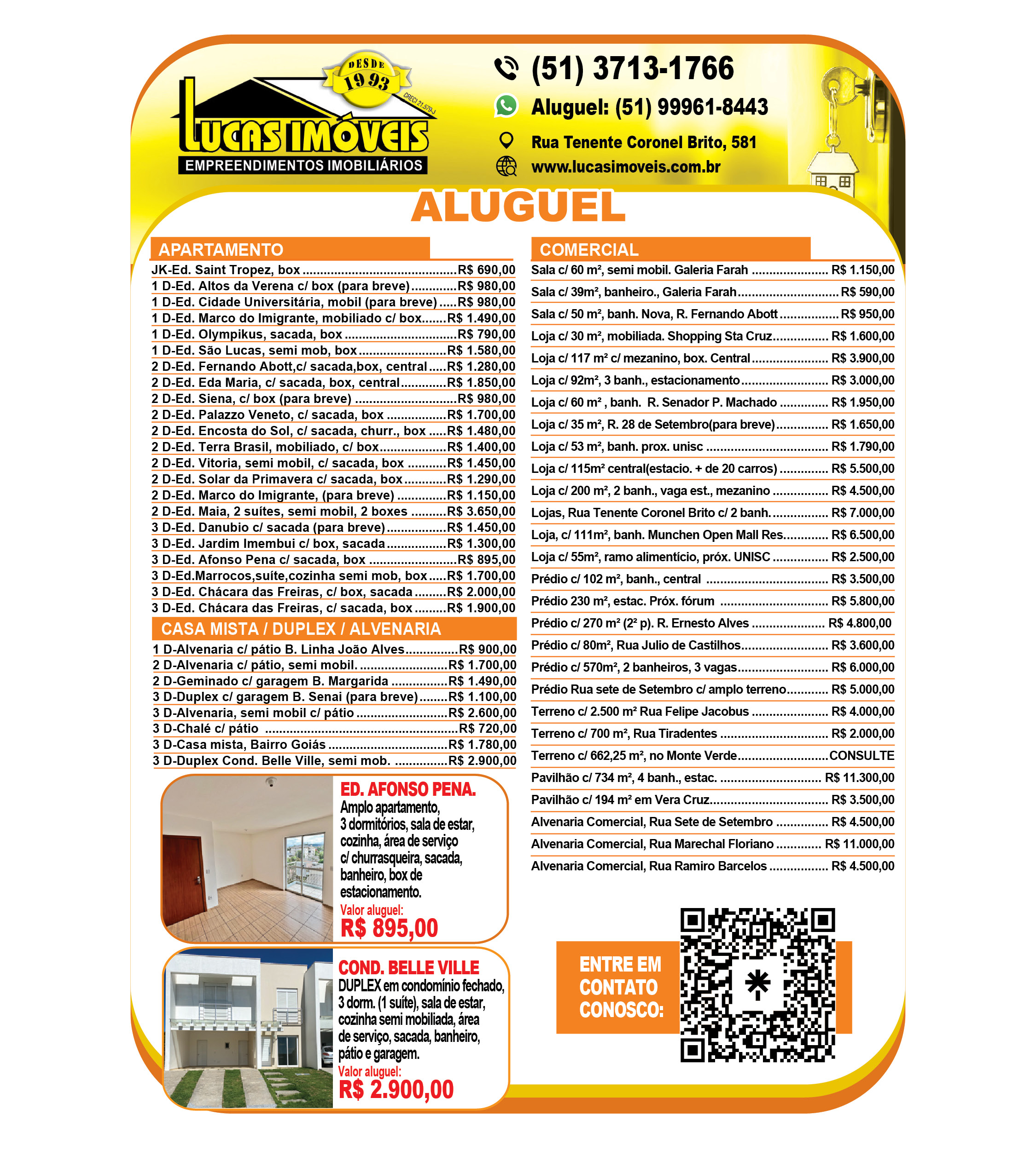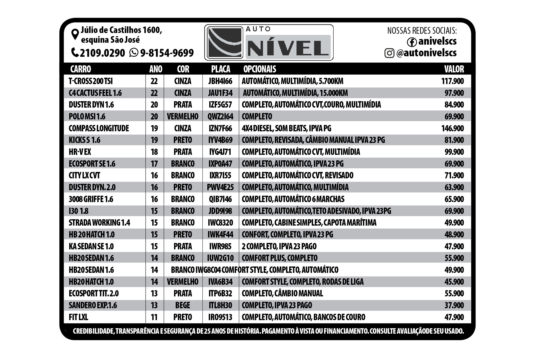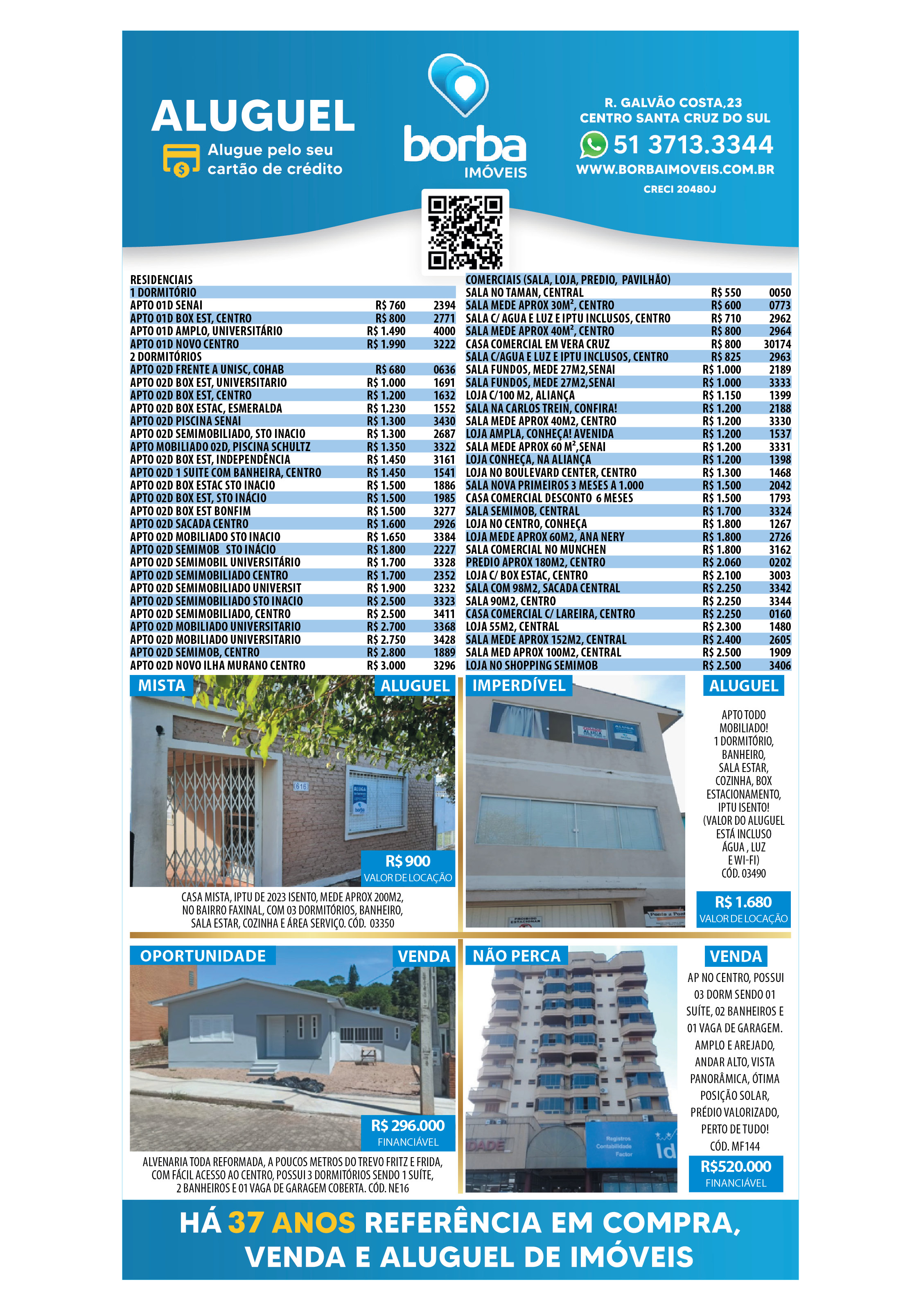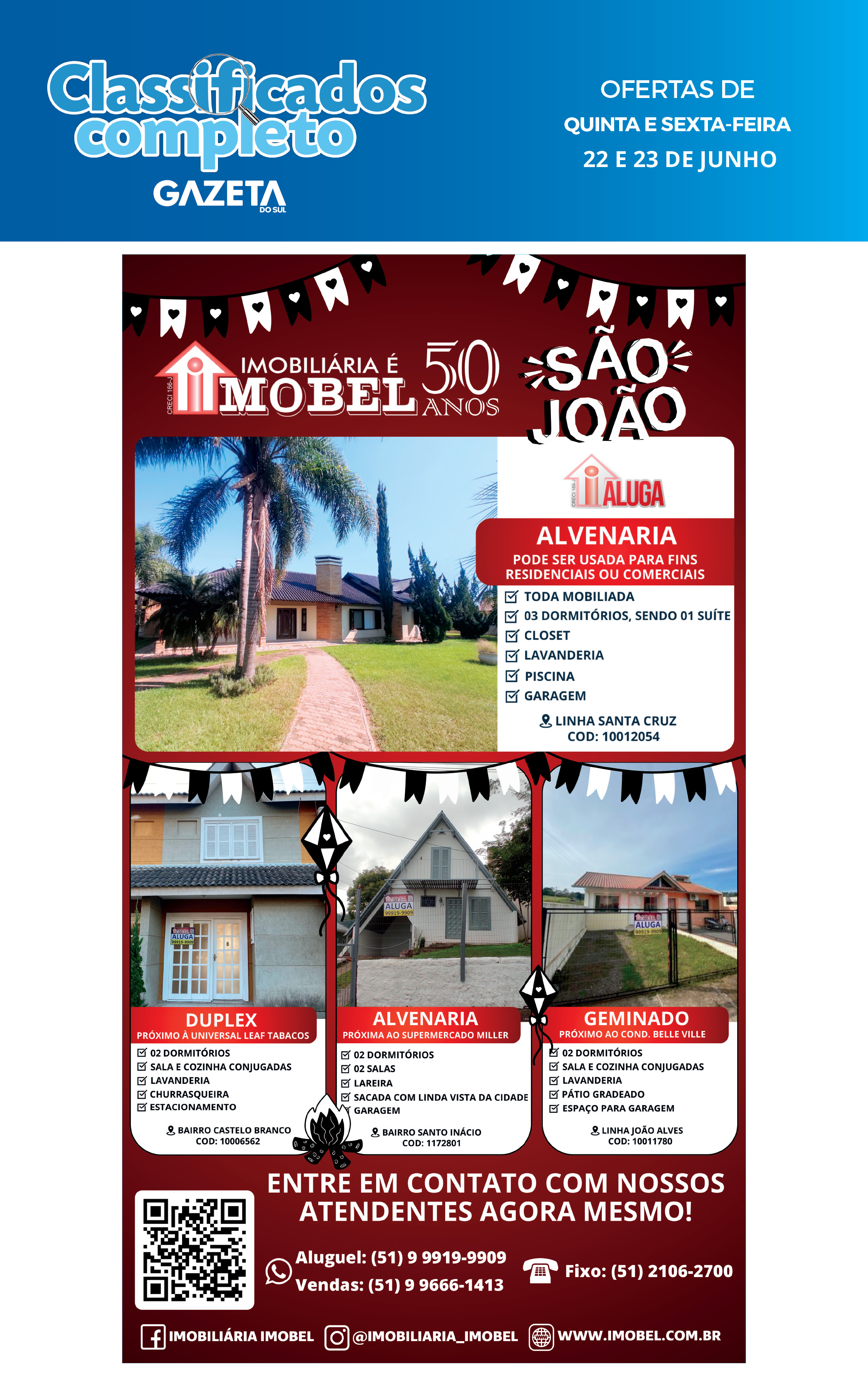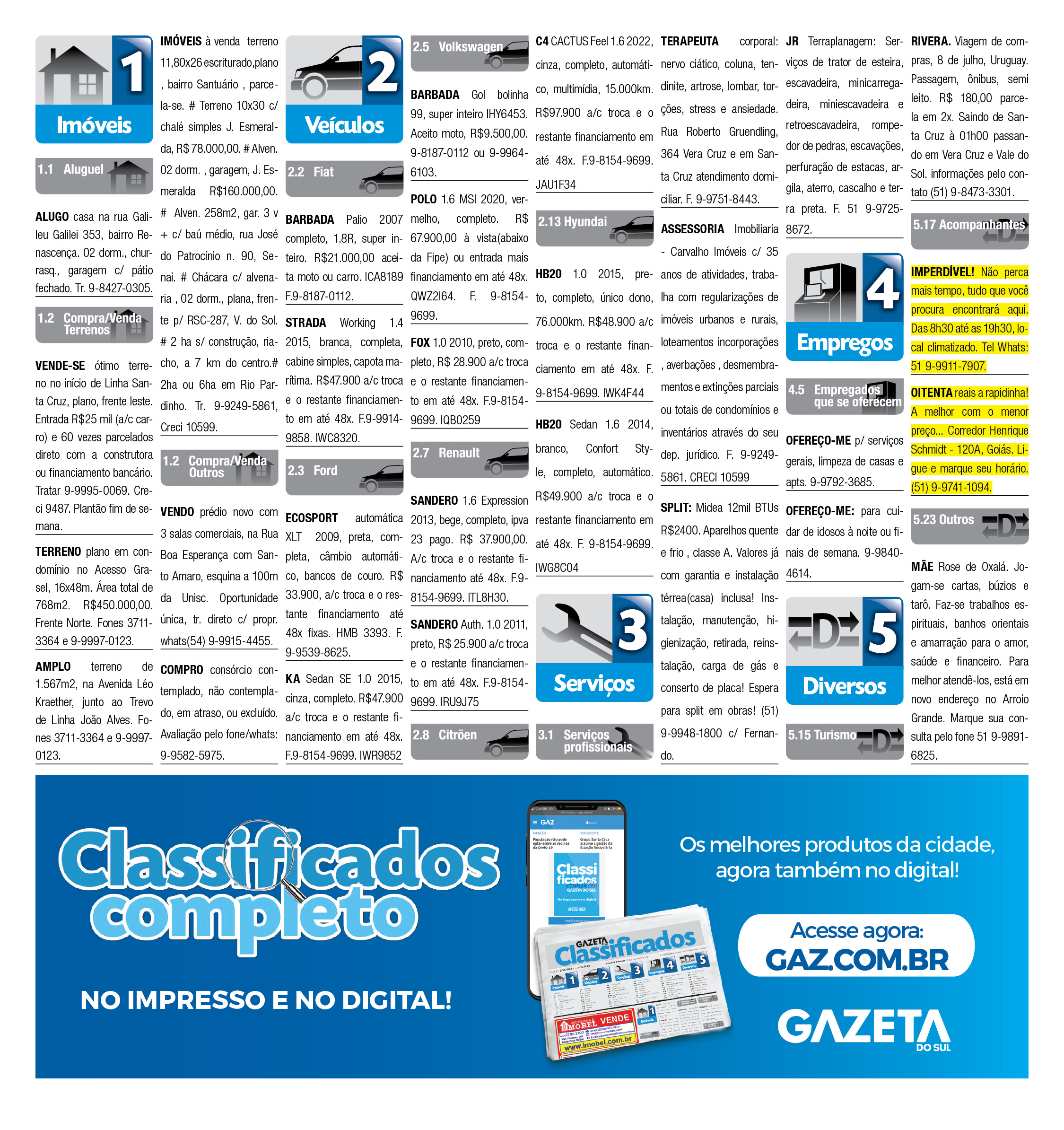 O suplemento de Classificados, que circula nas edições de terças, quintas e sábados, é um dos mais tradicionais da Gazeta do Sul, como vitrine e canal de negócios, de oferta, compra e venda em toda a região central do Rio Grande do Sul. E, para enriquecer pesquisas de produtos e serviços e possibilitar resultado ainda melhor a usuários e parceiros, nos anúncios de clientes cadastrados, o leitor tem acesso direto com link ao site do anunciante, onde poderá verificar mais detalhes sobre os itens. Confira as ofertas: