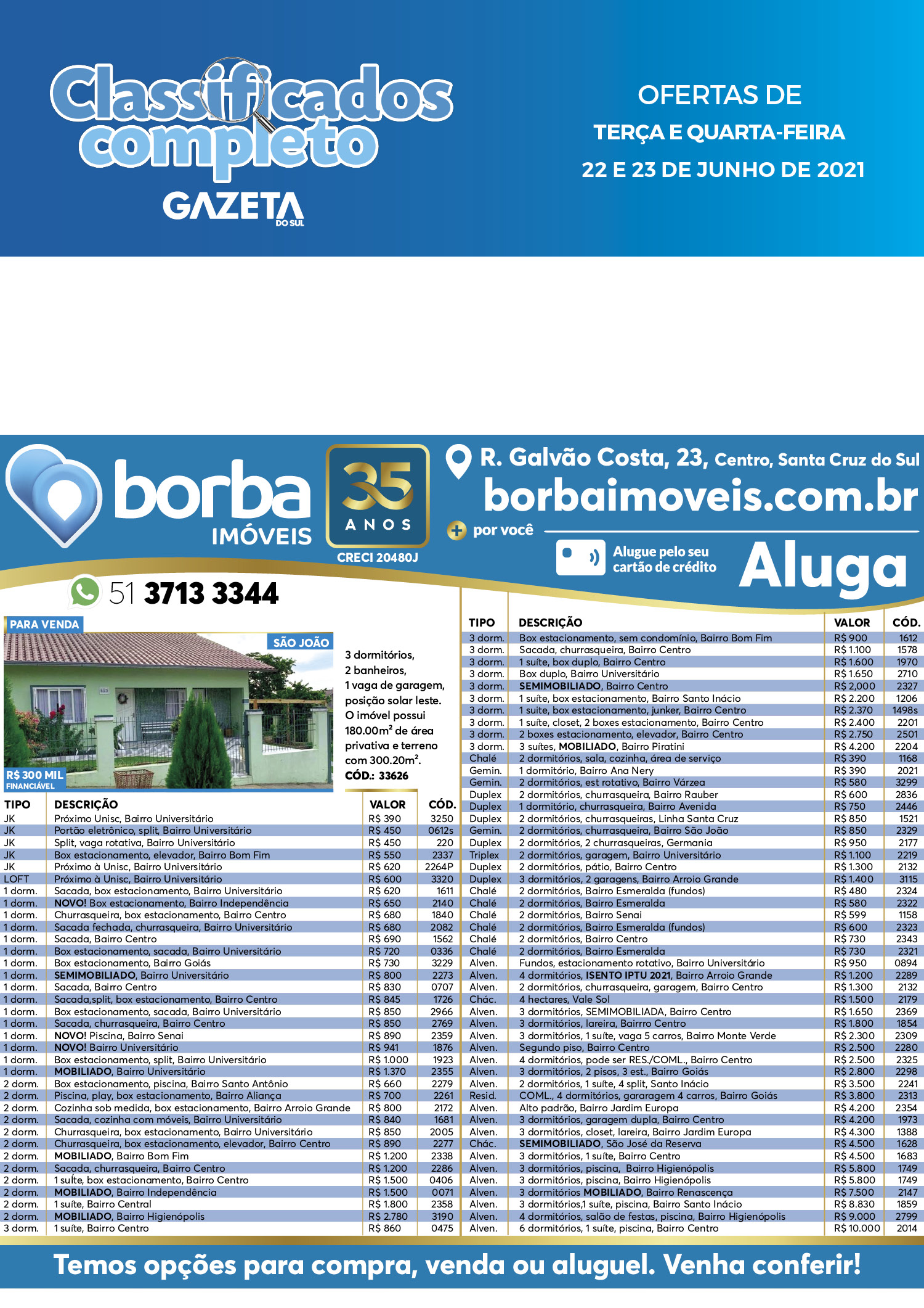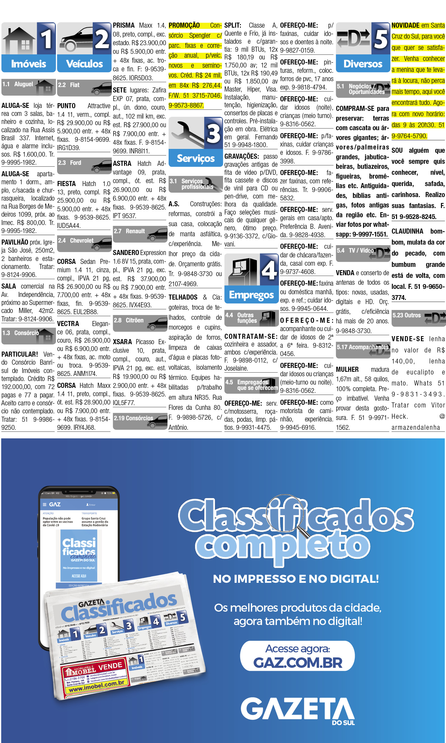 O suplemento de Classificados, que circula nas edições de terças, quintas e sábados, é um dos mais tradicionais da Gazeta do Sul, como vitrine e canal de negócios, de oferta, compra e venda em toda a região central do Rio Grande do Sul. E, para enriquecer pesquisas de produtos e serviços e possibilitar resultado ainda melhor a usuários e parceiros, nos anúncios de clientes cadastrados, o leitor tem acesso direto com link ao site do anunciante, onde poderá verificar mais detalhes sobre os itens. Confira: