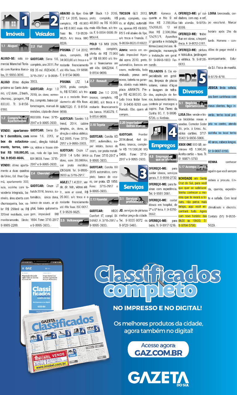 O suplemento de Classificados, que circula nas edições de terças, quintas e sábados, é um dos mais tradicionais da Gazeta do Sul, como vitrine e canal de negócios, de oferta, compra e venda em toda a região central do Rio Grande do Sul. E, para enriquecer pesquisas de produtos e serviços e possibilitar resultado ainda melhor a usuários e parceiros, nos anúncios de clientes cadastrados, o leitor tem acesso direto com link ao site do anunciante, onde poderá verificar mais detalhes sobre os itens. Confira as ofertas: