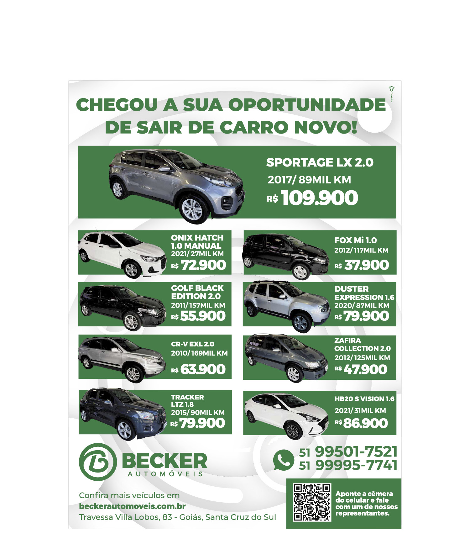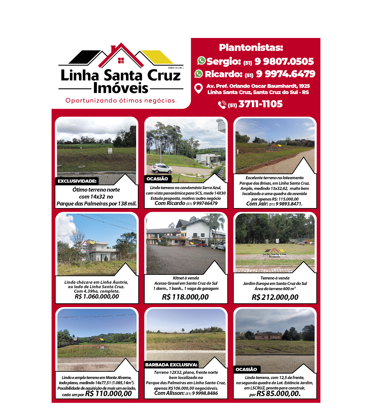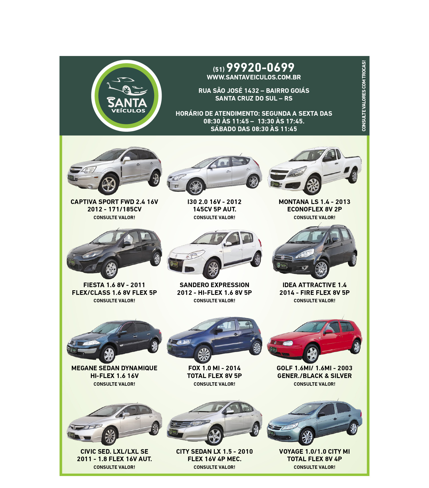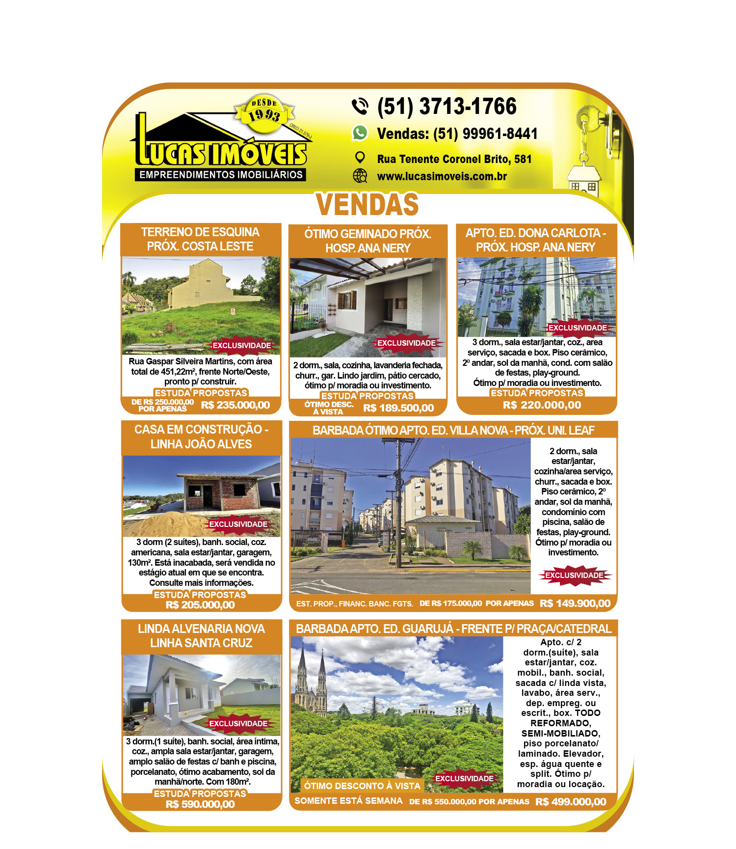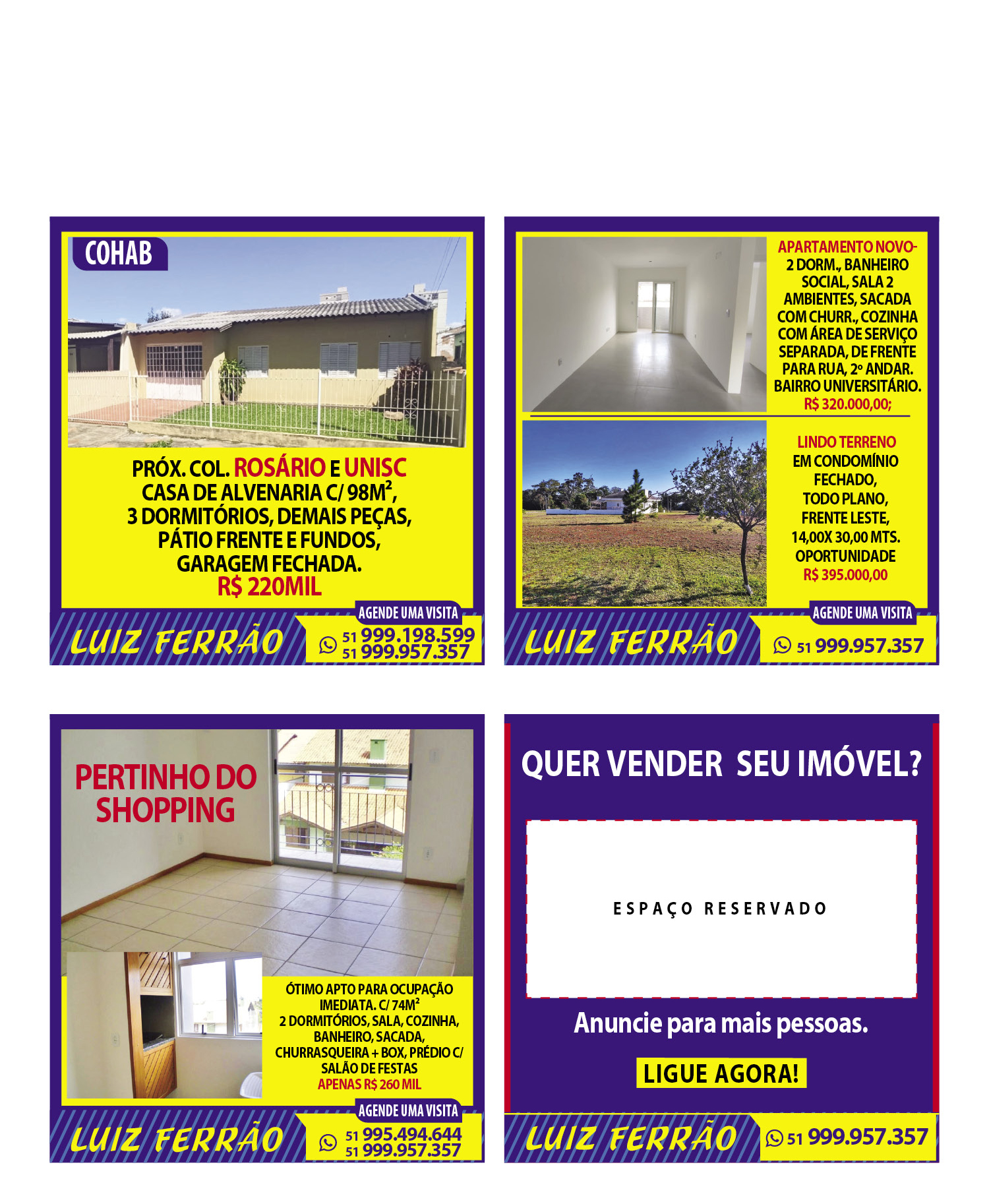 O suplemento de Classificados, que circula nas edições de terças, quintas e sábados, é um dos mais tradicionais da Gazeta do Sul, como vitrine e canal de negócios, de oferta, compra e venda em toda a região central do Rio Grande do Sul. E, para enriquecer pesquisas de produtos e serviços e possibilitar resultado ainda melhor a usuários e parceiros, nos anúncios de clientes cadastrados, o leitor tem acesso direto com link ao site do anunciante, onde poderá verificar mais detalhes sobre os itens. Confira as ofertas: