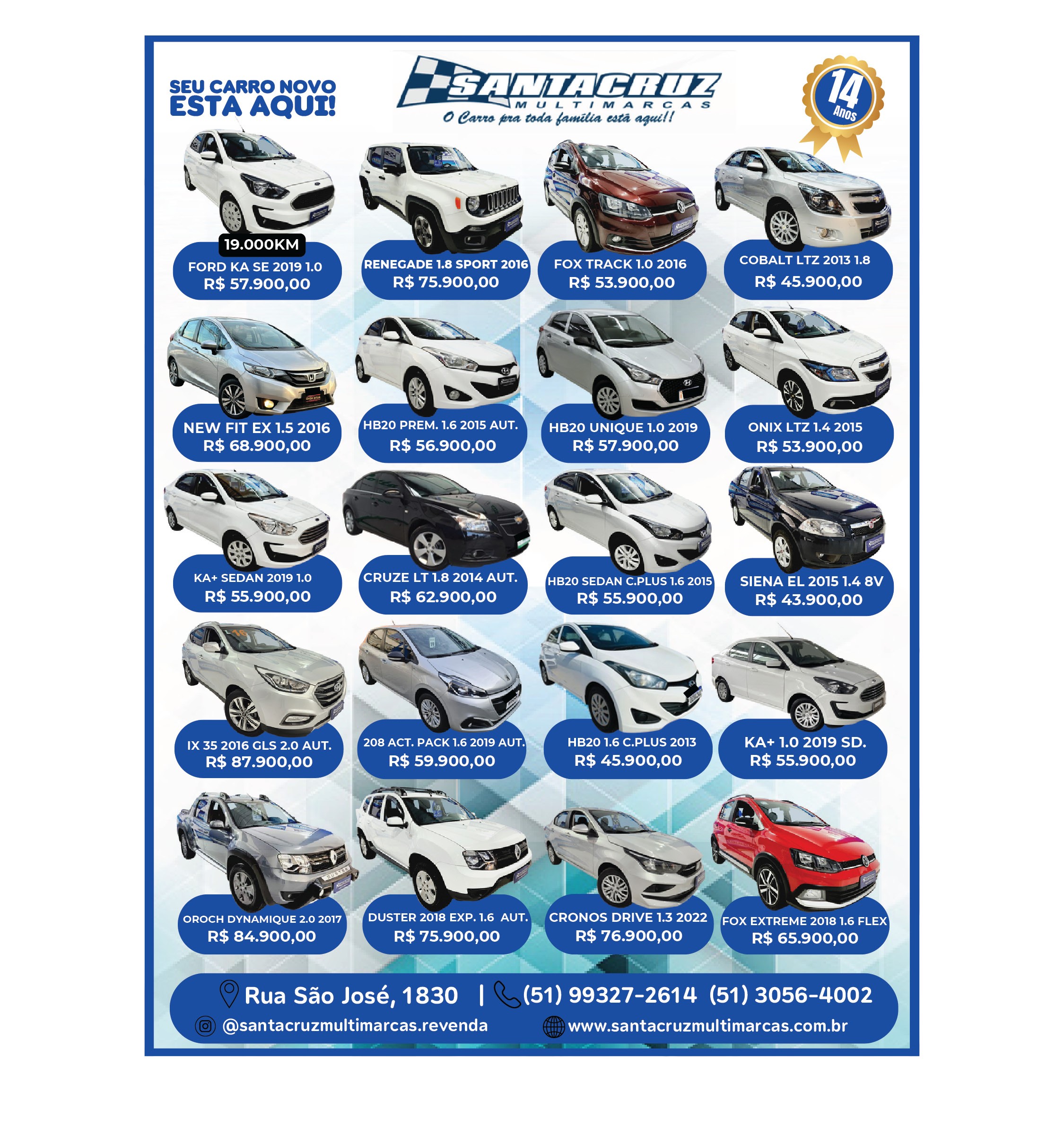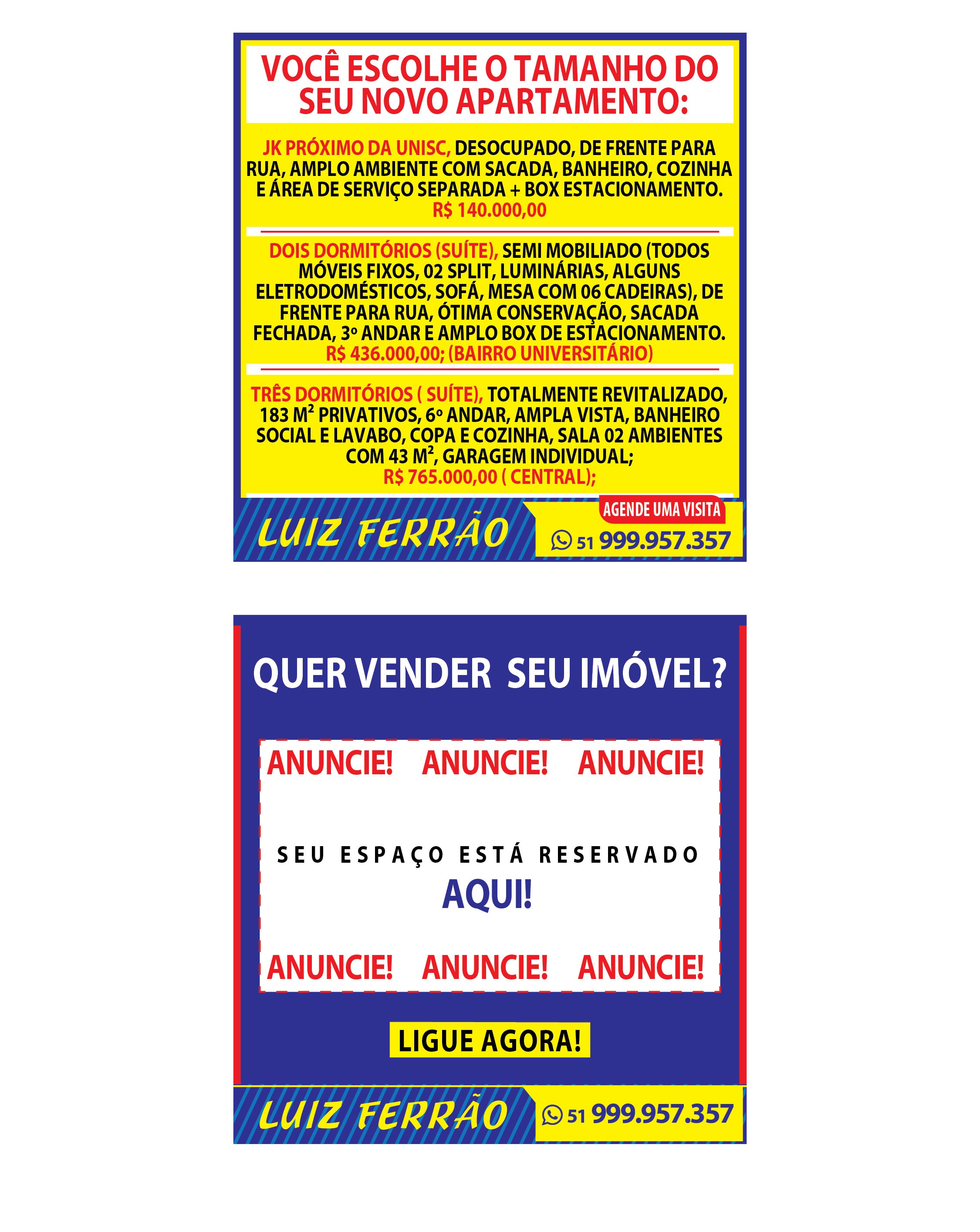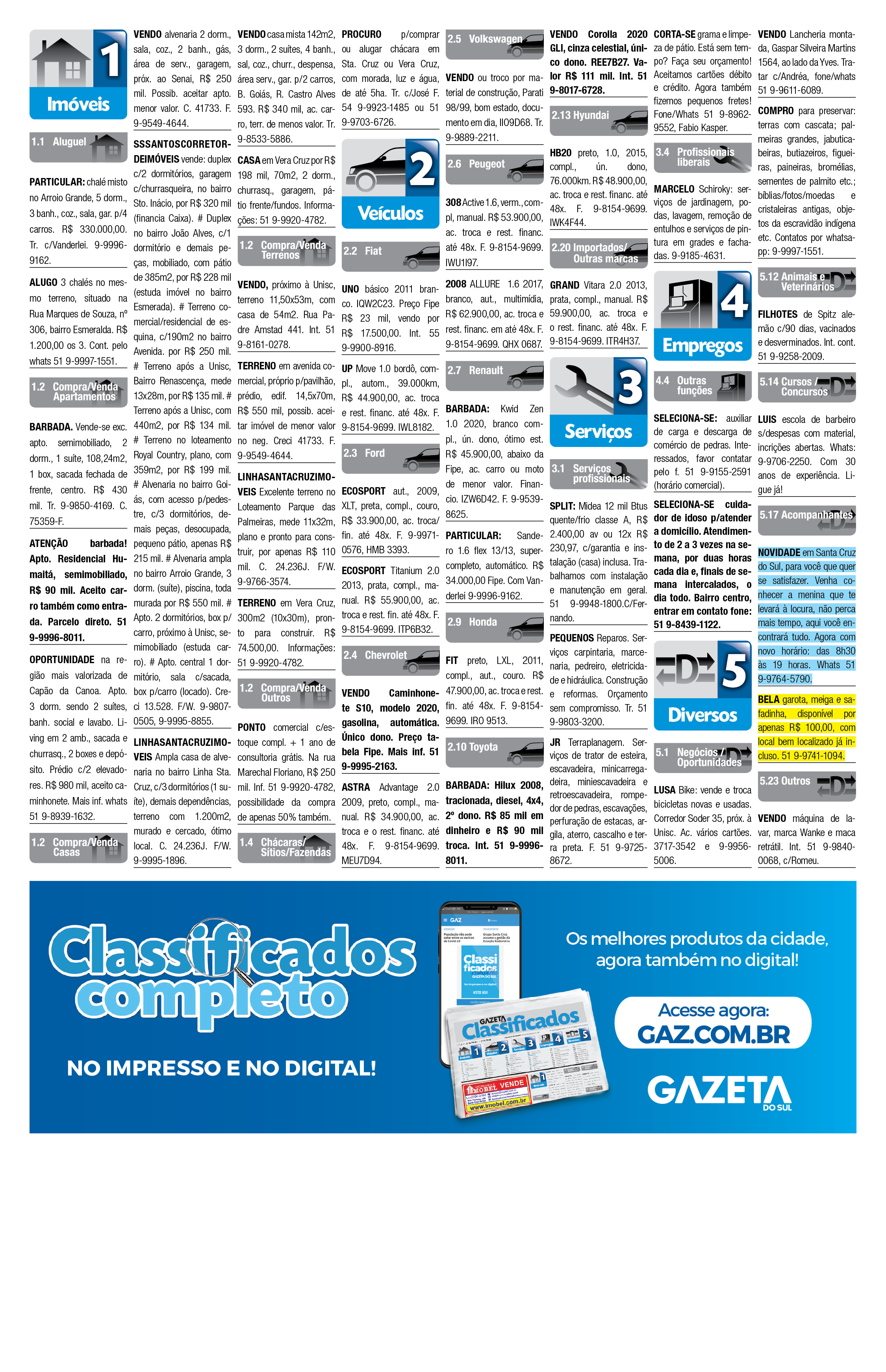 O suplemento de Classificados, que circula nas edições de terças, quintas e sábados, é um dos mais tradicionais da Gazeta do Sul, como vitrine e canal de negócios, de oferta, compra e venda em toda a região central do Rio Grande do Sul. E, para enriquecer pesquisas de produtos e serviços e possibilitar resultado ainda melhor a usuários e parceiros, nos anúncios de clientes cadastrados, o leitor tem acesso direto com link ao site do anunciante, onde poderá verificar mais detalhes sobre os itens. Confira as ofertas:
