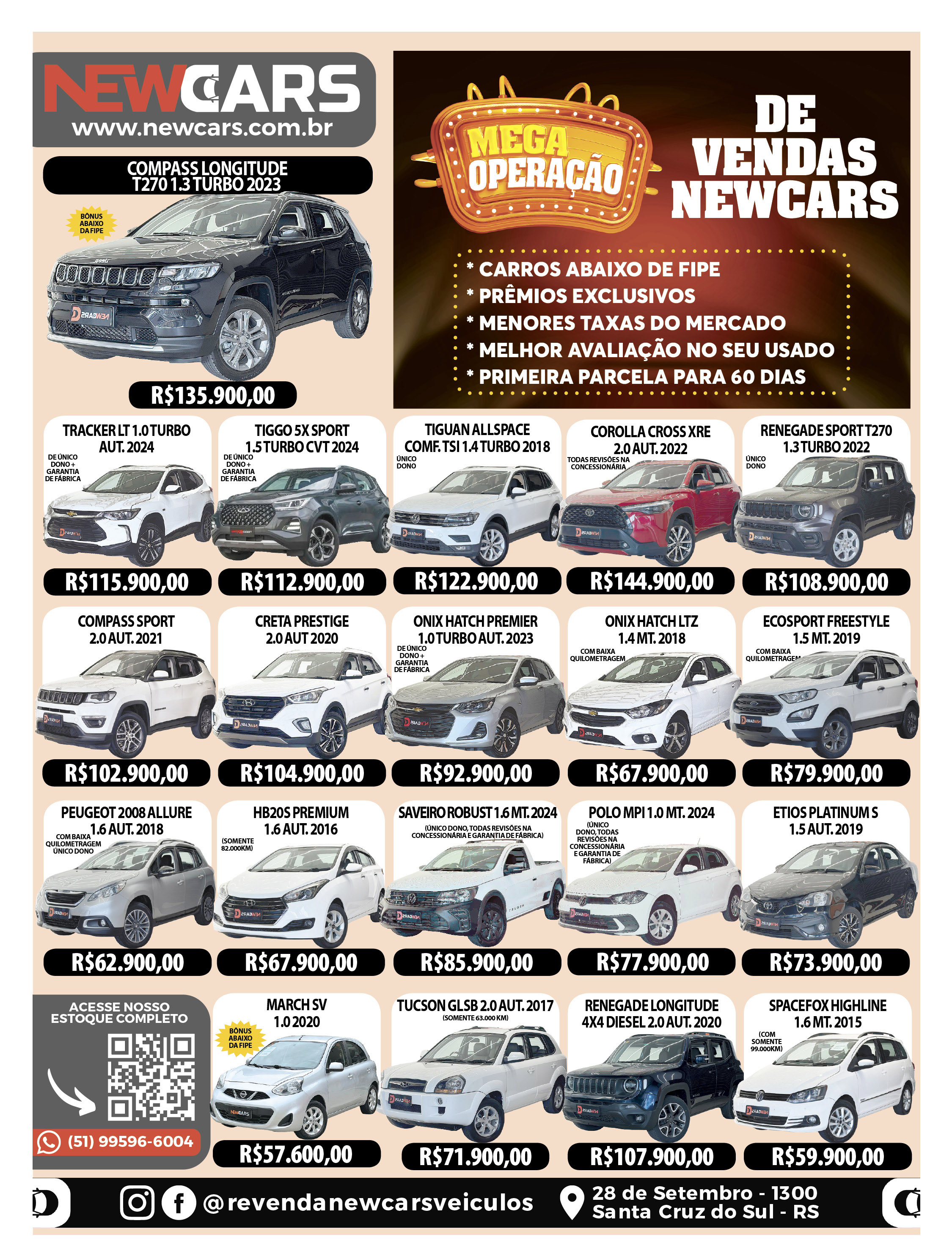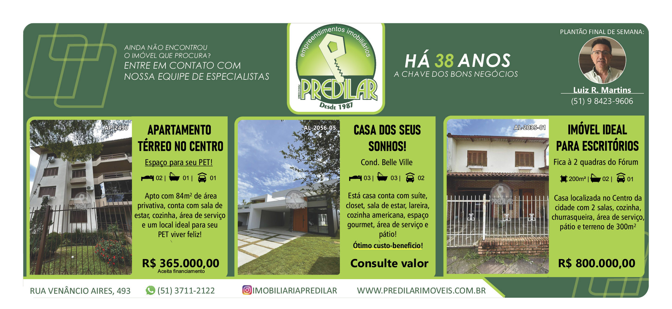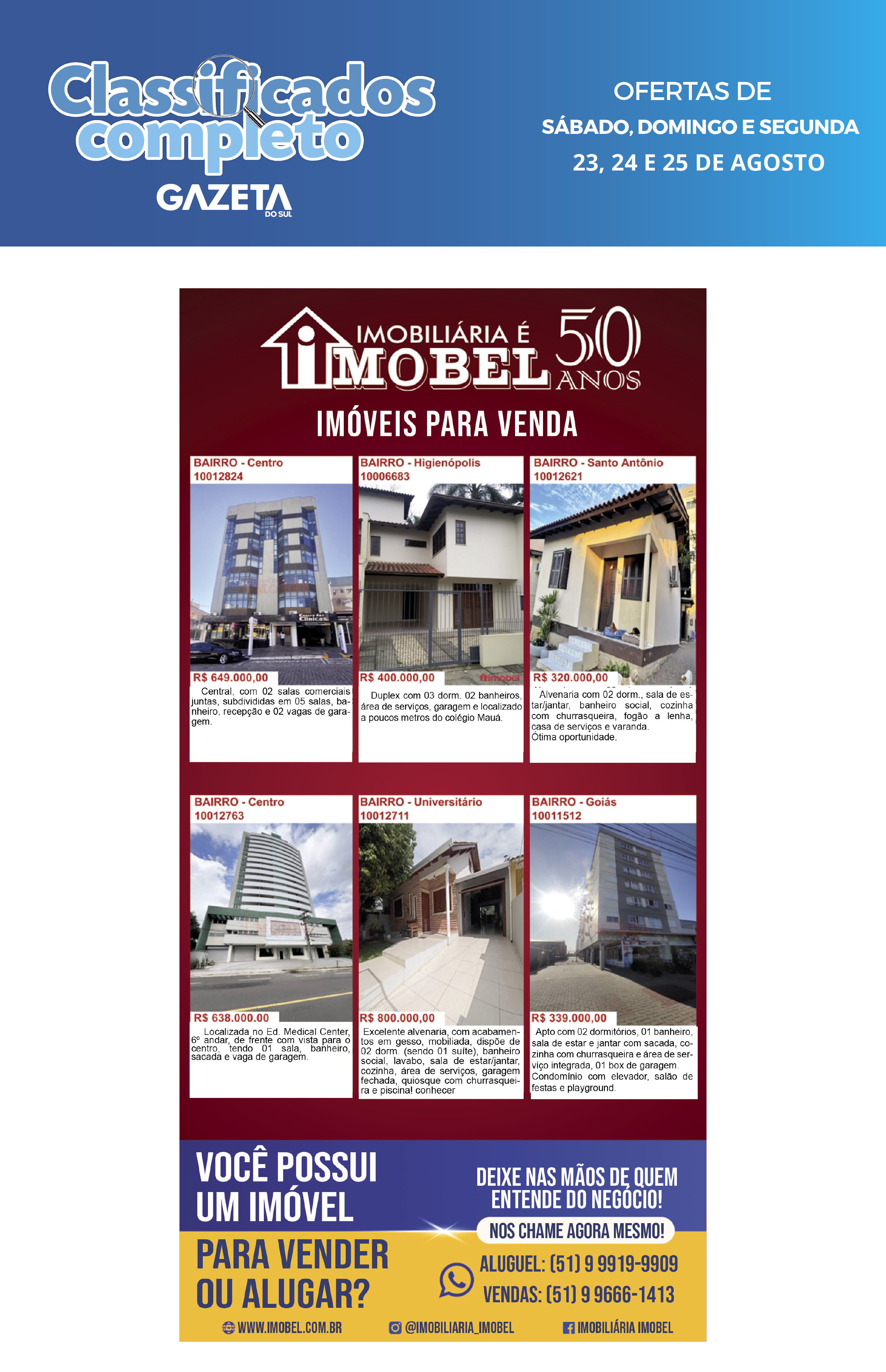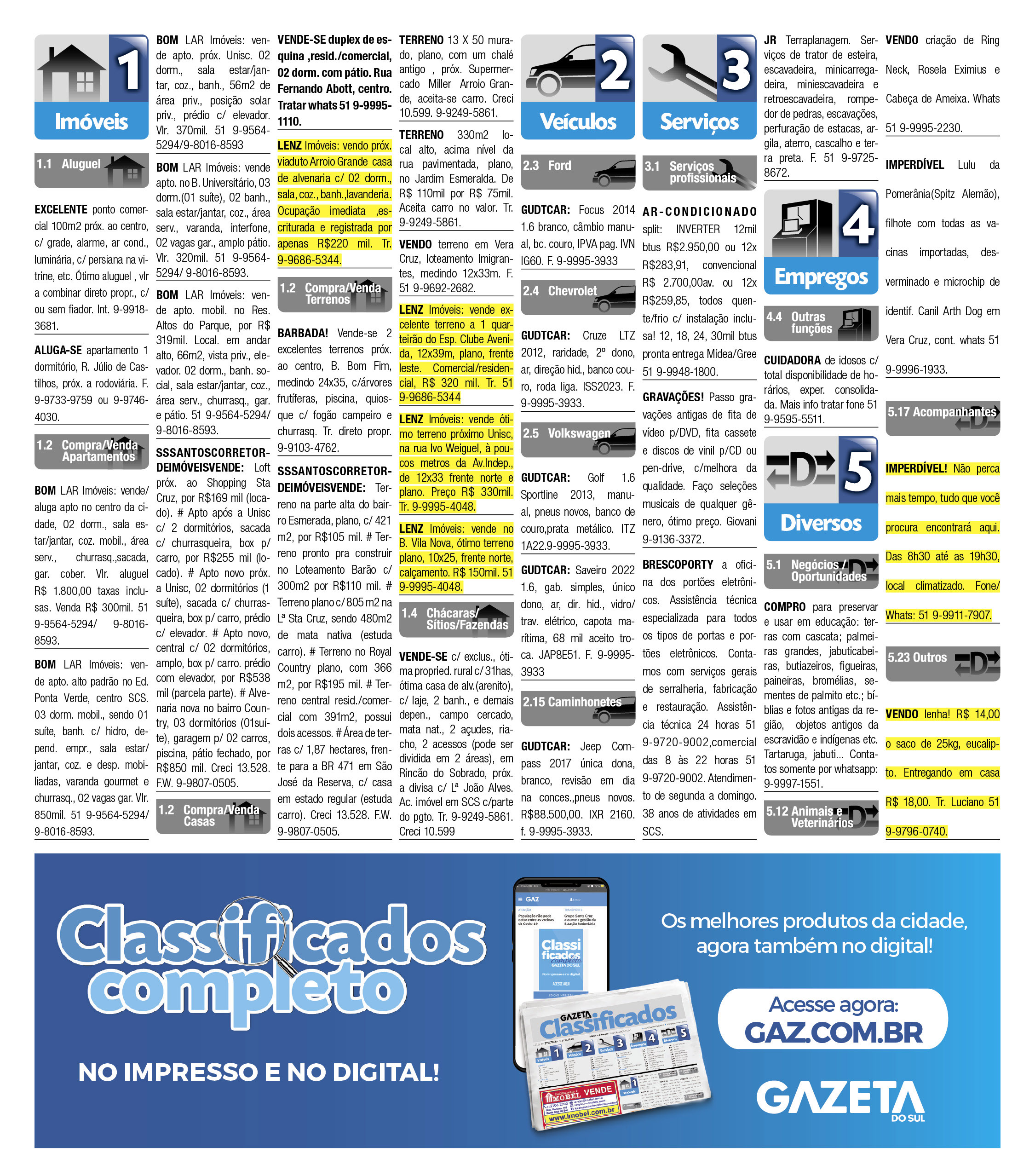 O suplemento de Classificados, que circula nas edições de terças, quintas e sábados, é um dos mais tradicionais da Gazeta do Sul, como vitrine e canal de negócios, de oferta, compra e venda em toda a região central do Rio Grande do Sul. E, para enriquecer pesquisas de produtos e serviços e possibilitar resultado ainda melhor a usuários e parceiros, nos anúncios de clientes cadastrados, o leitor tem acesso direto com link ao site do anunciante, onde poderá verificar mais detalhes sobre os itens. Confira as ofertas: