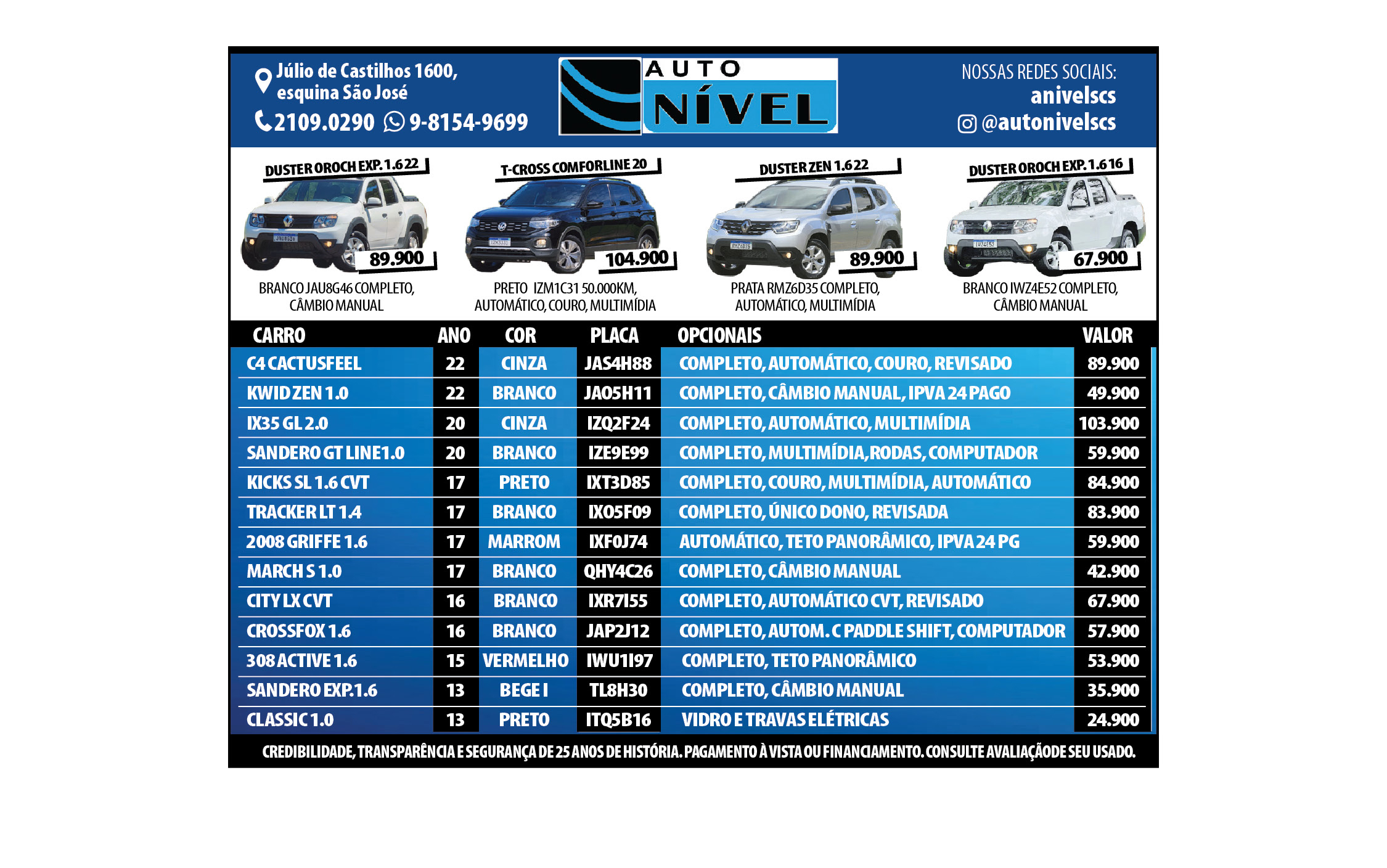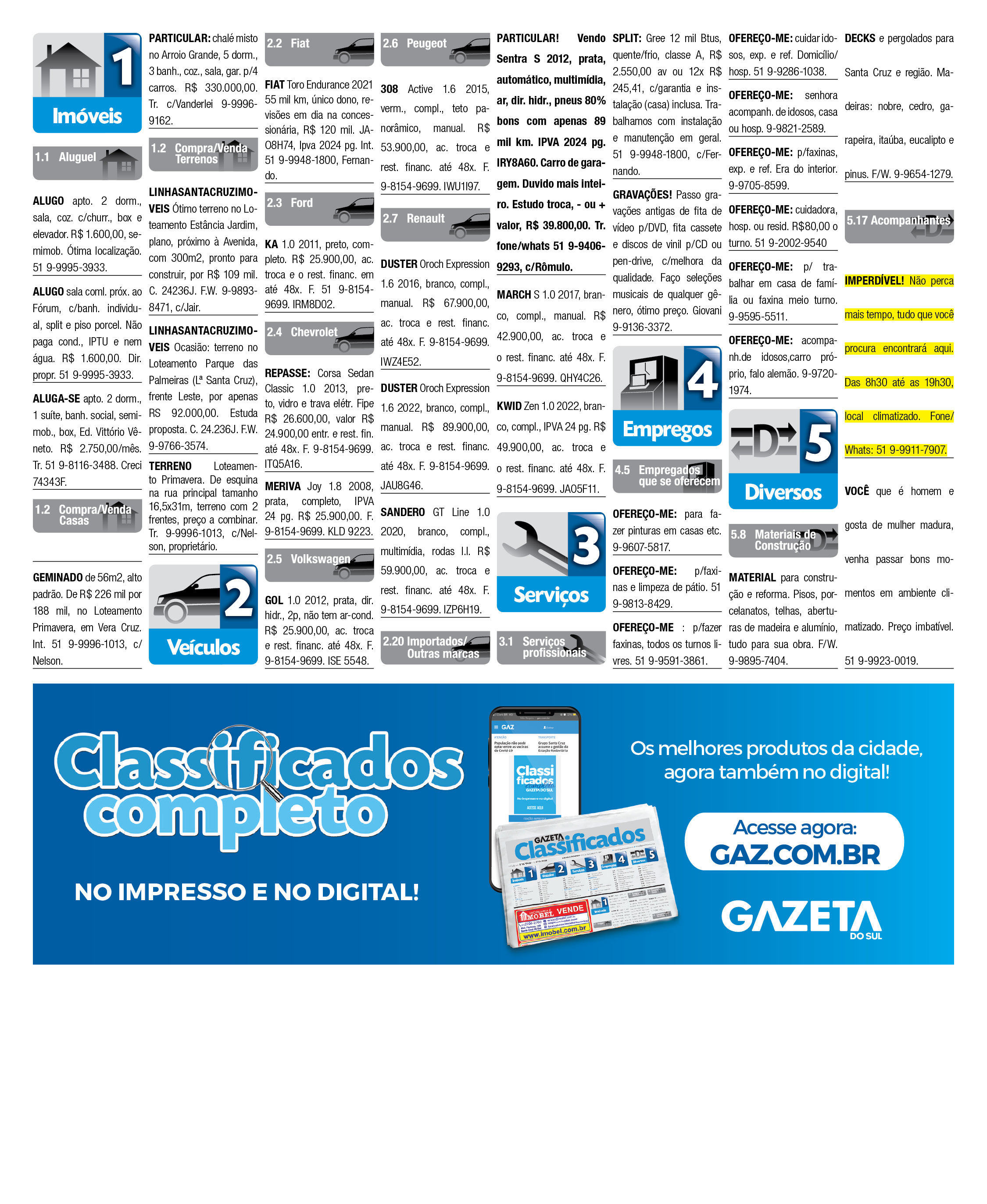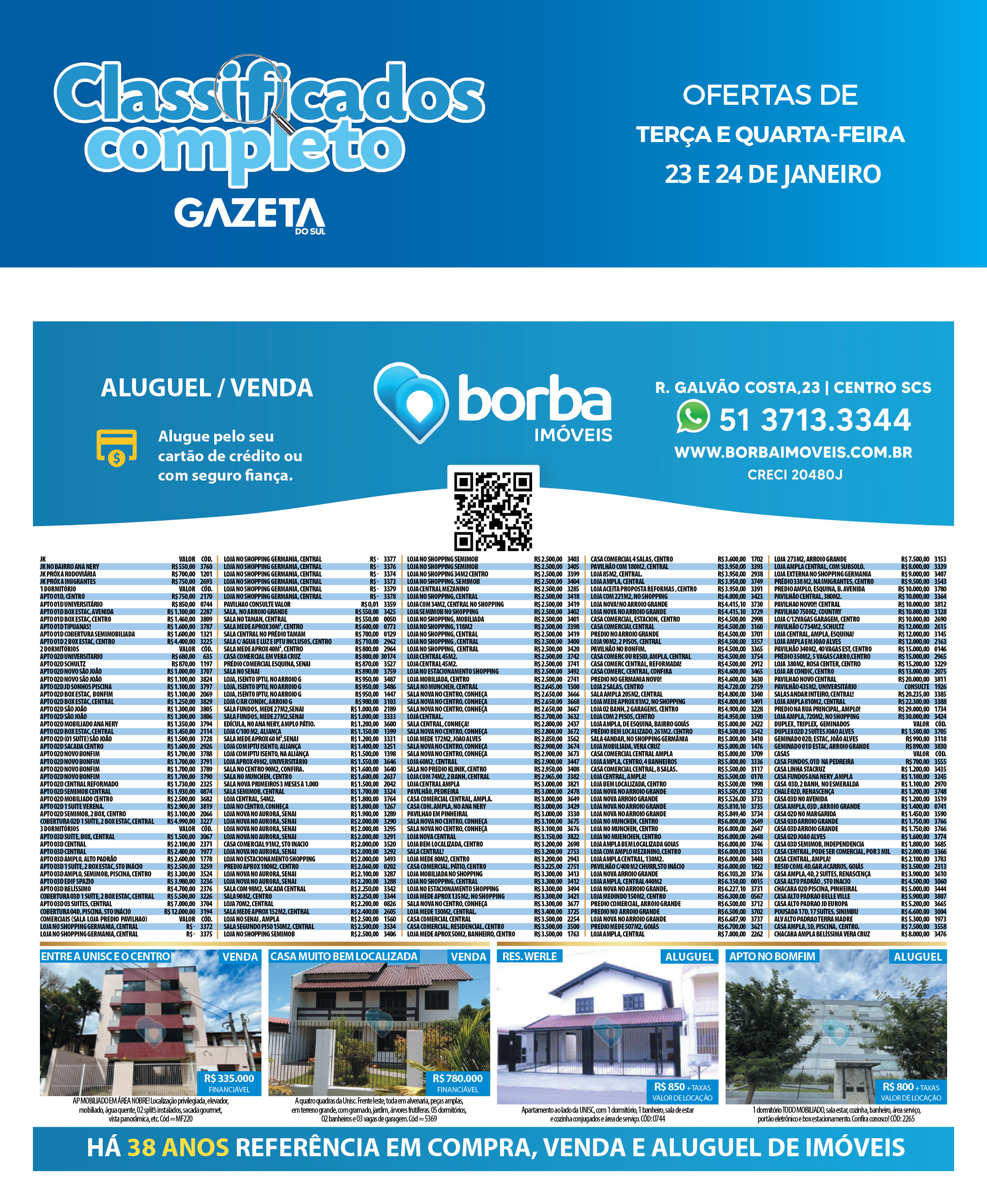 O suplemento de Classificados, que circula nas edições de terças, quintas e sábados, é um dos mais tradicionais da Gazeta do Sul, como vitrine e canal de negócios, de oferta, compra e venda em toda a região central do Rio Grande do Sul. E, para enriquecer pesquisas de produtos e serviços e possibilitar resultado ainda melhor a usuários e parceiros, nos anúncios de clientes cadastrados, o leitor tem acesso direto com link ao site do anunciante, onde poderá verificar mais detalhes sobre os itens. Confira as ofertas: