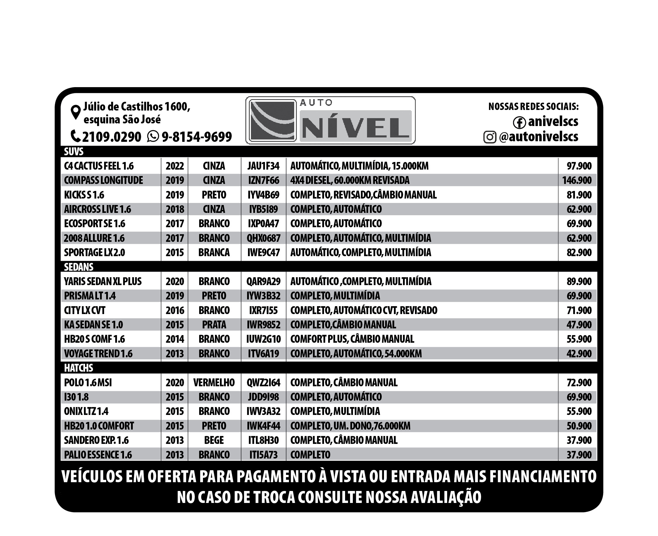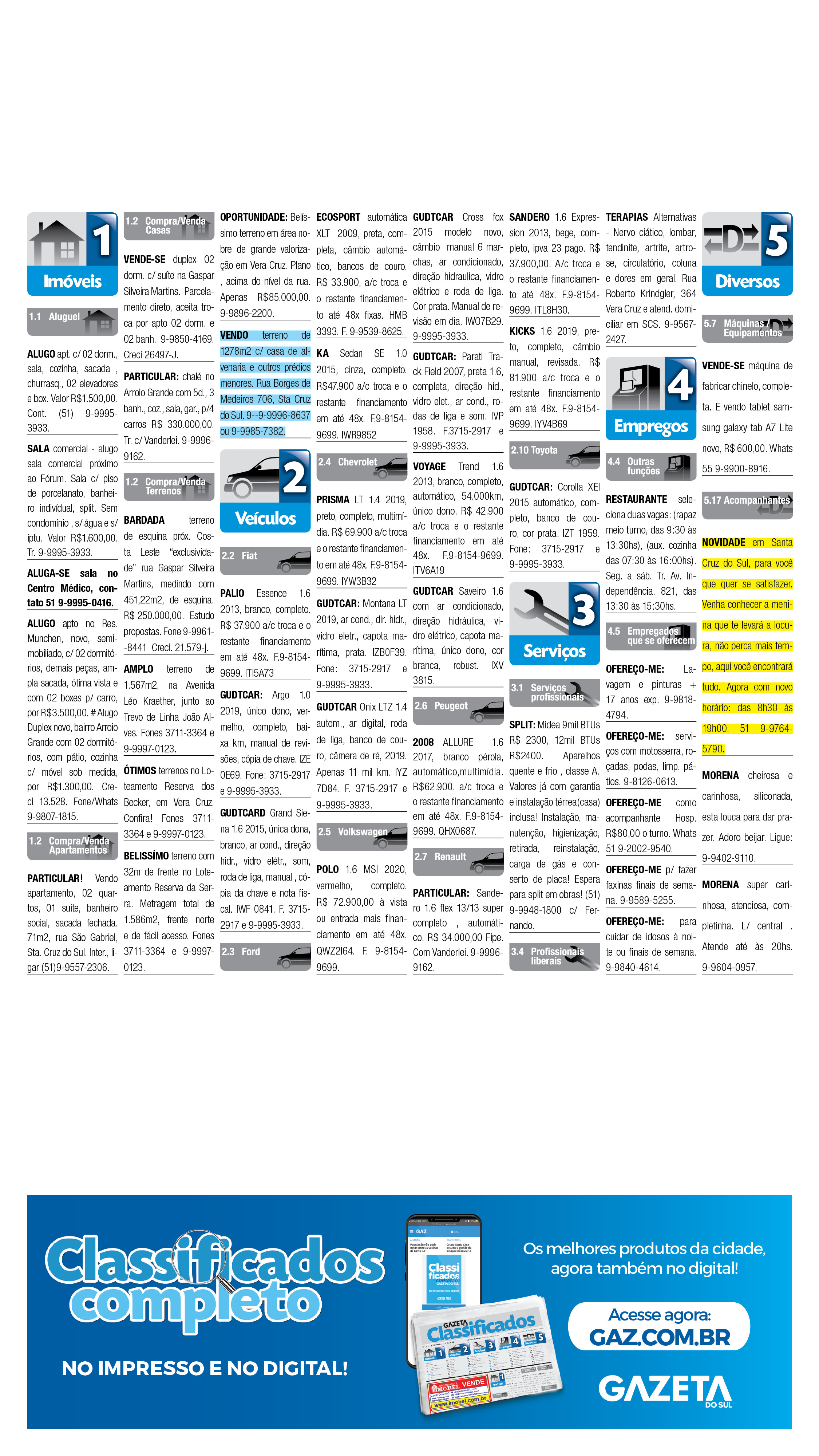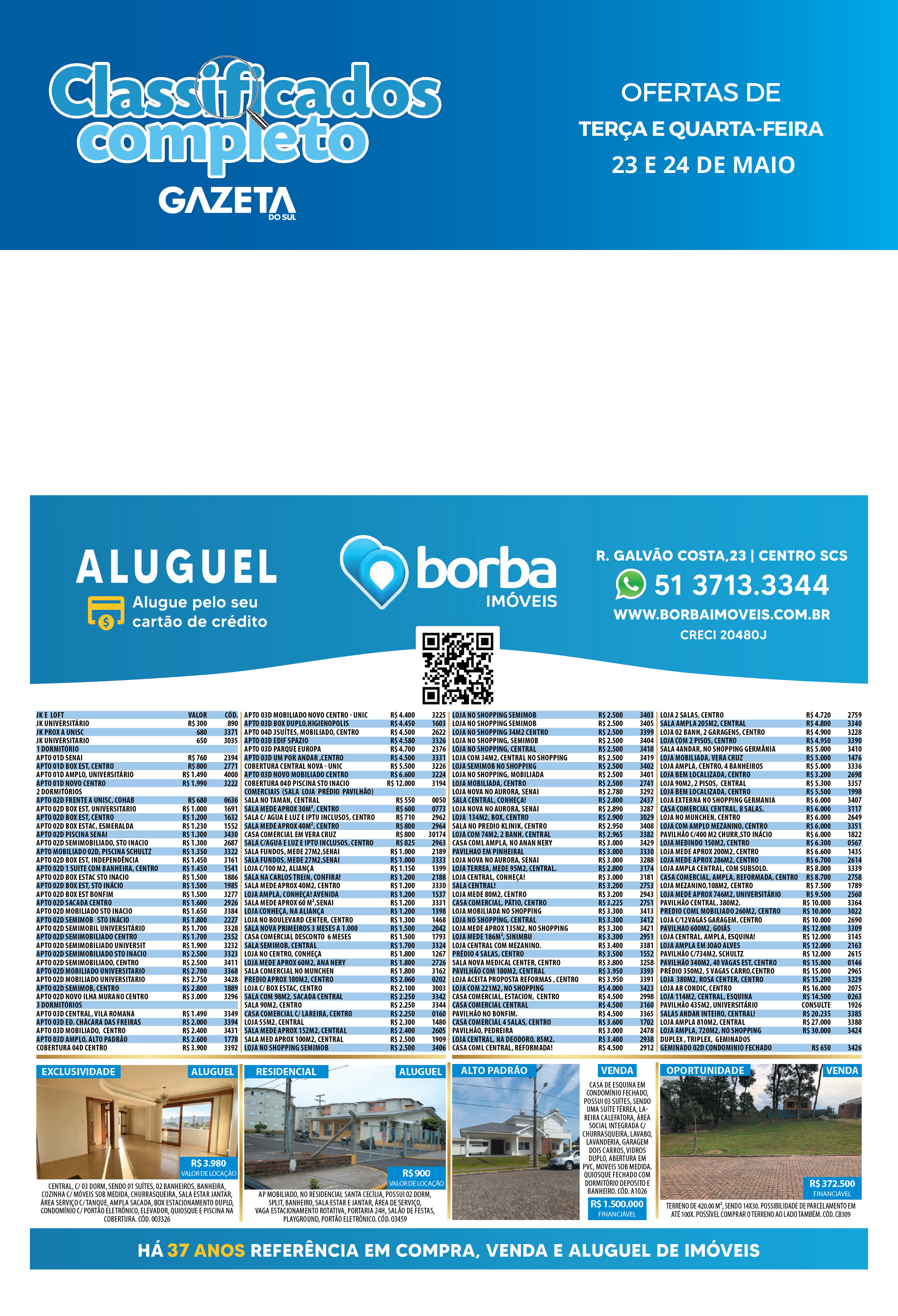 O suplemento de Classificados, que circula nas edições de terças, quintas e sábados, é um dos mais tradicionais da Gazeta do Sul, como vitrine e canal de negócios, de oferta, compra e venda em toda a região central do Rio Grande do Sul. E, para enriquecer pesquisas de produtos e serviços e possibilitar resultado ainda melhor a usuários e parceiros, nos anúncios de clientes cadastrados, o leitor tem acesso direto com link ao site do anunciante, onde poderá verificar mais detalhes sobre os itens. Confira as ofertas: