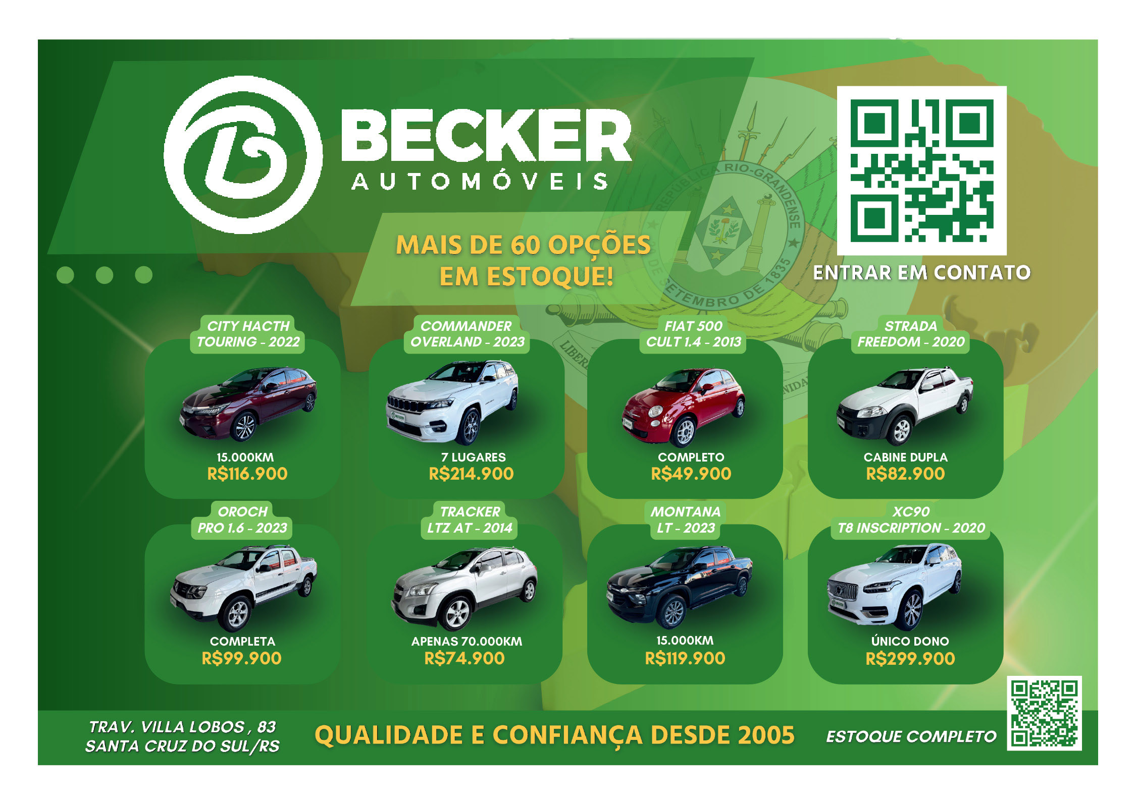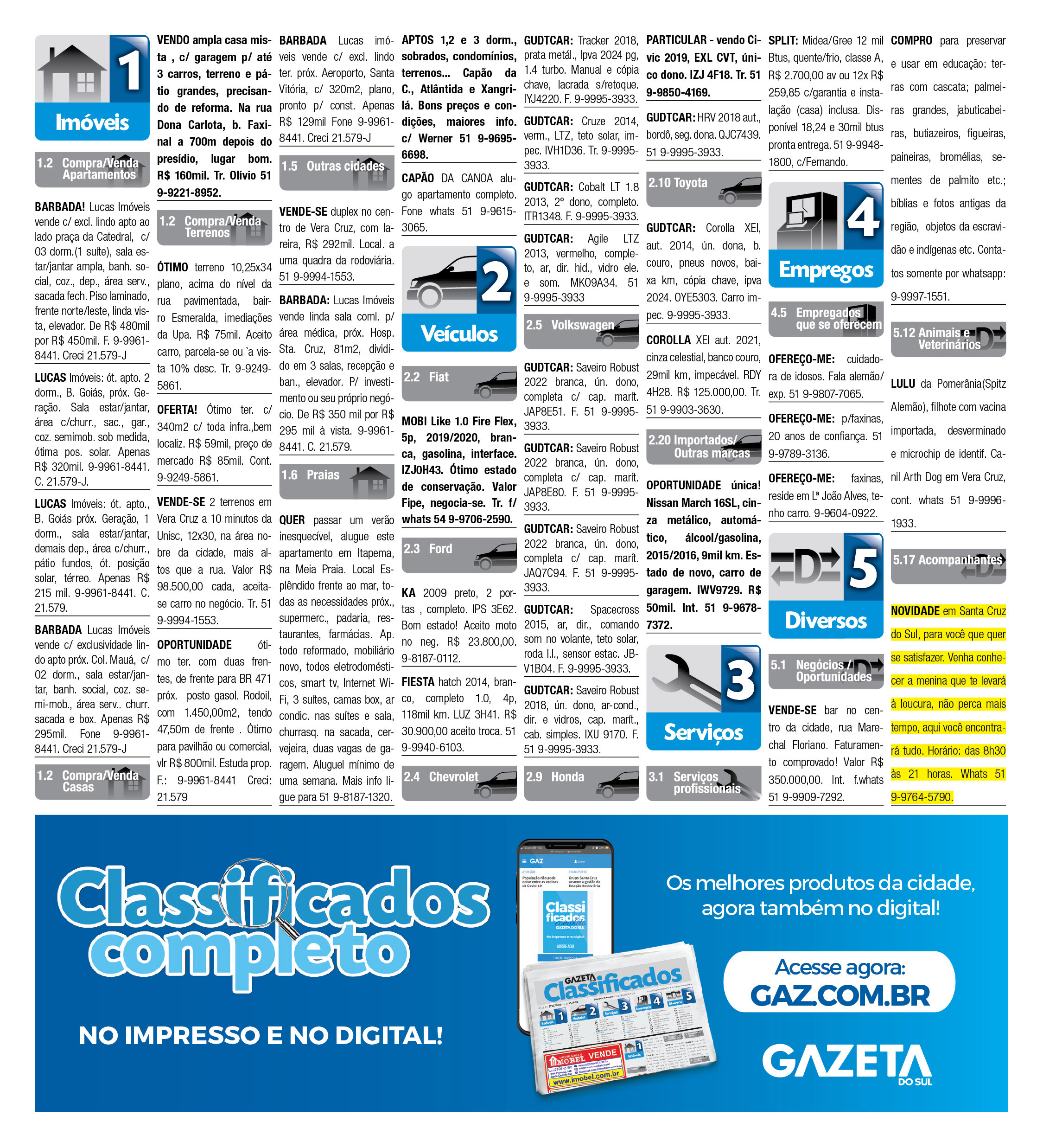O suplemento de Classificados, que circula nas edições de terças, quintas e sábados, é um dos mais tradicionais da Gazeta do Sul, como vitrine e canal de negócios, de oferta, compra e venda em toda a região central do Rio Grande do Sul. E, para enriquecer pesquisas de produtos e serviços e possibilitar resultado ainda melhor a usuários e parceiros, nos anúncios de clientes cadastrados, o leitor tem acesso direto com link ao site do anunciante, onde poderá verificar mais detalhes sobre os itens. Confira as ofertas: