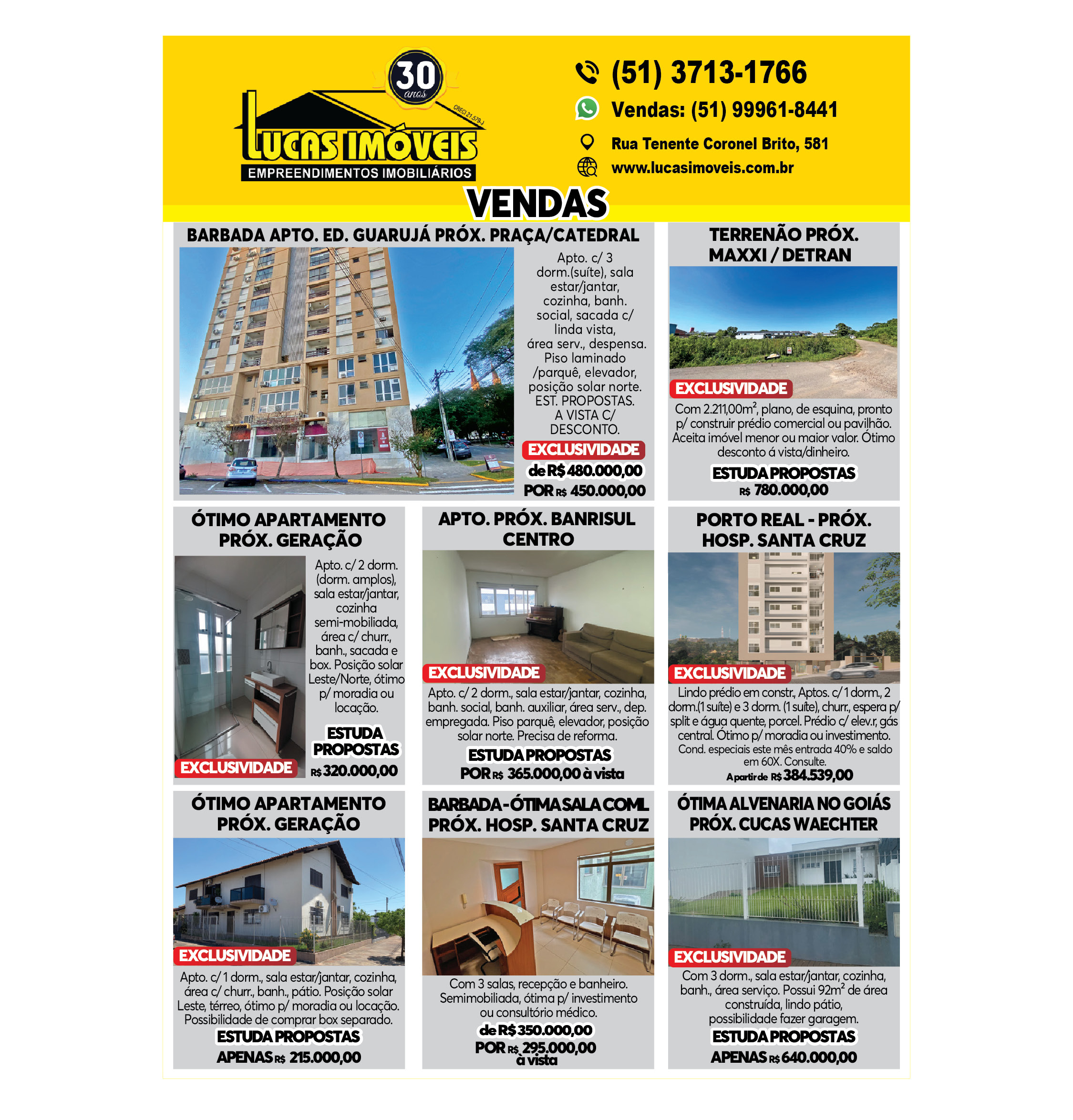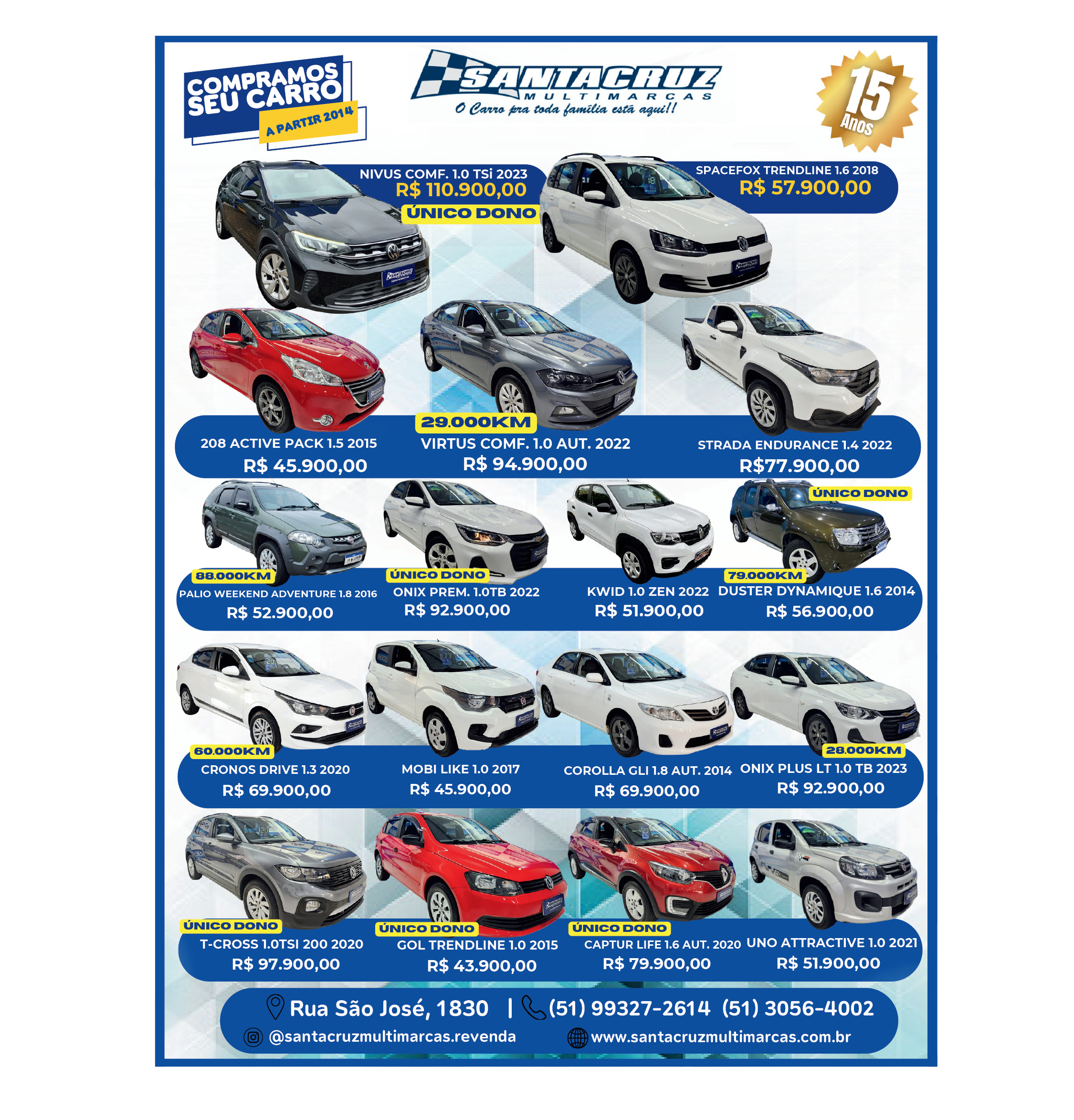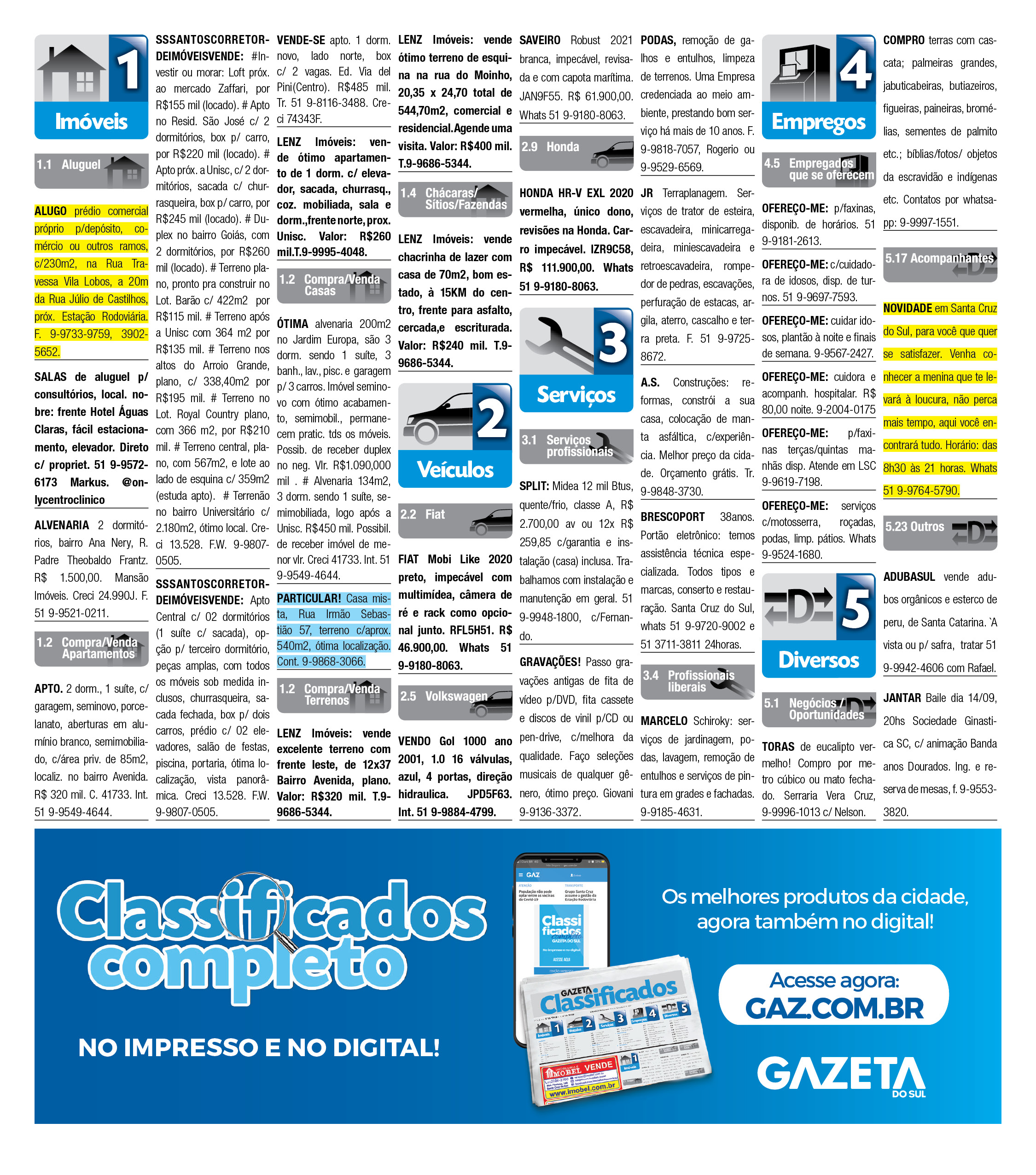 O suplemento de Classificados, que circula nas edições de terças, quintas e sábados, é um dos mais tradicionais da Gazeta do Sul, como vitrine e canal de negócios, de oferta, compra e venda em toda a região central do Rio Grande do Sul. E, para enriquecer pesquisas de produtos e serviços e possibilitar resultado ainda melhor a usuários e parceiros, nos anúncios de clientes cadastrados, o leitor tem acesso direto com link ao site do anunciante, onde poderá verificar mais detalhes sobre os itens. Confira as ofertas: