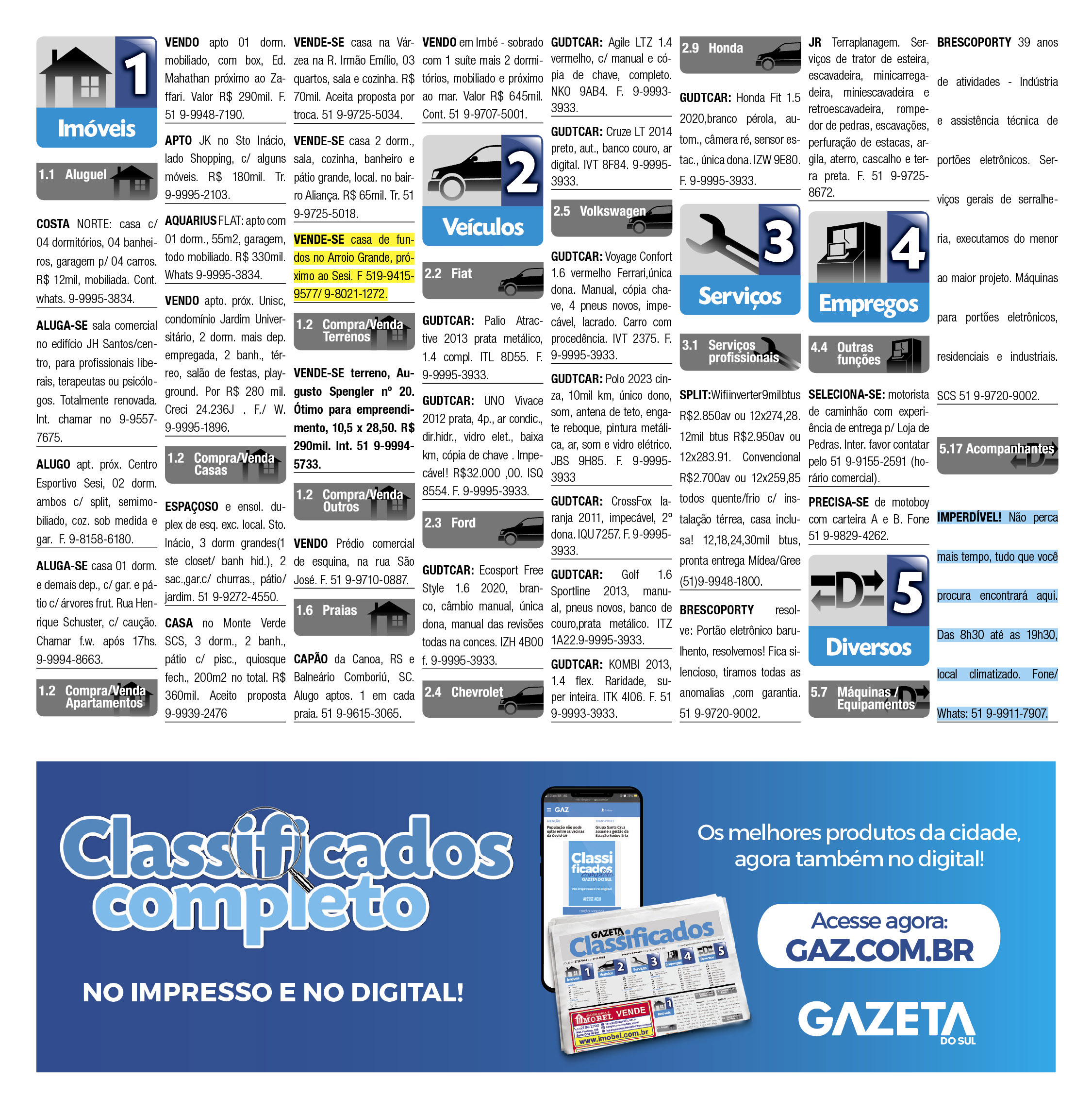 O suplemento de Classificados, que circula nas edições de terças, quintas e sábados, é um dos mais tradicionais da Gazeta do Sul, como vitrine e canal de negócios, de oferta, compra e venda em toda a região central do Rio Grande do Sul. E, para enriquecer pesquisas de produtos e serviços e possibilitar resultado ainda melhor a usuários e parceiros, nos anúncios de clientes cadastrados, o leitor tem acesso direto com link ao site do anunciante, onde poderá verificar mais detalhes sobre os itens. Confira as ofertas: