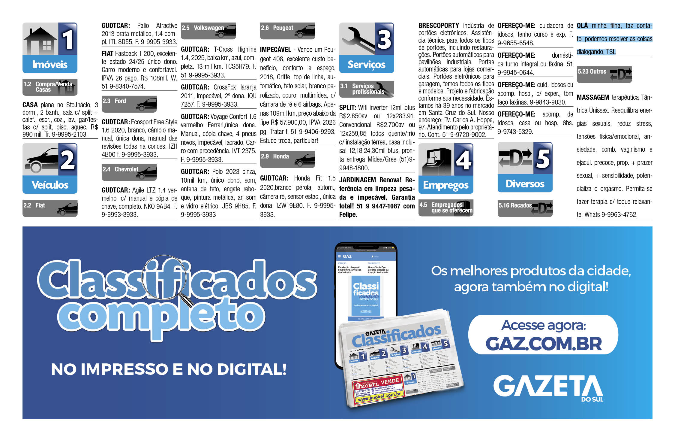 O suplemento de Classificados, que circula nas edições de terças, quintas e sábados, é um dos mais tradicionais da Gazeta do Sul, como vitrine e canal de negócios, de oferta, compra e venda em toda a região central do Rio Grande do Sul. E, para enriquecer pesquisas de produtos e serviços e possibilitar resultado ainda melhor a usuários e parceiros, nos anúncios de clientes cadastrados, o leitor tem acesso direto com link ao site do anunciante, onde poderá verificar mais detalhes sobre os itens. Confira as ofertas: