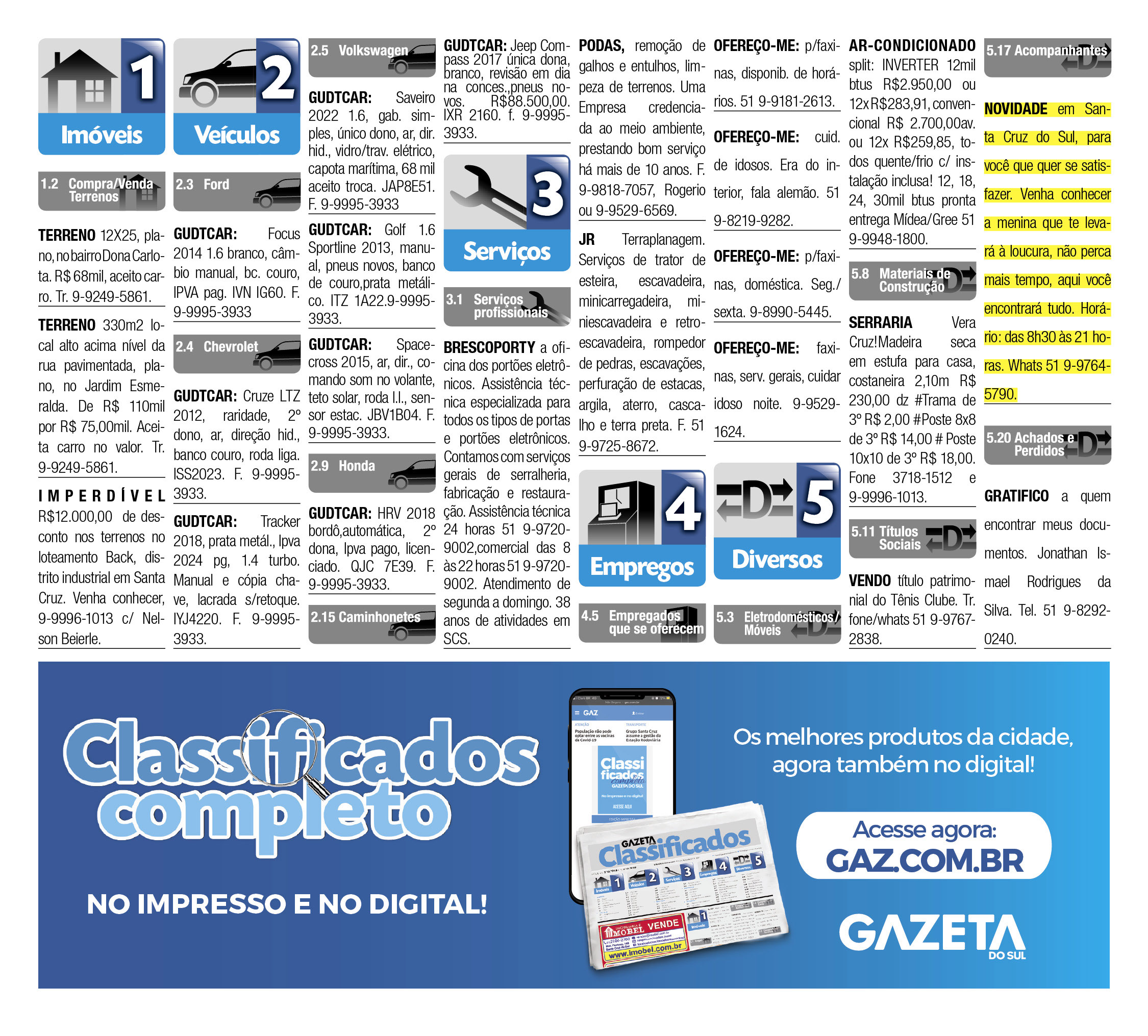 O suplemento de Classificados, que circula nas edições de terças, quintas e sábados, é um dos mais tradicionais da Gazeta do Sul, como vitrine e canal de negócios, de oferta, compra e venda em toda a região central do Rio Grande do Sul. E, para enriquecer pesquisas de produtos e serviços e possibilitar resultado ainda melhor a usuários e parceiros, nos anúncios de clientes cadastrados, o leitor tem acesso direto com link ao site do anunciante, onde poderá verificar mais detalhes sobre os itens. Confira as ofertas: