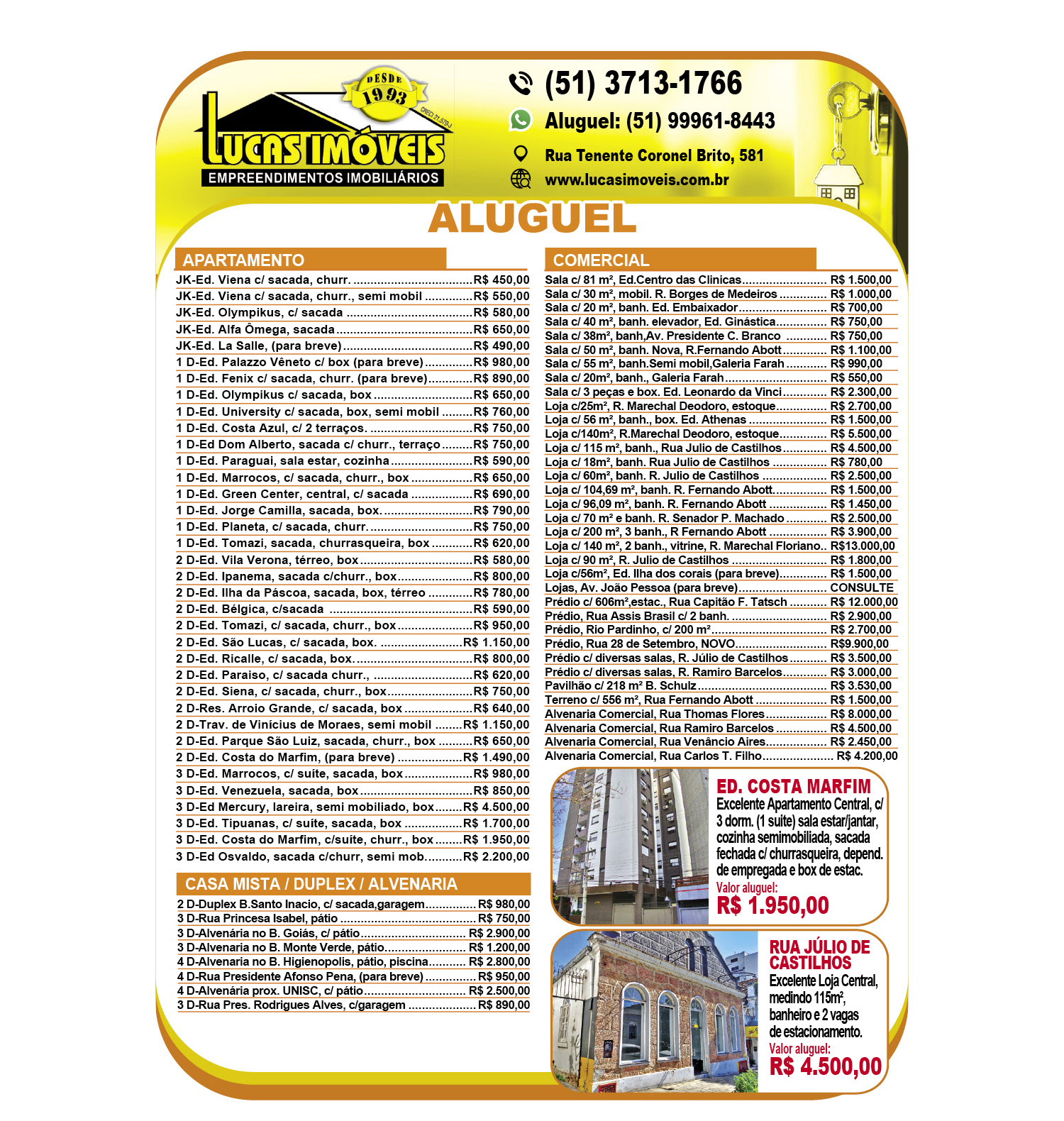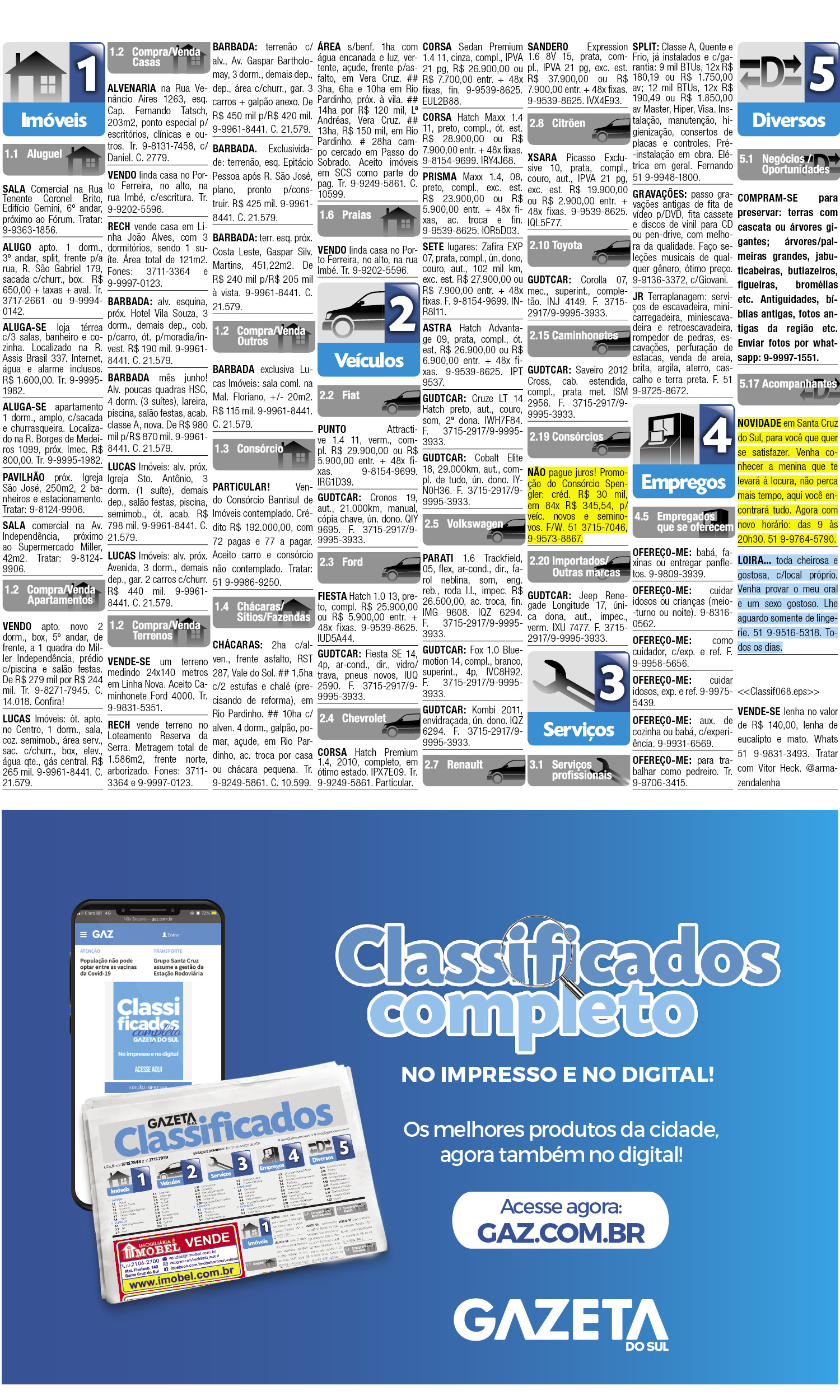 O suplemento de Classificados, que circula nas edições de terças, quintas e sábados, é um dos mais tradicionais da Gazeta do Sul, como vitrine e canal de negócios, de oferta, compra e venda em toda a região central do Rio Grande do Sul. E, para enriquecer pesquisas de produtos e serviços e possibilitar resultado ainda melhor a usuários e parceiros, nos anúncios de clientes cadastrados, o leitor tem acesso direto com link ao site do anunciante, onde poderá verificar mais detalhes sobre os itens. Confira: