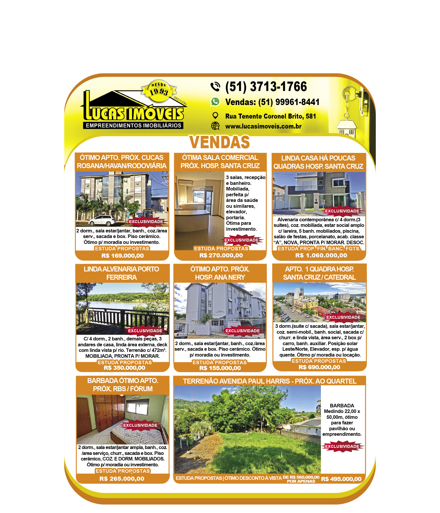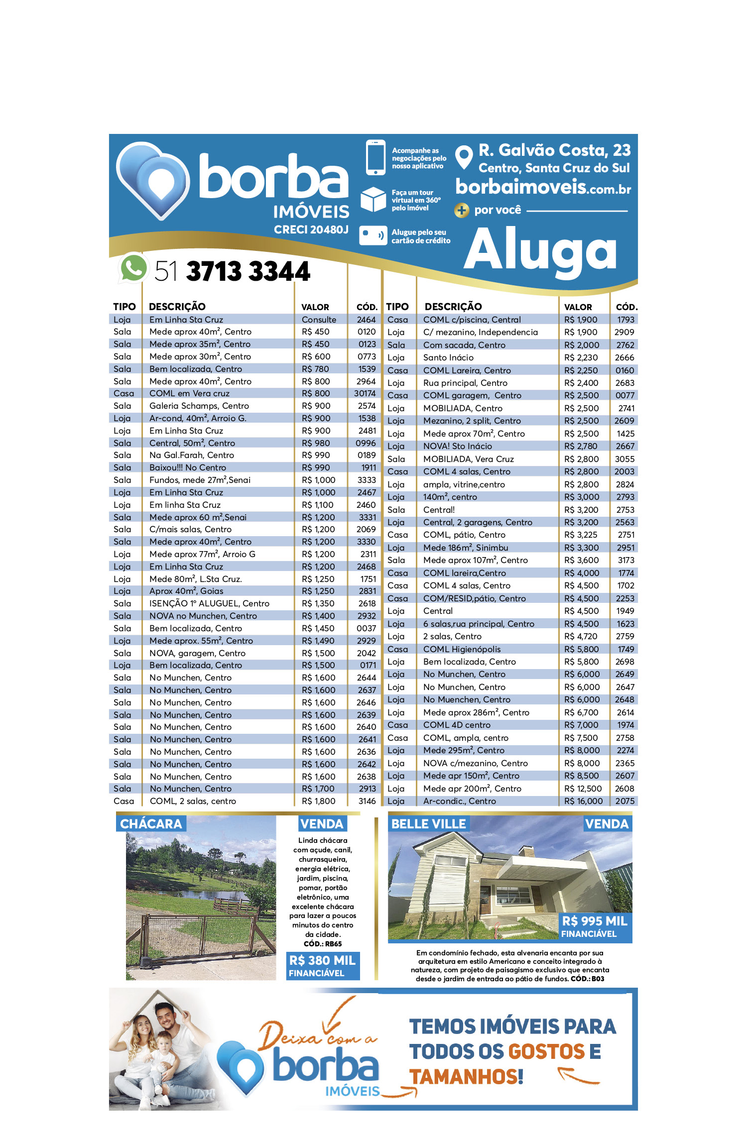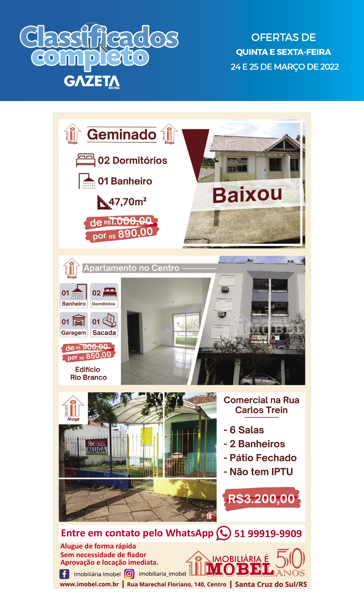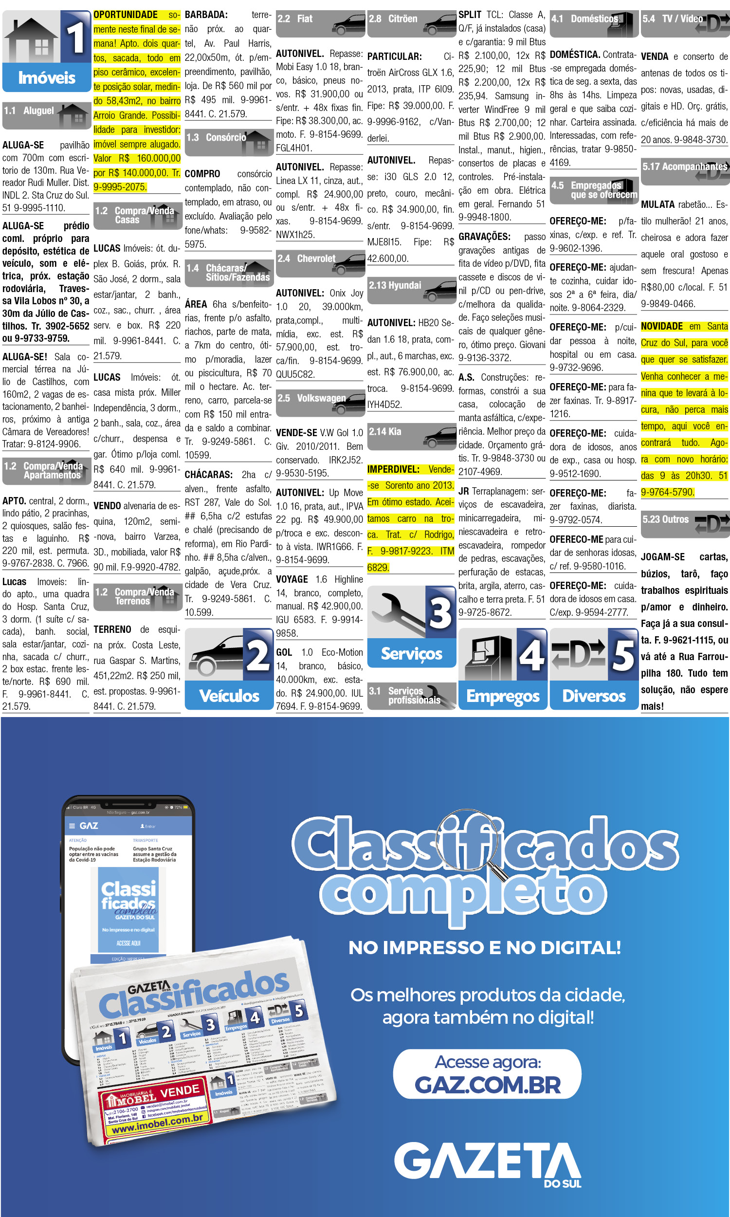 O suplemento de Classificados, que circula nas edições de terças, quintas e sábados, é um dos mais tradicionais da Gazeta do Sul, como vitrine e canal de negócios, de oferta, compra e venda em toda a região central do Rio Grande do Sul. E, para enriquecer pesquisas de produtos e serviços e possibilitar resultado ainda melhor a usuários e parceiros, nos anúncios de clientes cadastrados, o leitor tem acesso direto com link ao site do anunciante, onde poderá verificar mais detalhes sobre os itens. Confira as ofertas: