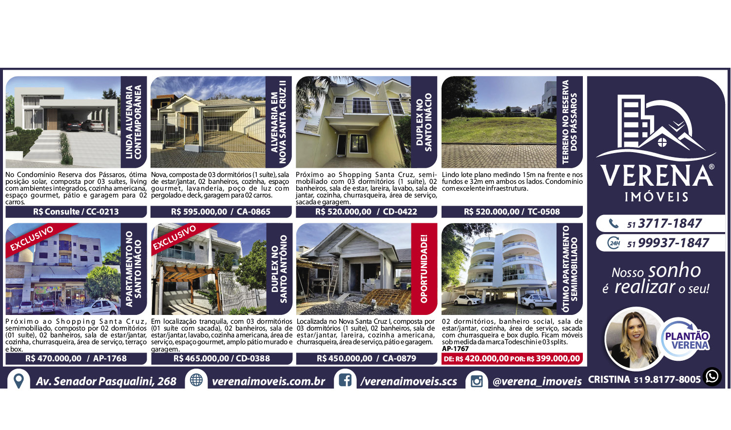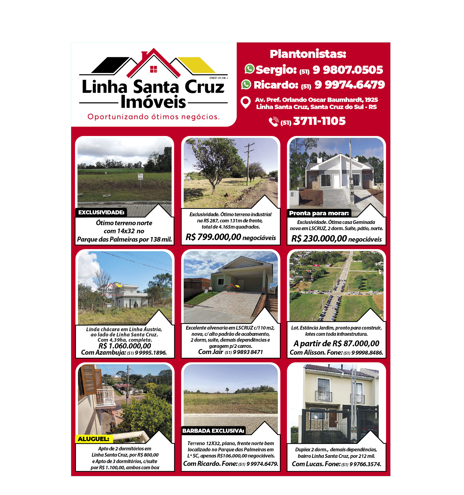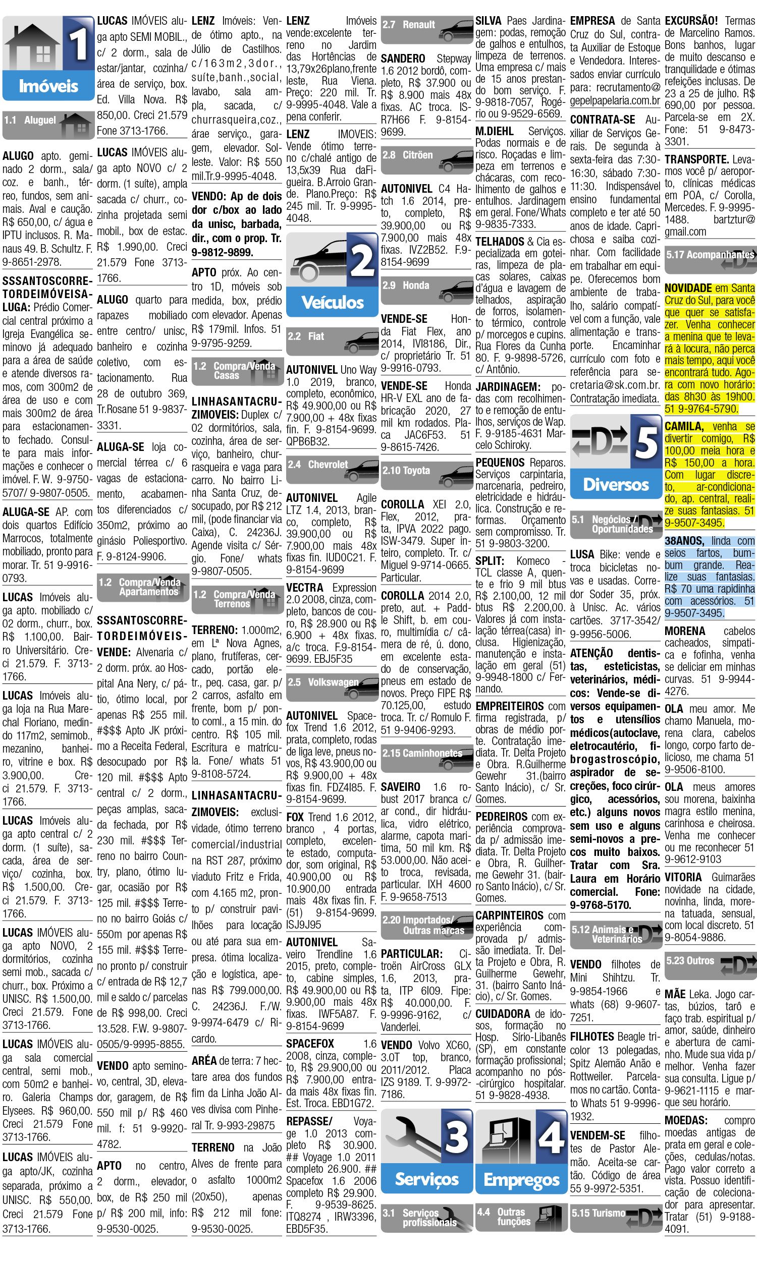 O suplemento de Classificados, que circula nas edições de terças, quintas e sábados, é um dos mais tradicionais da Gazeta do Sul, como vitrine e canal de negócios, de oferta, compra e venda em toda a região central do Rio Grande do Sul. E, para enriquecer pesquisas de produtos e serviços e possibilitar resultado ainda melhor a usuários e parceiros, nos anúncios de clientes cadastrados, o leitor tem acesso direto com link ao site do anunciante, onde poderá verificar mais detalhes sobre os itens. Confira as ofertas: