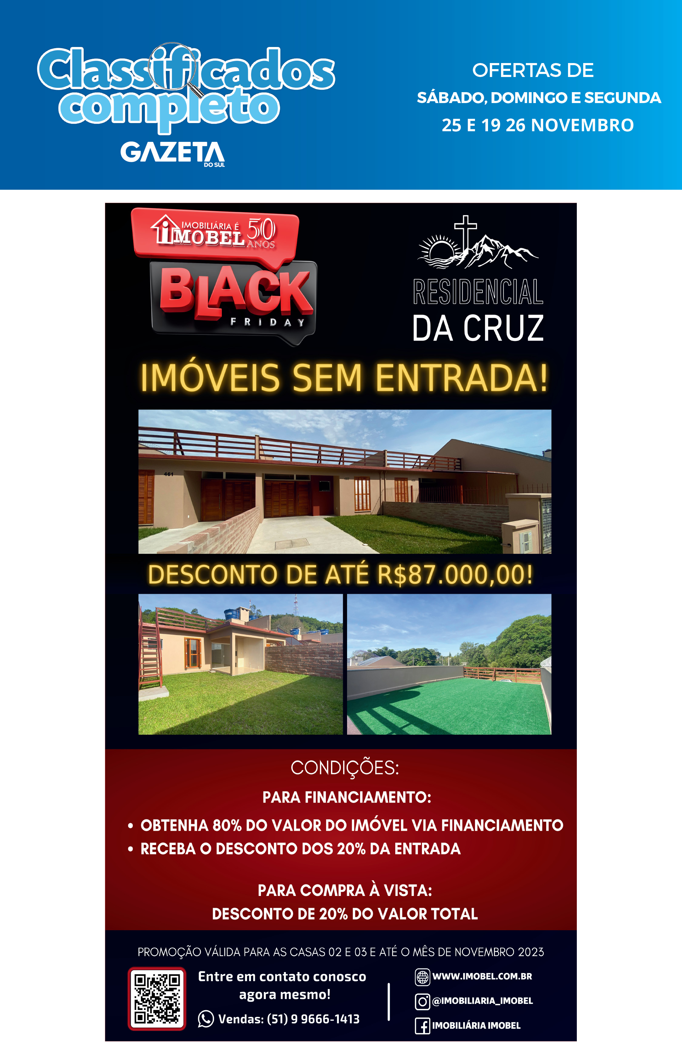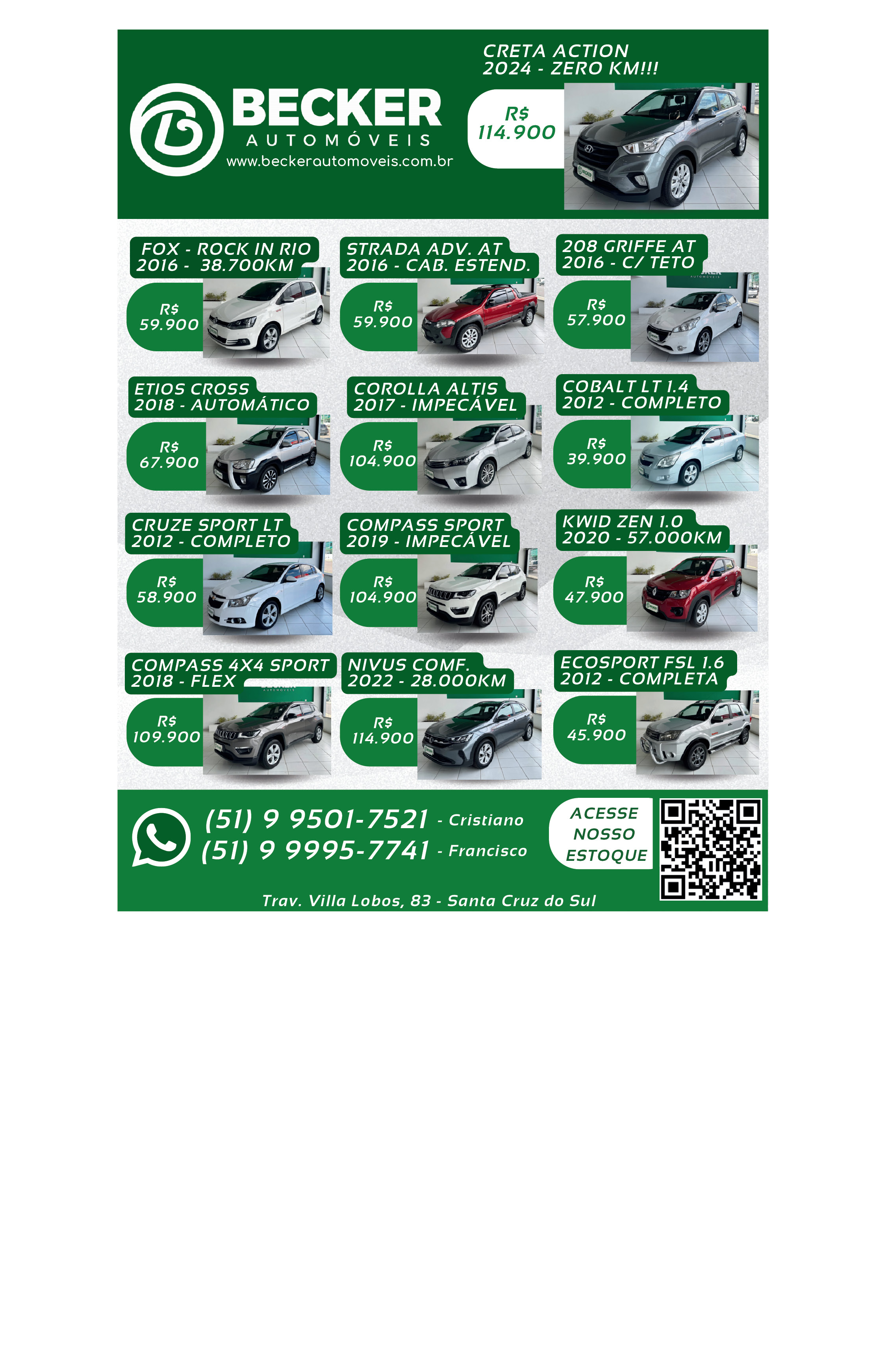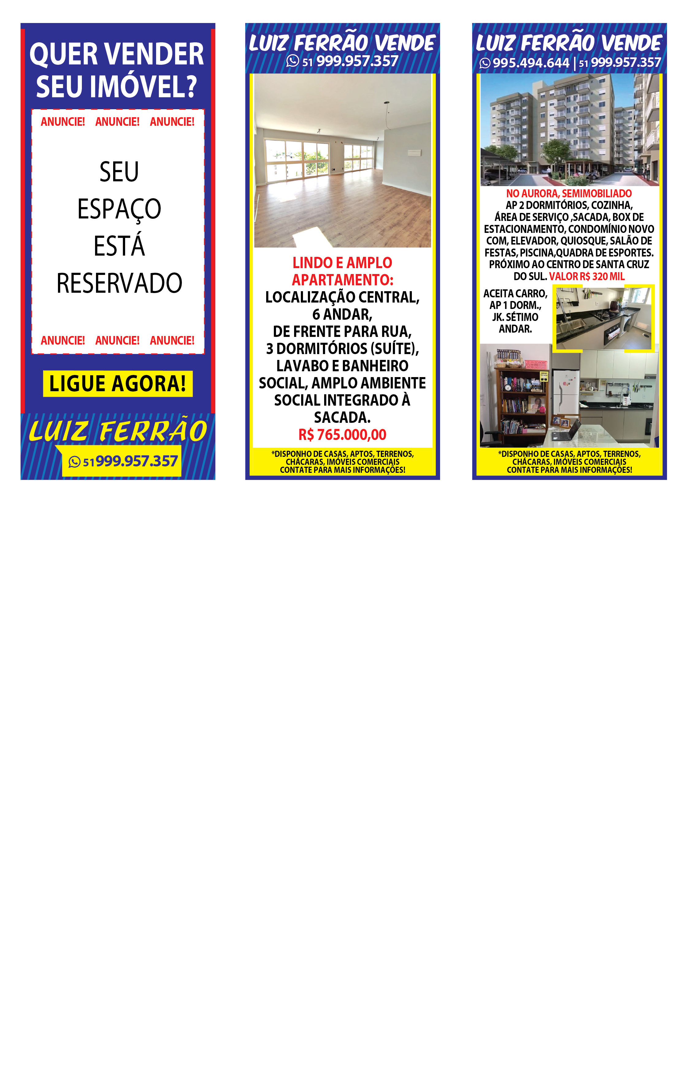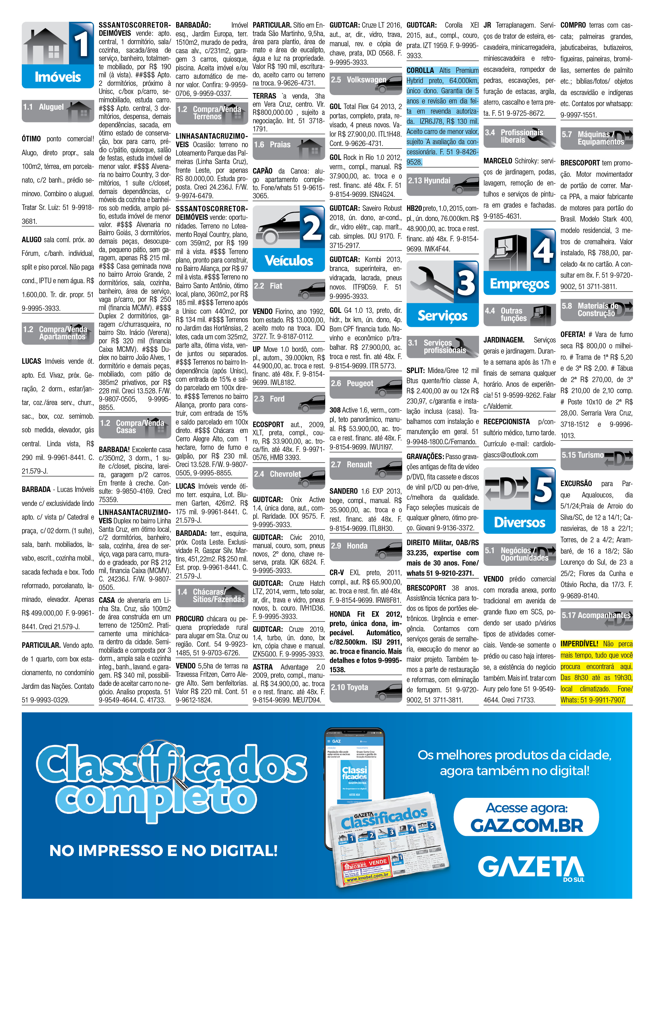 O suplemento de Classificados, que circula nas edições de terças, quintas e sábados, é um dos mais tradicionais da Gazeta do Sul, como vitrine e canal de negócios, de oferta, compra e venda em toda a região central do Rio Grande do Sul. E, para enriquecer pesquisas de produtos e serviços e possibilitar resultado ainda melhor a usuários e parceiros, nos anúncios de clientes cadastrados, o leitor tem acesso direto com link ao site do anunciante, onde poderá verificar mais detalhes sobre os itens. Confira as ofertas:
