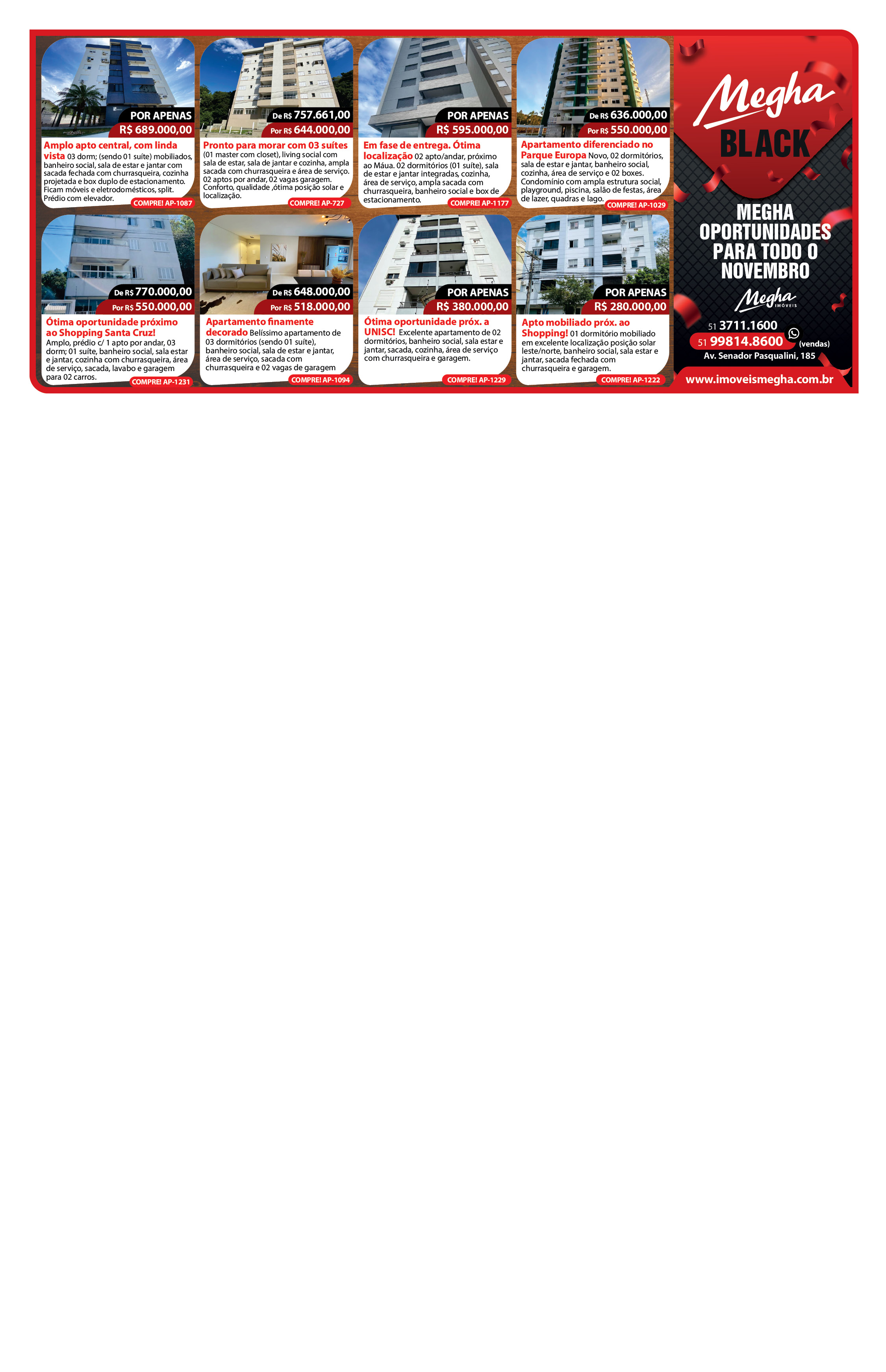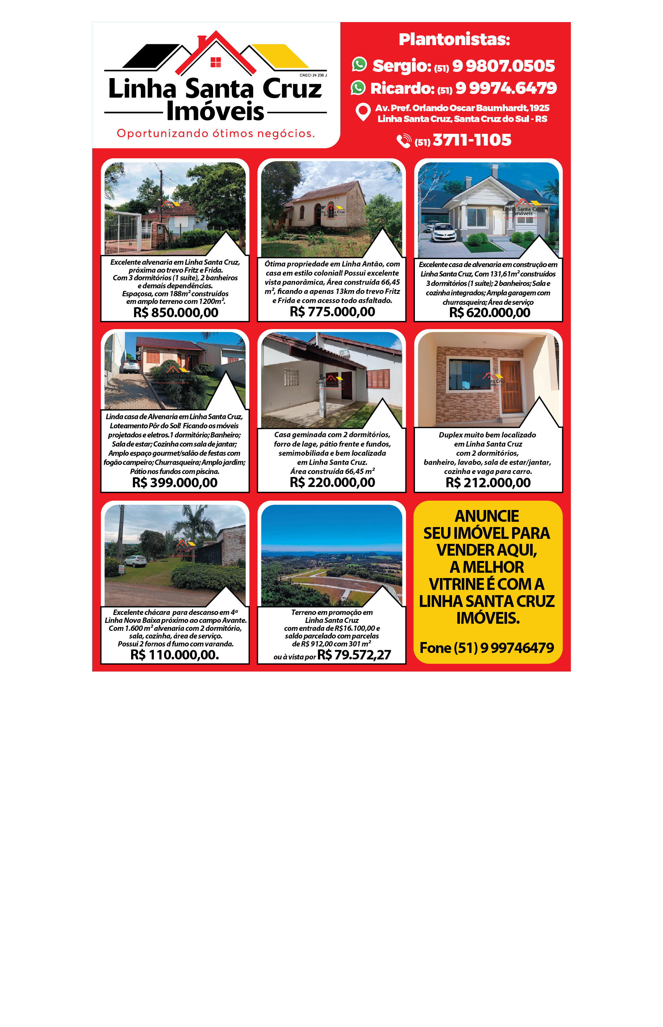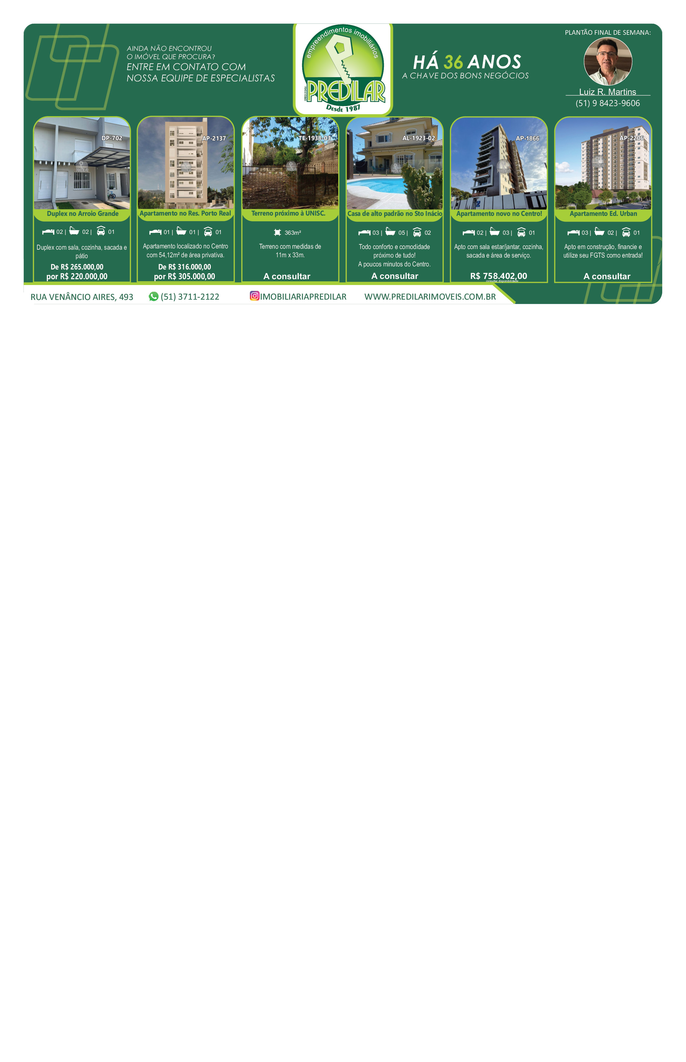 O suplemento de Classificados, que circula nas edições de terças, quintas e sábados, é um dos mais tradicionais da Gazeta do Sul, como vitrine e canal de negócios, de oferta, compra e venda em toda a região central do Rio Grande do Sul. E, para enriquecer pesquisas de produtos e serviços e possibilitar resultado ainda melhor a usuários e parceiros, nos anúncios de clientes cadastrados, o leitor tem acesso direto com link ao site do anunciante, onde poderá verificar mais detalhes sobre os itens. Confira as ofertas: