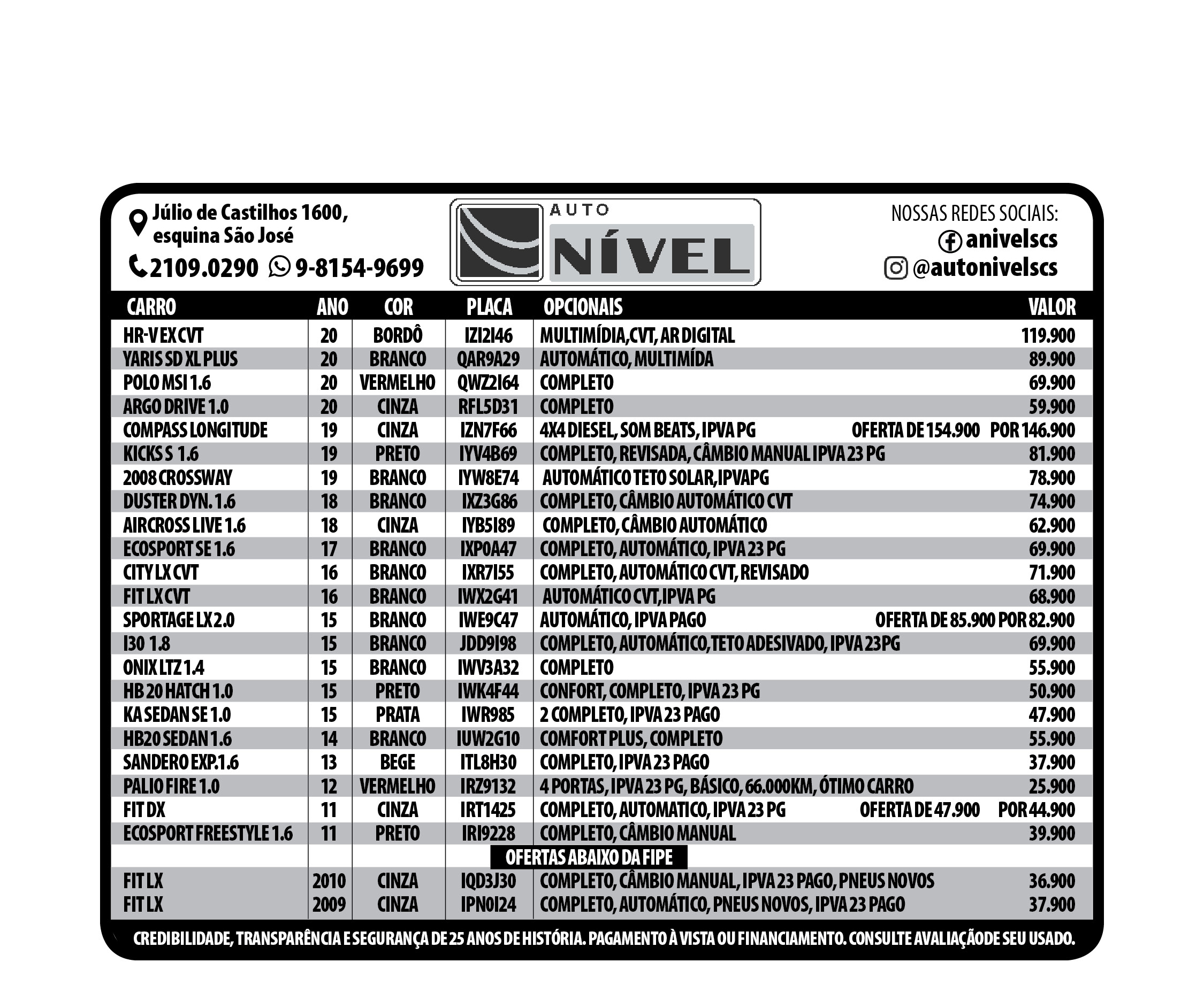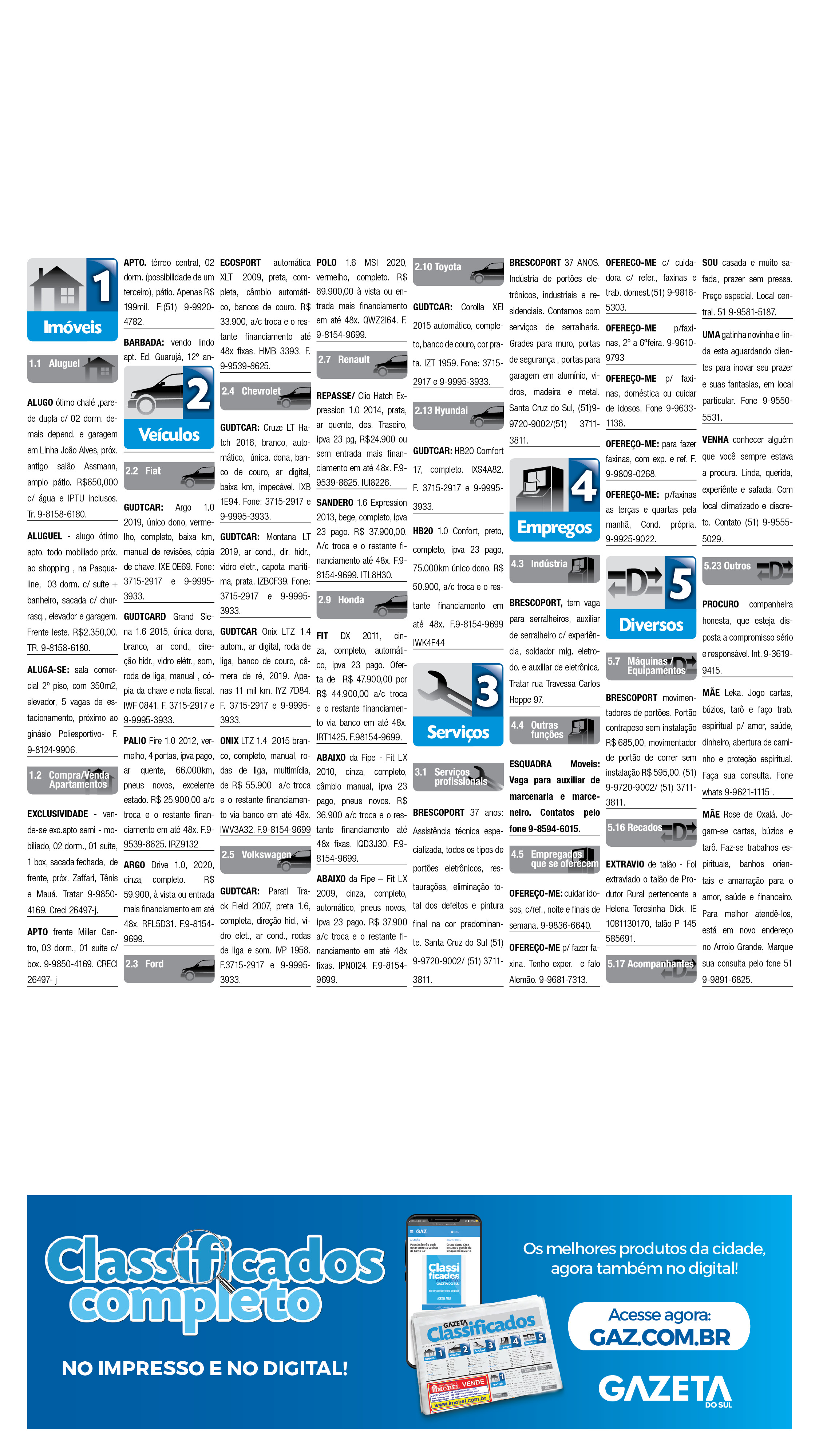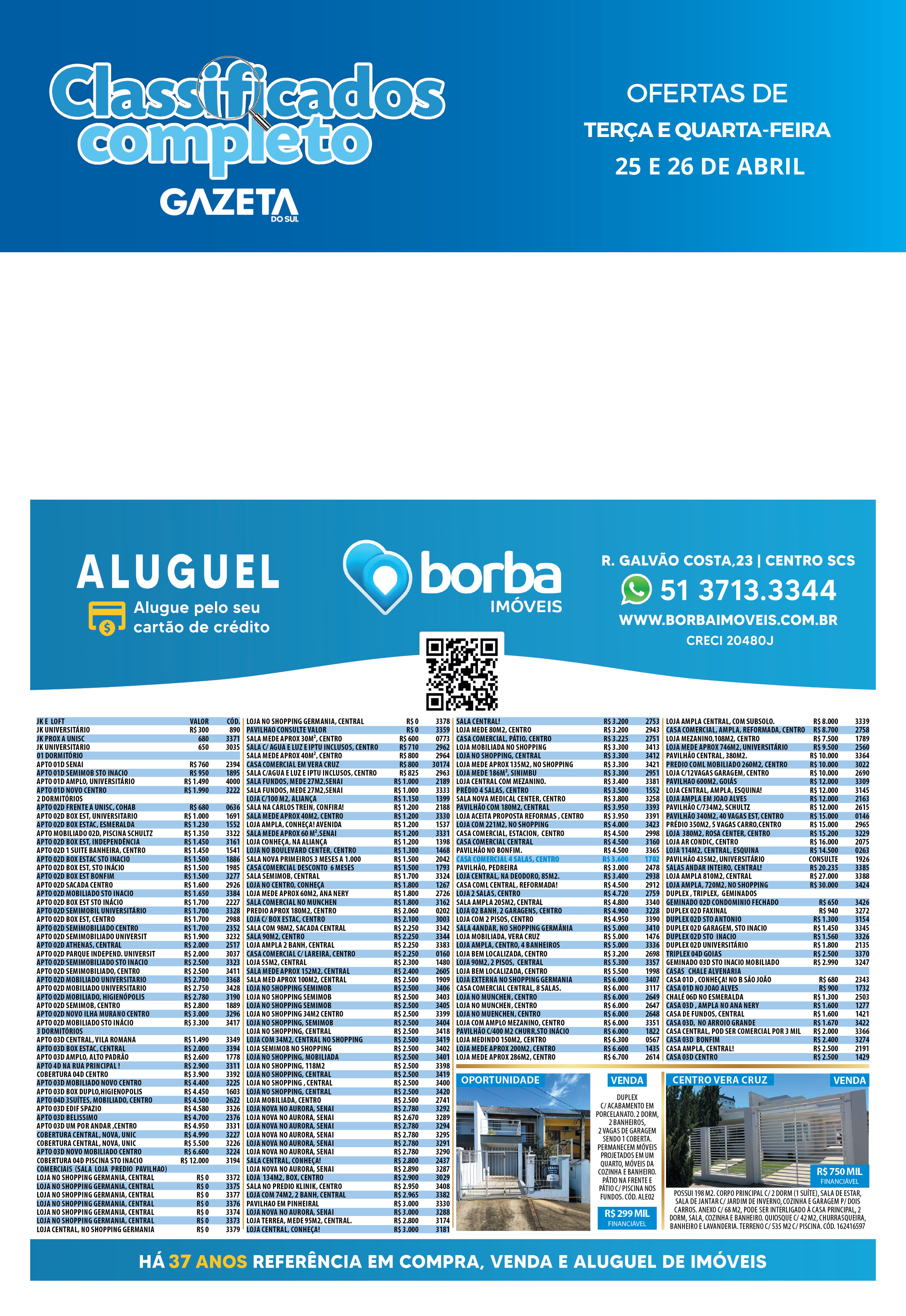 O suplemento de Classificados, que circula nas edições de terças, quintas e sábados, é um dos mais tradicionais da Gazeta do Sul, como vitrine e canal de negócios, de oferta, compra e venda em toda a região central do Rio Grande do Sul. E, para enriquecer pesquisas de produtos e serviços e possibilitar resultado ainda melhor a usuários e parceiros, nos anúncios de clientes cadastrados, o leitor tem acesso direto com link ao site do anunciante, onde poderá verificar mais detalhes sobre os itens. Confira as ofertas: