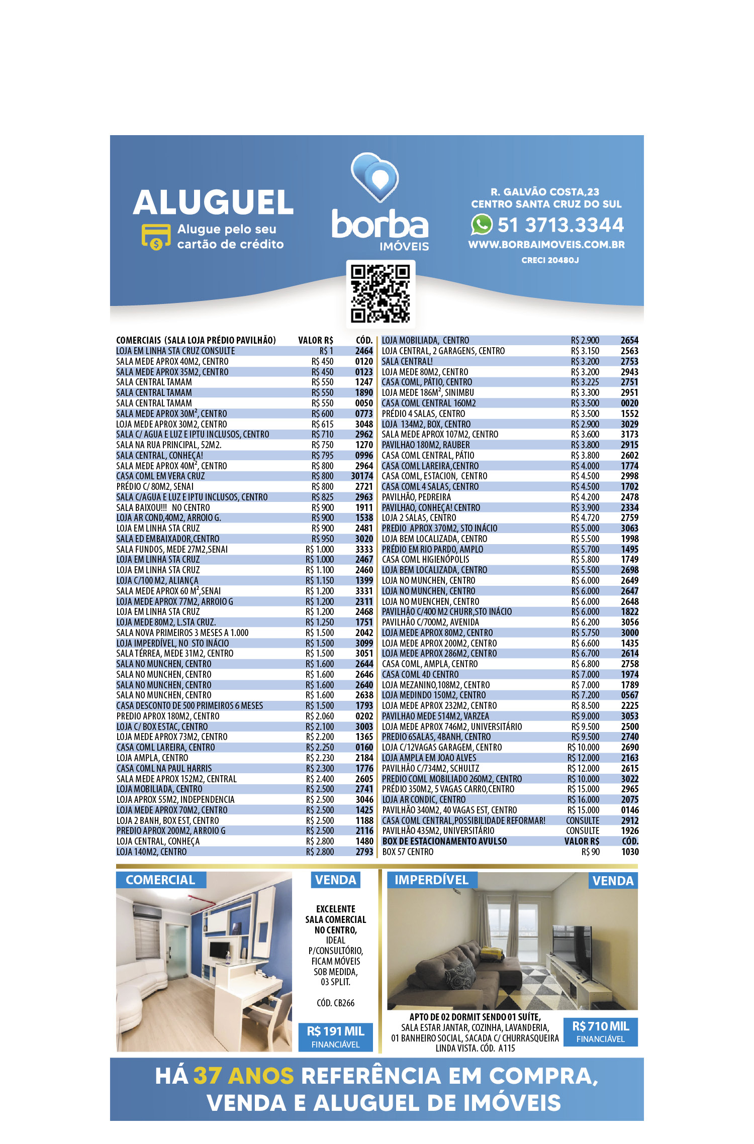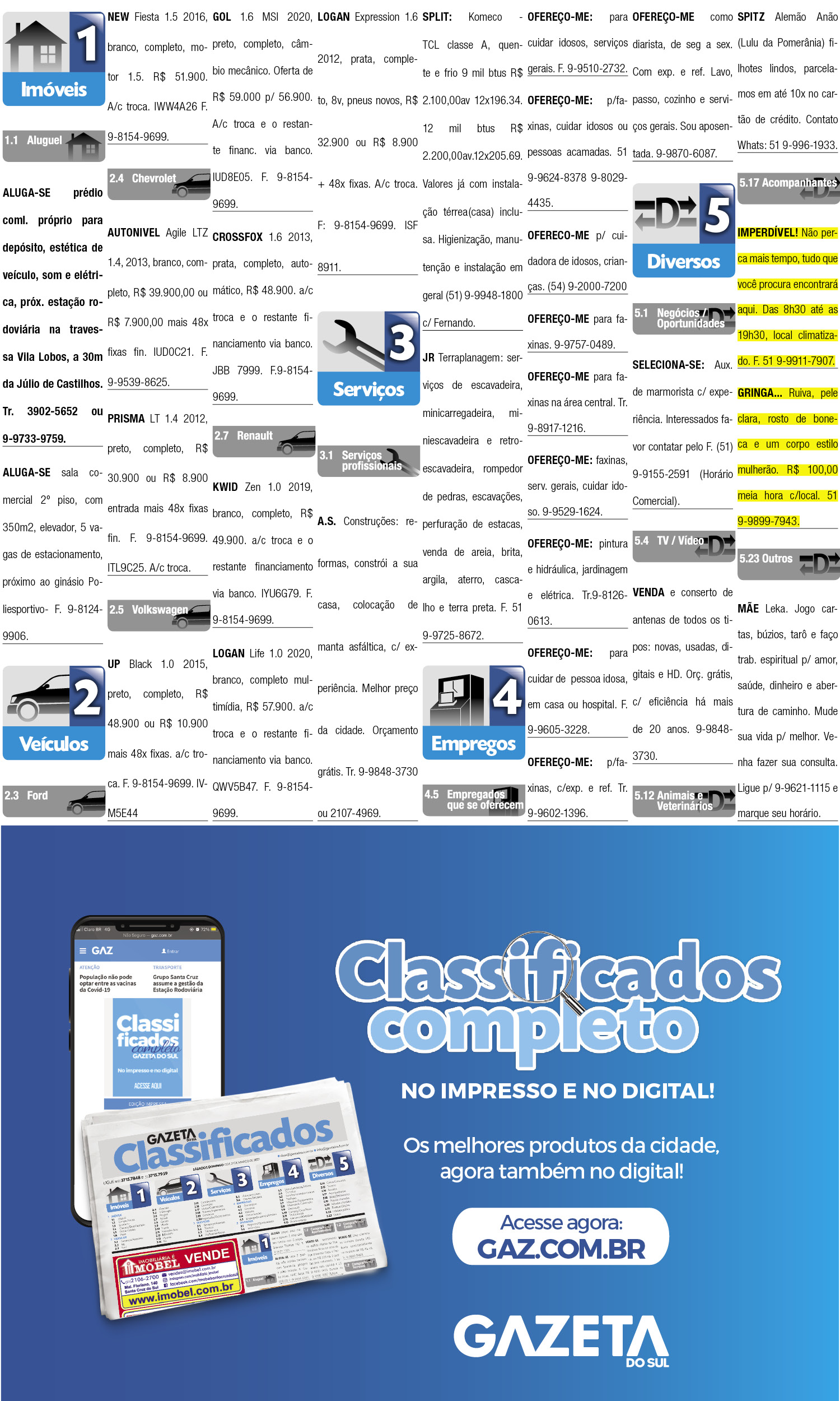 O suplemento de Classificados, que circula nas edições de terças, quintas e sábados, é um dos mais tradicionais da Gazeta do Sul, como vitrine e canal de negócios, de oferta, compra e venda em toda a região central do Rio Grande do Sul. E, para enriquecer pesquisas de produtos e serviços e possibilitar resultado ainda melhor a usuários e parceiros, nos anúncios de clientes cadastrados, o leitor tem acesso direto com link ao site do anunciante, onde poderá verificar mais detalhes sobre os itens. Confira as ofertas: