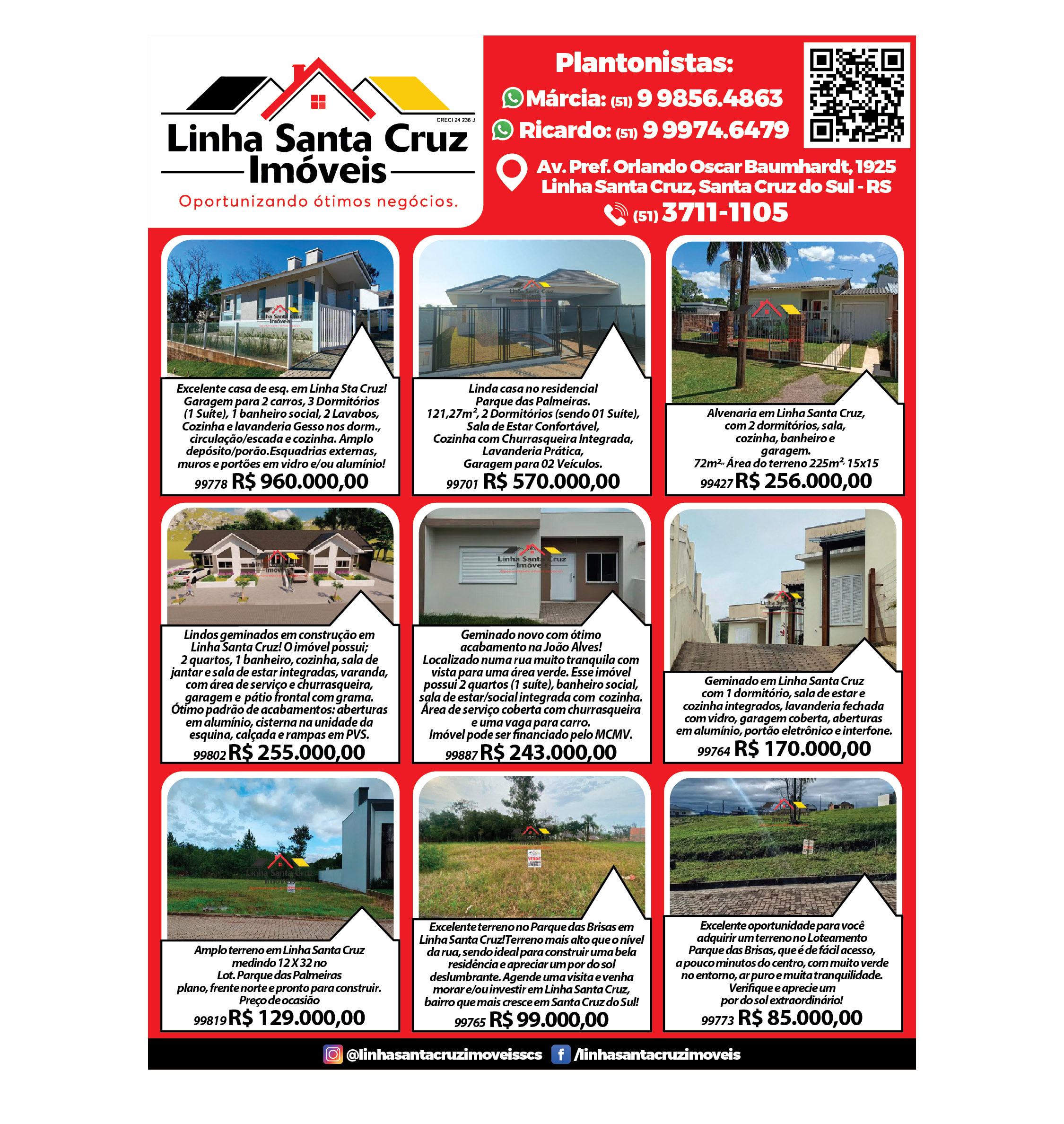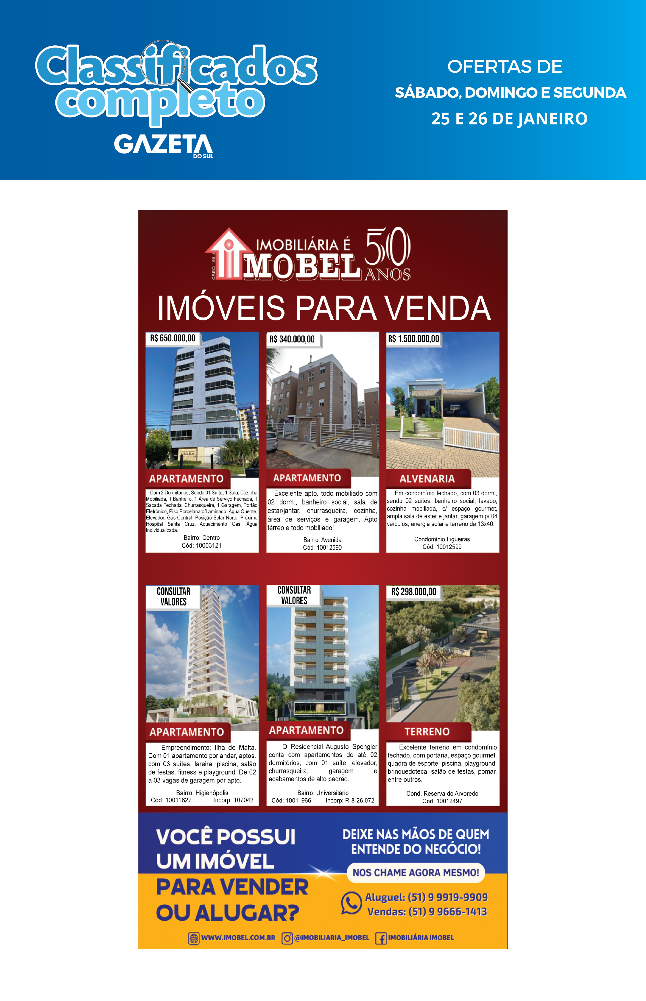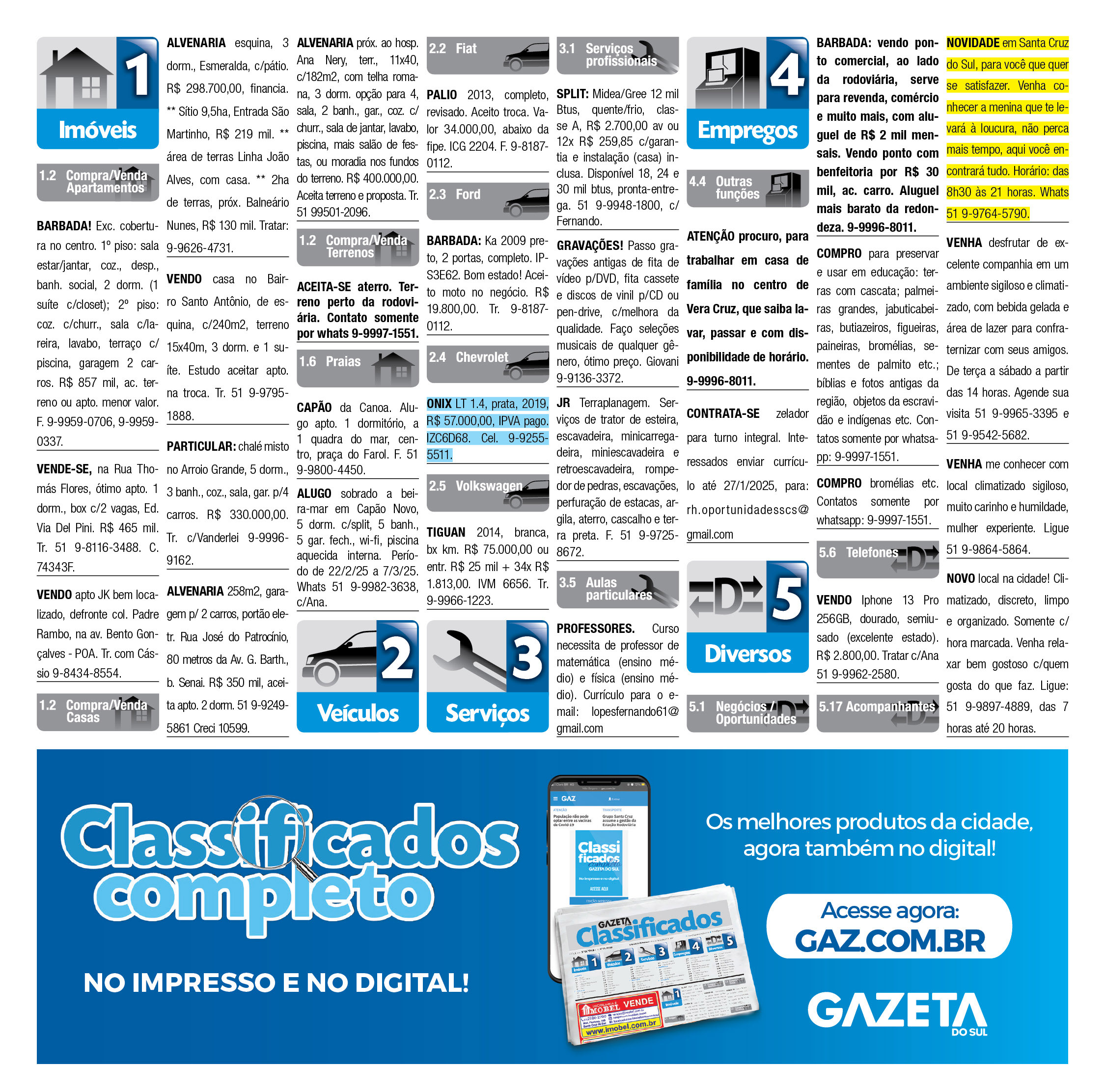O suplemento de Classificados, que circula nas edições de terças, quintas e sábados, é um dos mais tradicionais da Gazeta do Sul, como vitrine e canal de negócios, de oferta, compra e venda em toda a região central do Rio Grande do Sul. E, para enriquecer pesquisas de produtos e serviços e possibilitar resultado ainda melhor a usuários e parceiros, nos anúncios de clientes cadastrados, o leitor tem acesso direto com link ao site do anunciante, onde poderá verificar mais detalhes sobre os itens. Confira as ofertas: