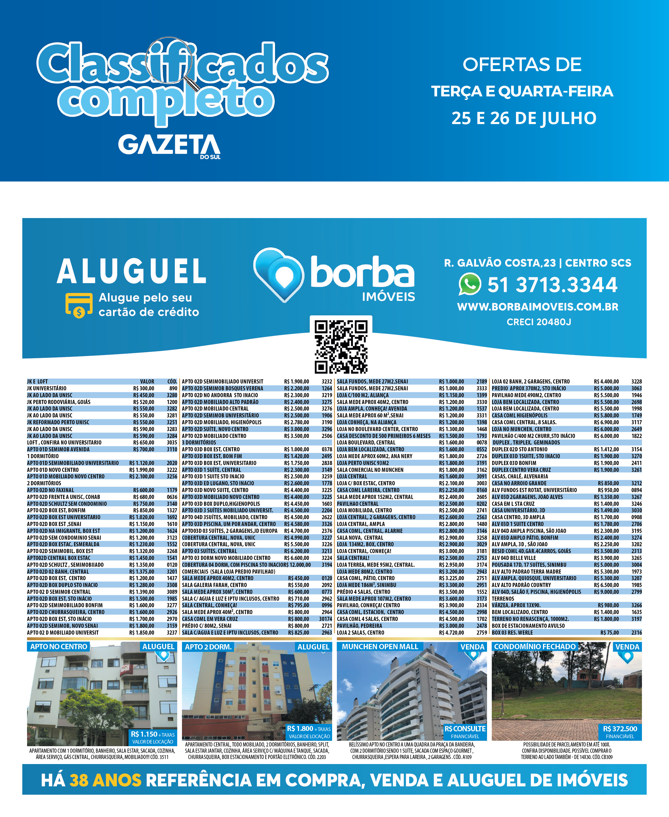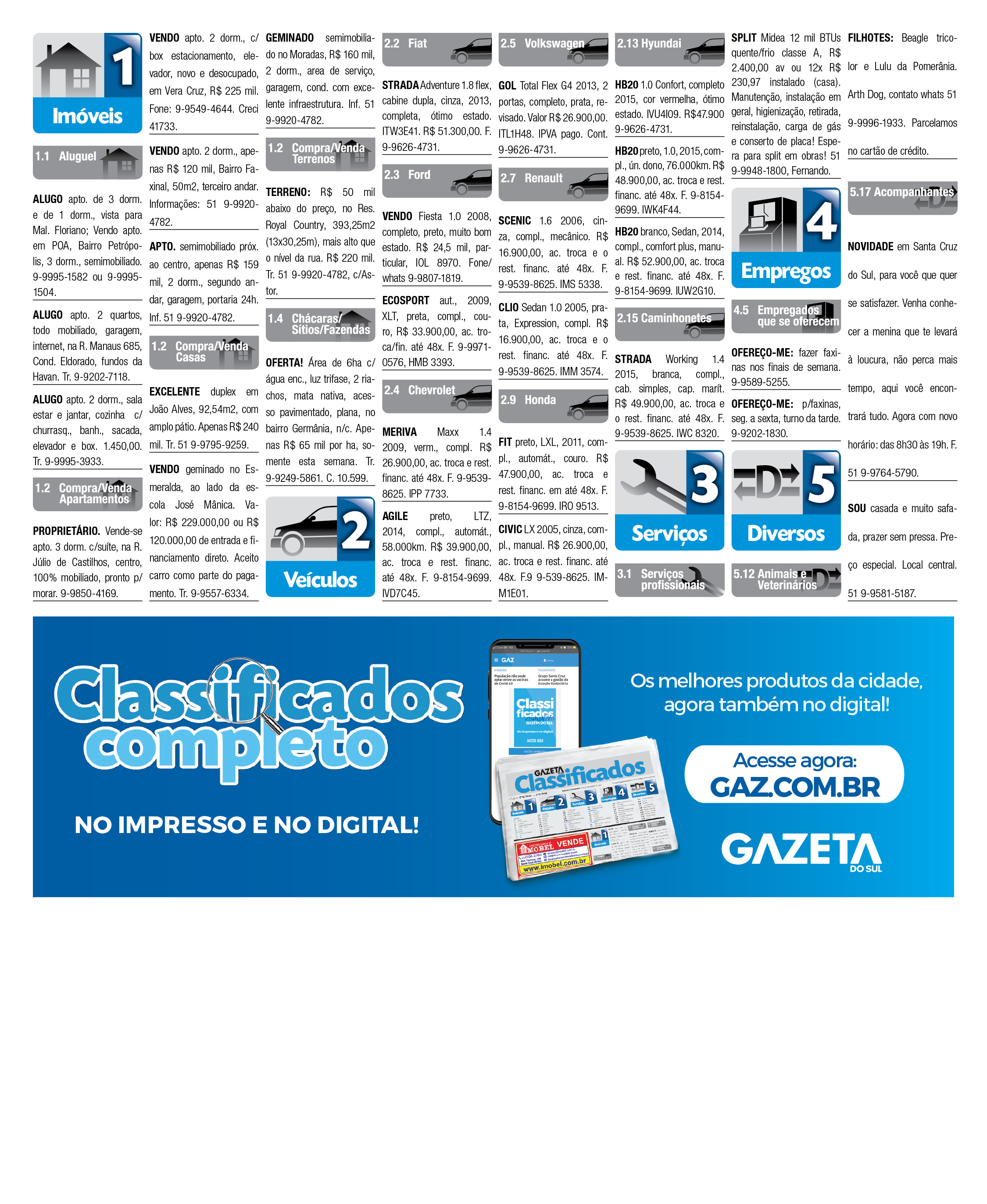 O suplemento de Classificados, que circula nas edições de terças, quintas e sábados, é um dos mais tradicionais da Gazeta do Sul, como vitrine e canal de negócios, de oferta, compra e venda em toda a região central do Rio Grande do Sul. E, para enriquecer pesquisas de produtos e serviços e possibilitar resultado ainda melhor a usuários e parceiros, nos anúncios de clientes cadastrados, o leitor tem acesso direto com link ao site do anunciante, onde poderá verificar mais detalhes sobre os itens. Confira as ofertas: