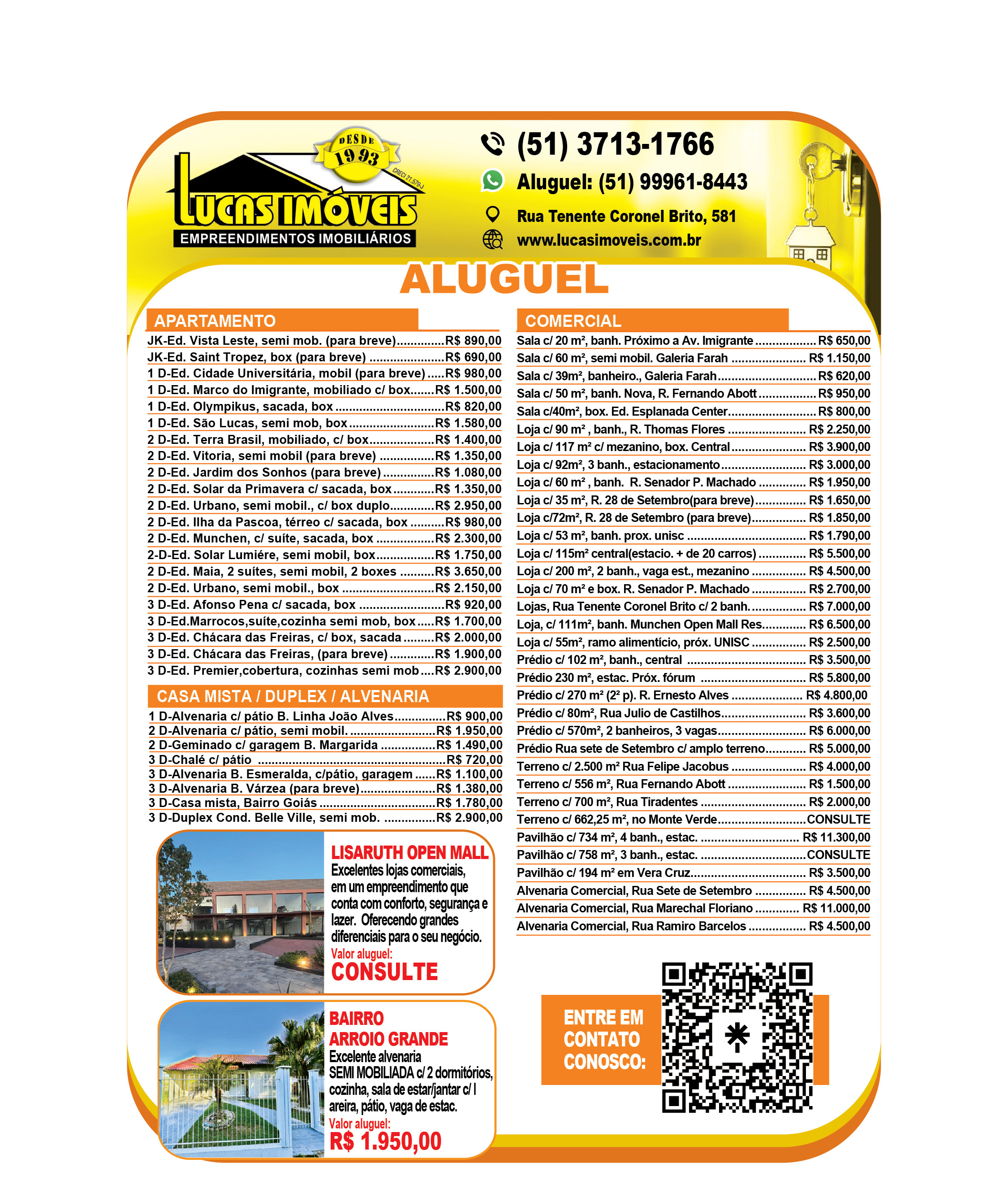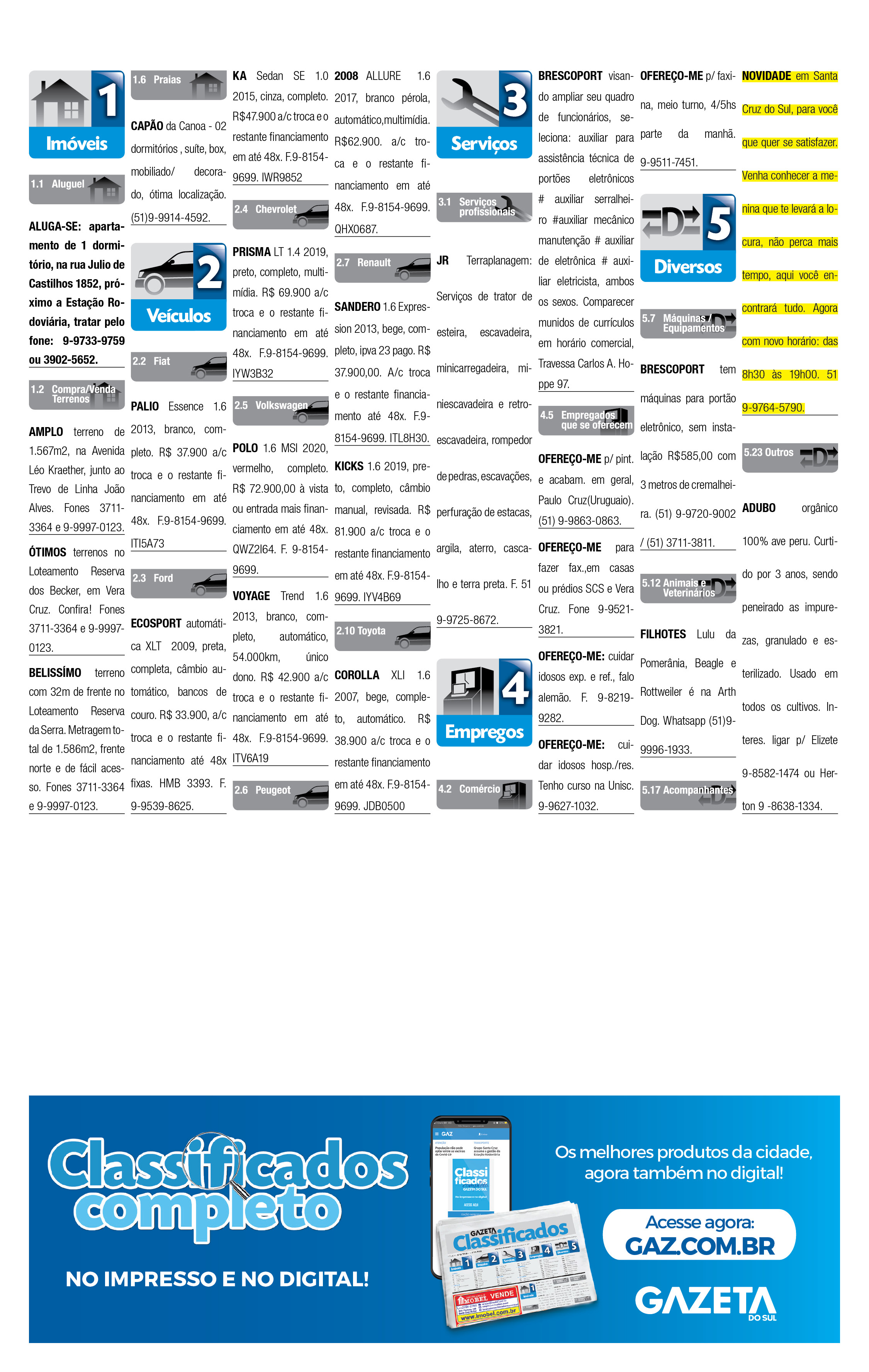 O suplemento de Classificados, que circula nas edições de terças, quintas e sábados, é um dos mais tradicionais da Gazeta do Sul, como vitrine e canal de negócios, de oferta, compra e venda em toda a região central do Rio Grande do Sul. E, para enriquecer pesquisas de produtos e serviços e possibilitar resultado ainda melhor a usuários e parceiros, nos anúncios de clientes cadastrados, o leitor tem acesso direto com link ao site do anunciante, onde poderá verificar mais detalhes sobre os itens. Confira as ofertas: