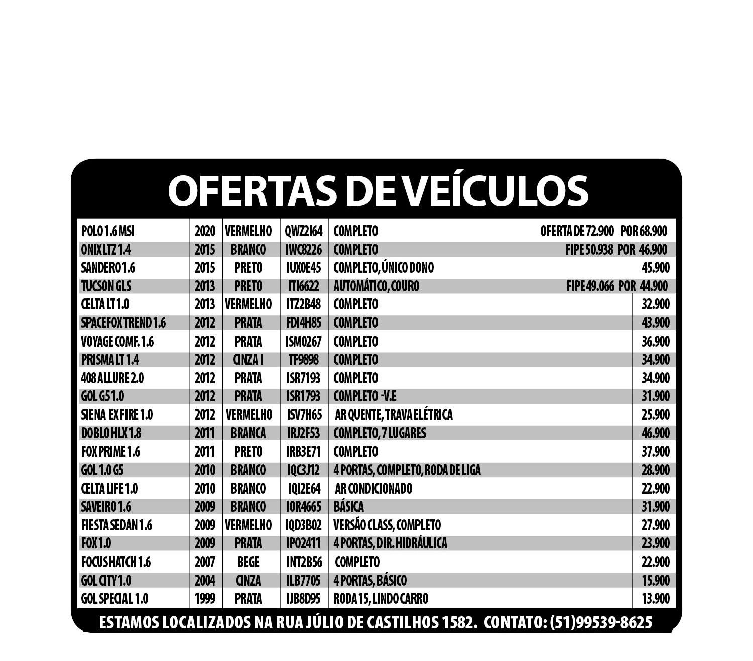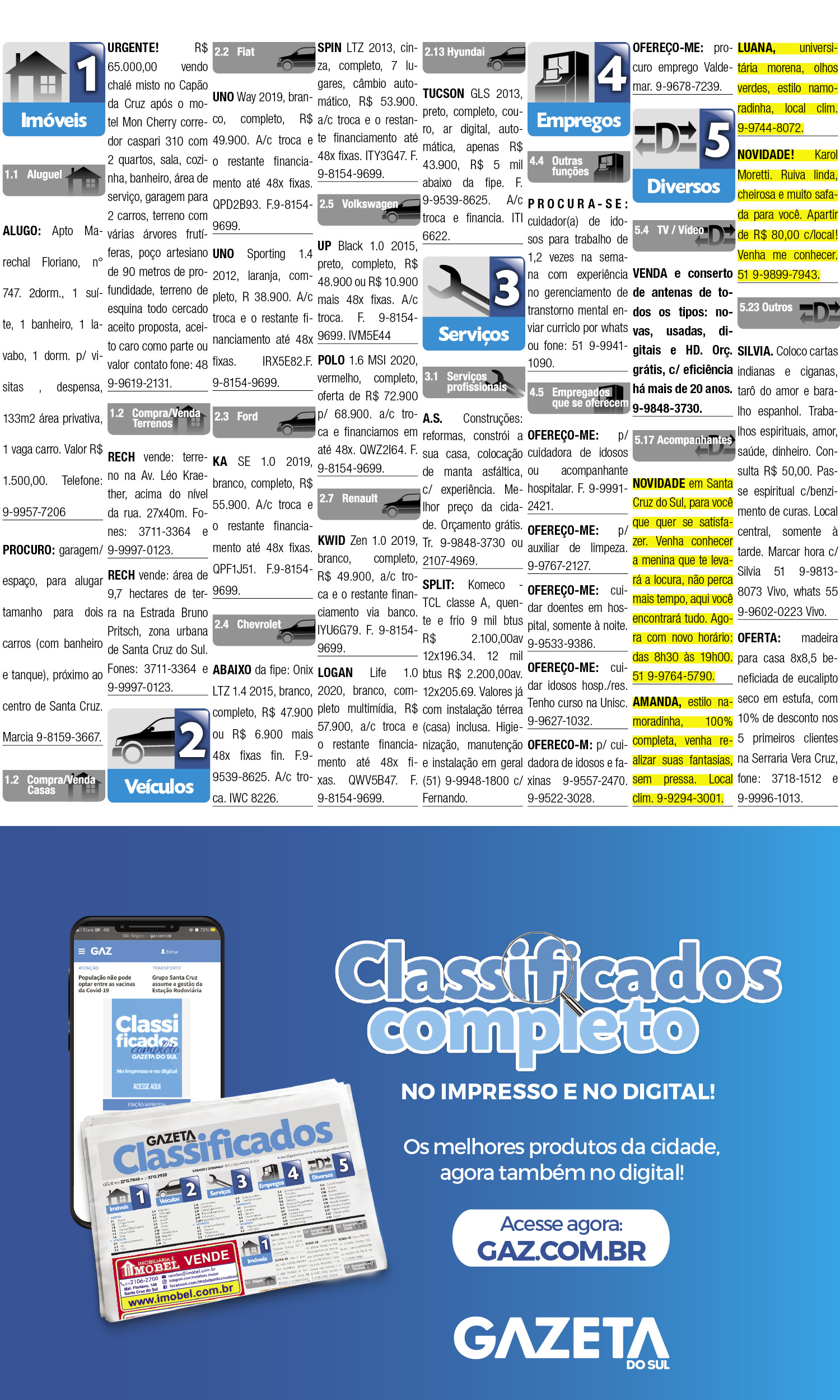 O suplemento de Classificados, que circula nas edições de terças, quintas e sábados, é um dos mais tradicionais da Gazeta do Sul, como vitrine e canal de negócios, de oferta, compra e venda em toda a região central do Rio Grande do Sul. E, para enriquecer pesquisas de produtos e serviços e possibilitar resultado ainda melhor a usuários e parceiros, nos anúncios de clientes cadastrados, o leitor tem acesso direto com link ao site do anunciante, onde poderá verificar mais detalhes sobre os itens. Confira as ofertas:
