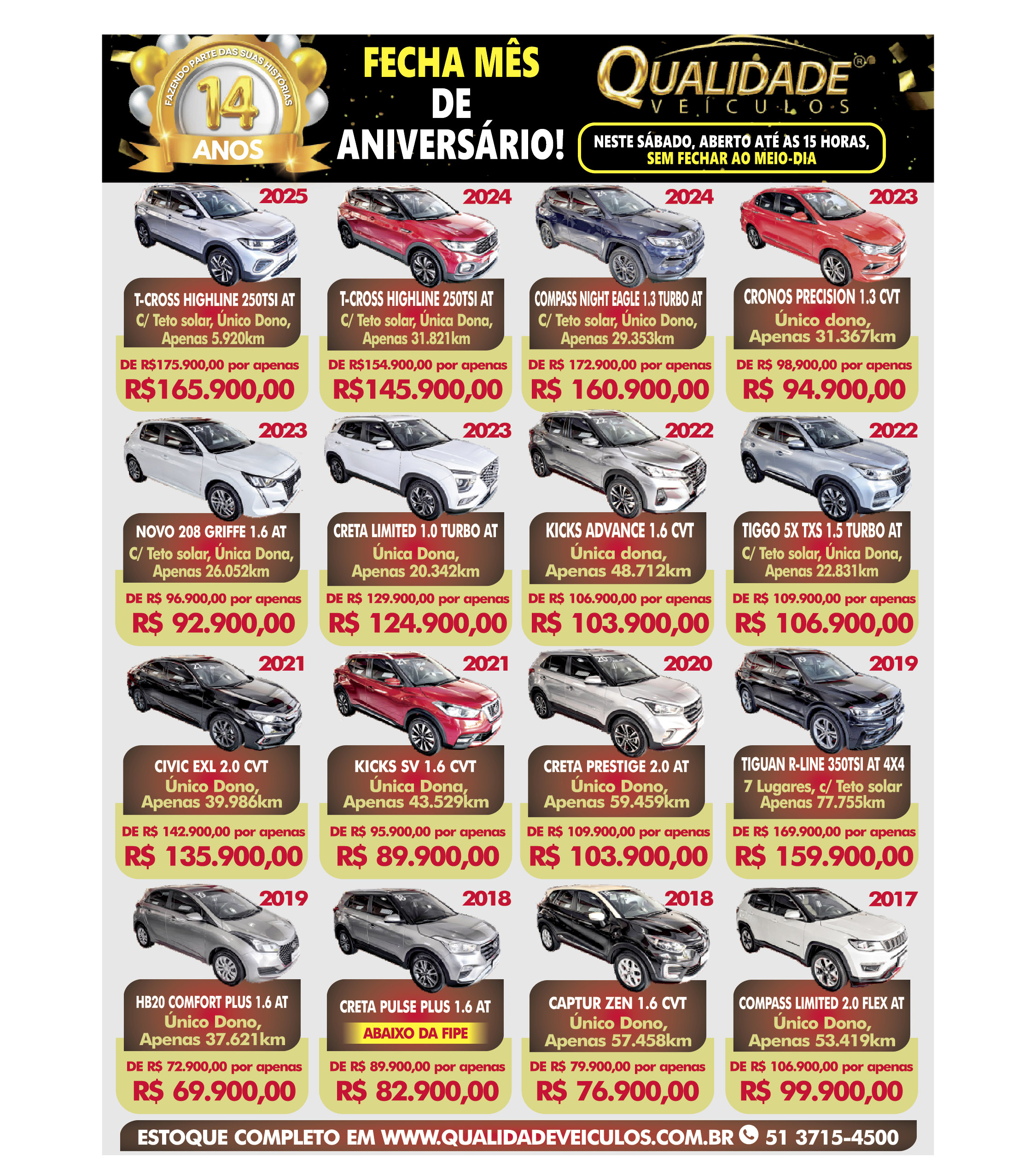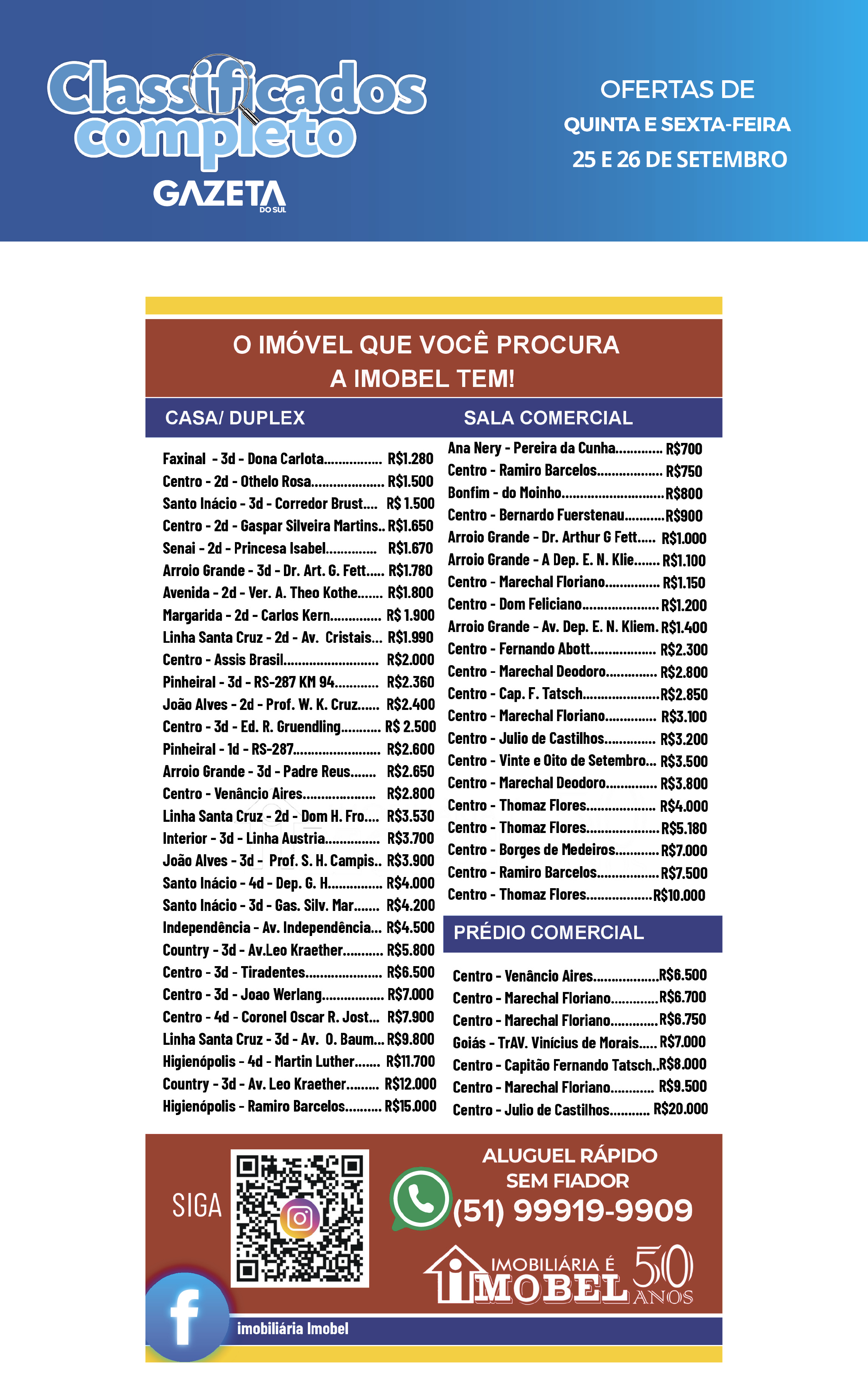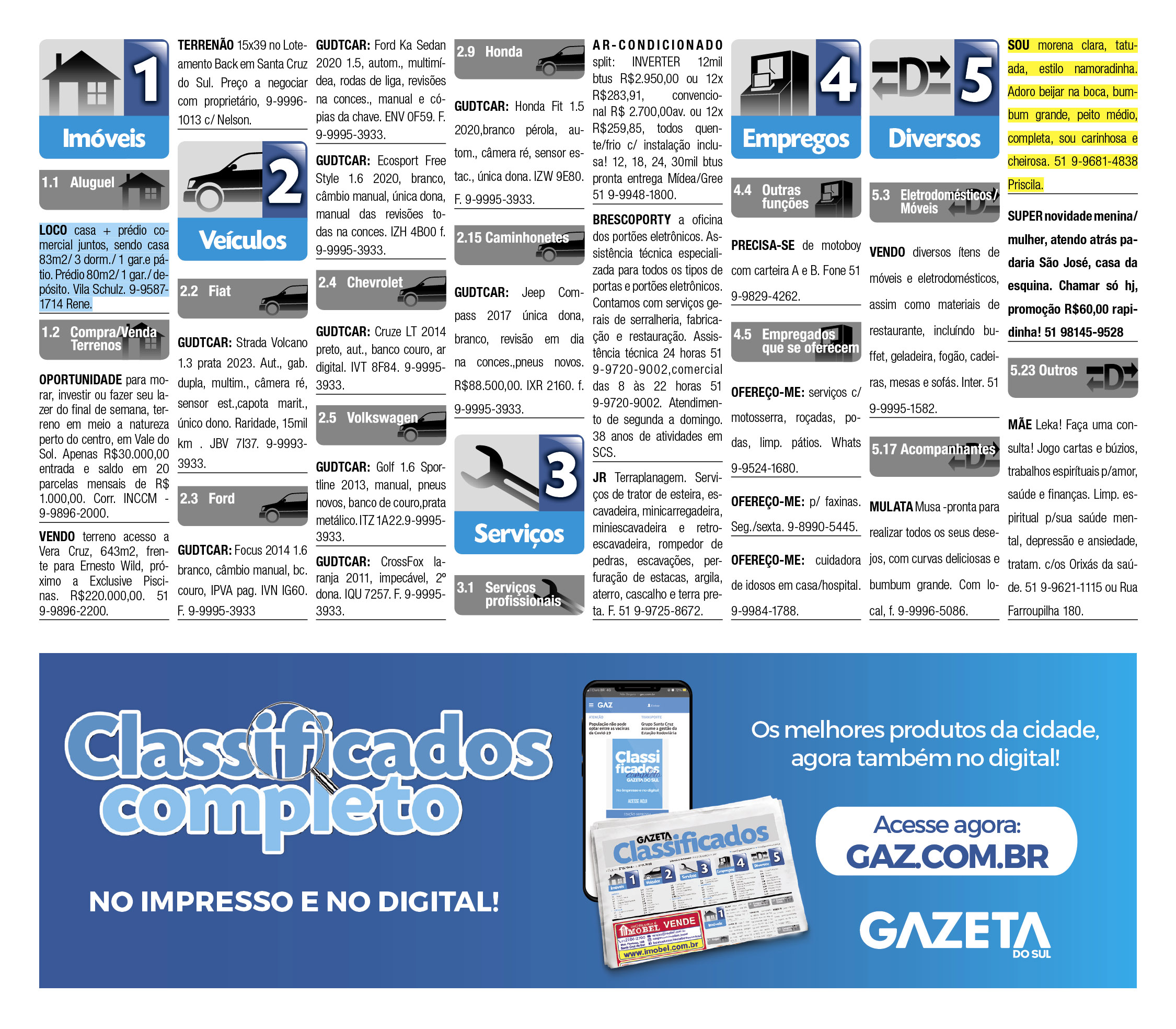 O suplemento de Classificados, que circula nas edições de terças, quintas e sábados, é um dos mais tradicionais da Gazeta do Sul, como vitrine e canal de negócios, de oferta, compra e venda em toda a região central do Rio Grande do Sul. E, para enriquecer pesquisas de produtos e serviços e possibilitar resultado ainda melhor a usuários e parceiros, nos anúncios de clientes cadastrados, o leitor tem acesso direto com link ao site do anunciante, onde poderá verificar mais detalhes sobre os itens. Confira as ofertas: