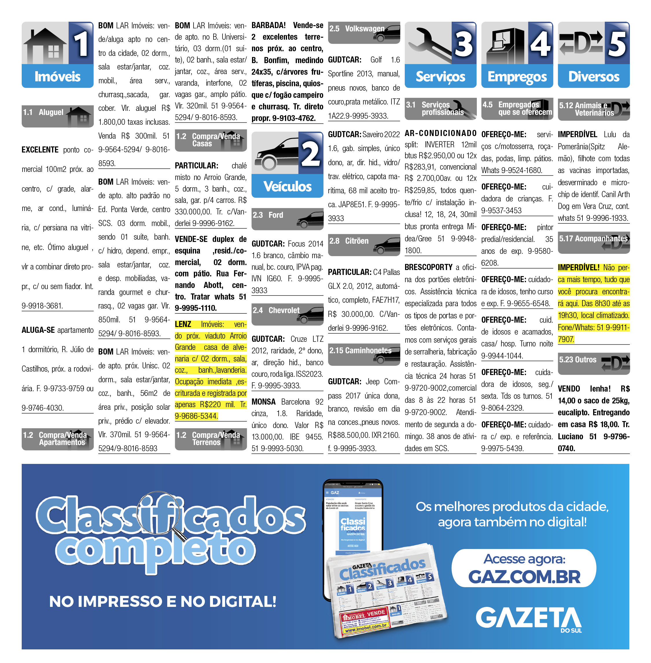 O suplemento de Classificados, que circula nas edições de terças, quintas e sábados, é um dos mais tradicionais da Gazeta do Sul, como vitrine e canal de negócios, de oferta, compra e venda em toda a região central do Rio Grande do Sul. E, para enriquecer pesquisas de produtos e serviços e possibilitar resultado ainda melhor a usuários e parceiros, nos anúncios de clientes cadastrados, o leitor tem acesso direto com link ao site do anunciante, onde poderá verificar mais detalhes sobre os itens. Confira as ofertas: