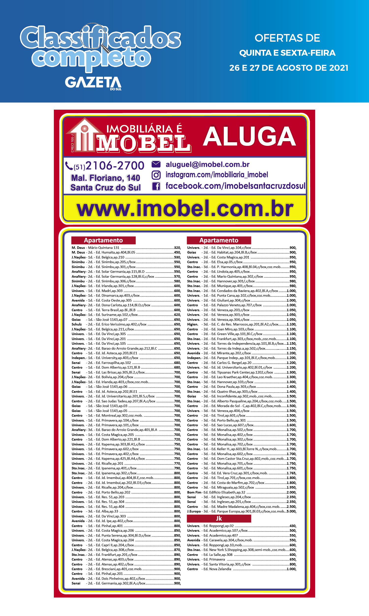 O suplemento de Classificados, que circula nas edições de terças, quintas e sábados, é um dos mais tradicionais da Gazeta do Sul, como vitrine e canal de negócios, de oferta, compra e venda em toda a região central do Rio Grande do Sul. E, para enriquecer pesquisas de produtos e serviços e possibilitar resultado ainda melhor a usuários e parceiros, nos anúncios de clientes cadastrados, o leitor tem acesso direto com link ao site do anunciante, onde poderá verificar mais detalhes sobre os itens. Confira: