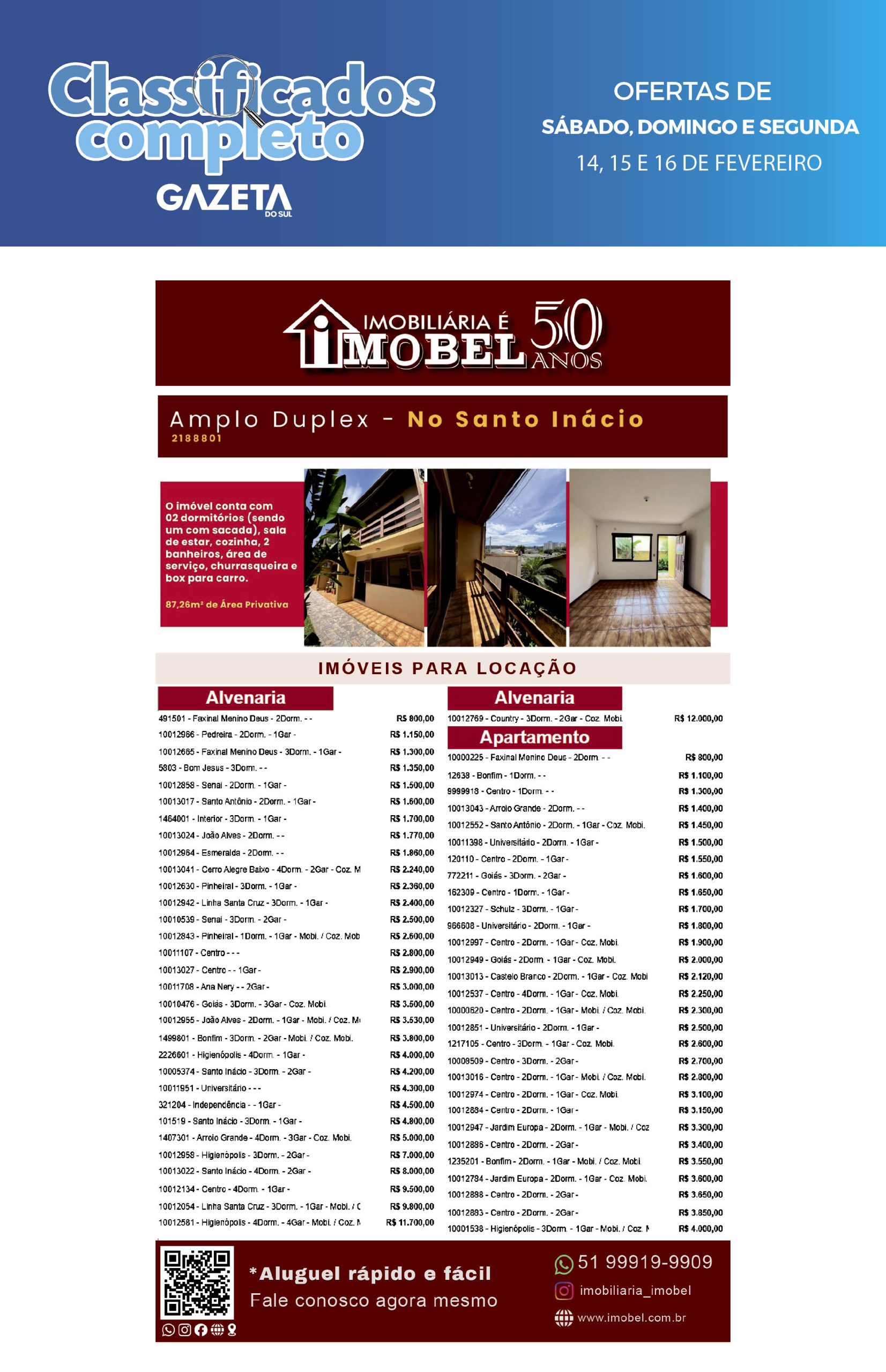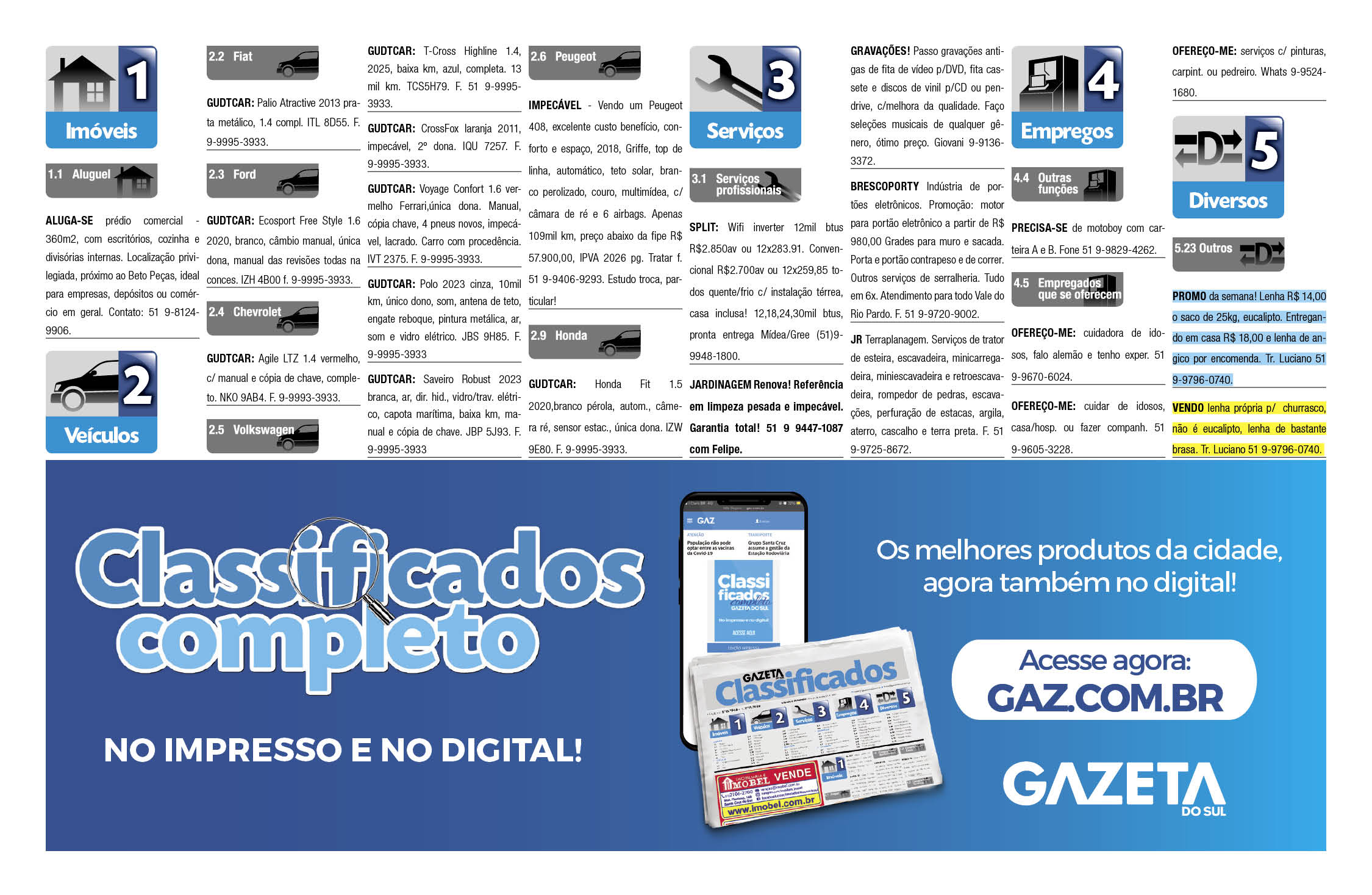 O suplemento de Classificados, que circula nas edições de terças, quintas e sábados, é um dos mais tradicionais da Gazeta do Sul, como vitrine e canal de negócios, de oferta, compra e venda em toda a região central do Rio Grande do Sul. E, para enriquecer pesquisas de produtos e serviços e possibilitar resultado ainda melhor a usuários e parceiros, nos anúncios de clientes cadastrados, o leitor tem acesso direto com link ao site do anunciante, onde poderá verificar mais detalhes sobre os itens. Confira as ofertas: