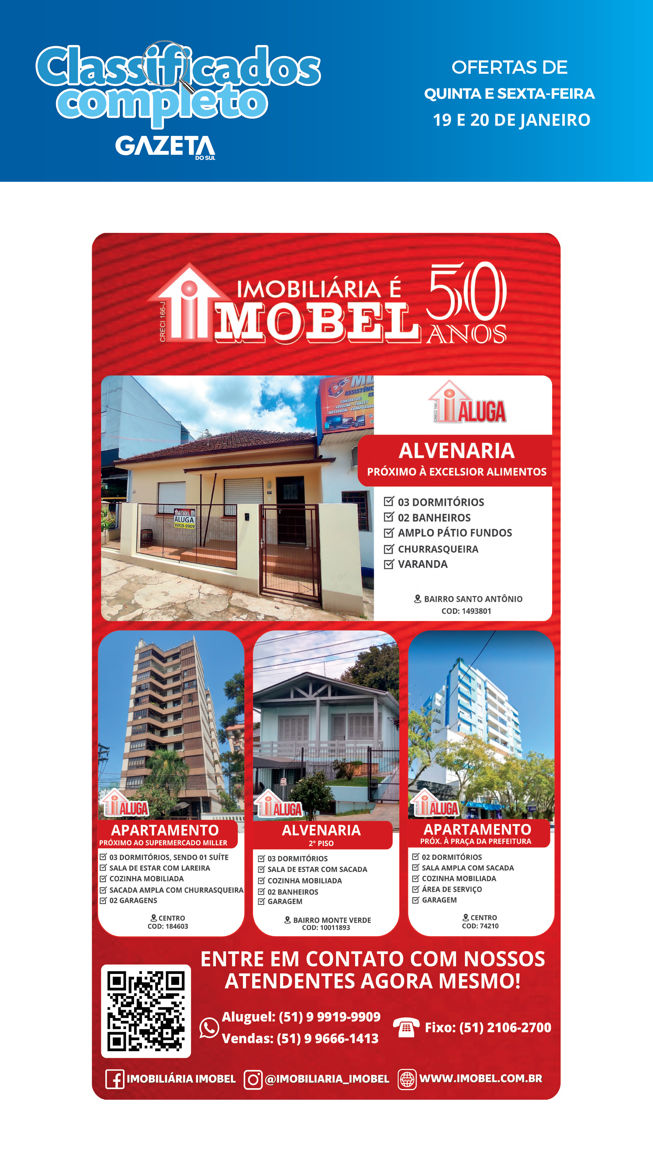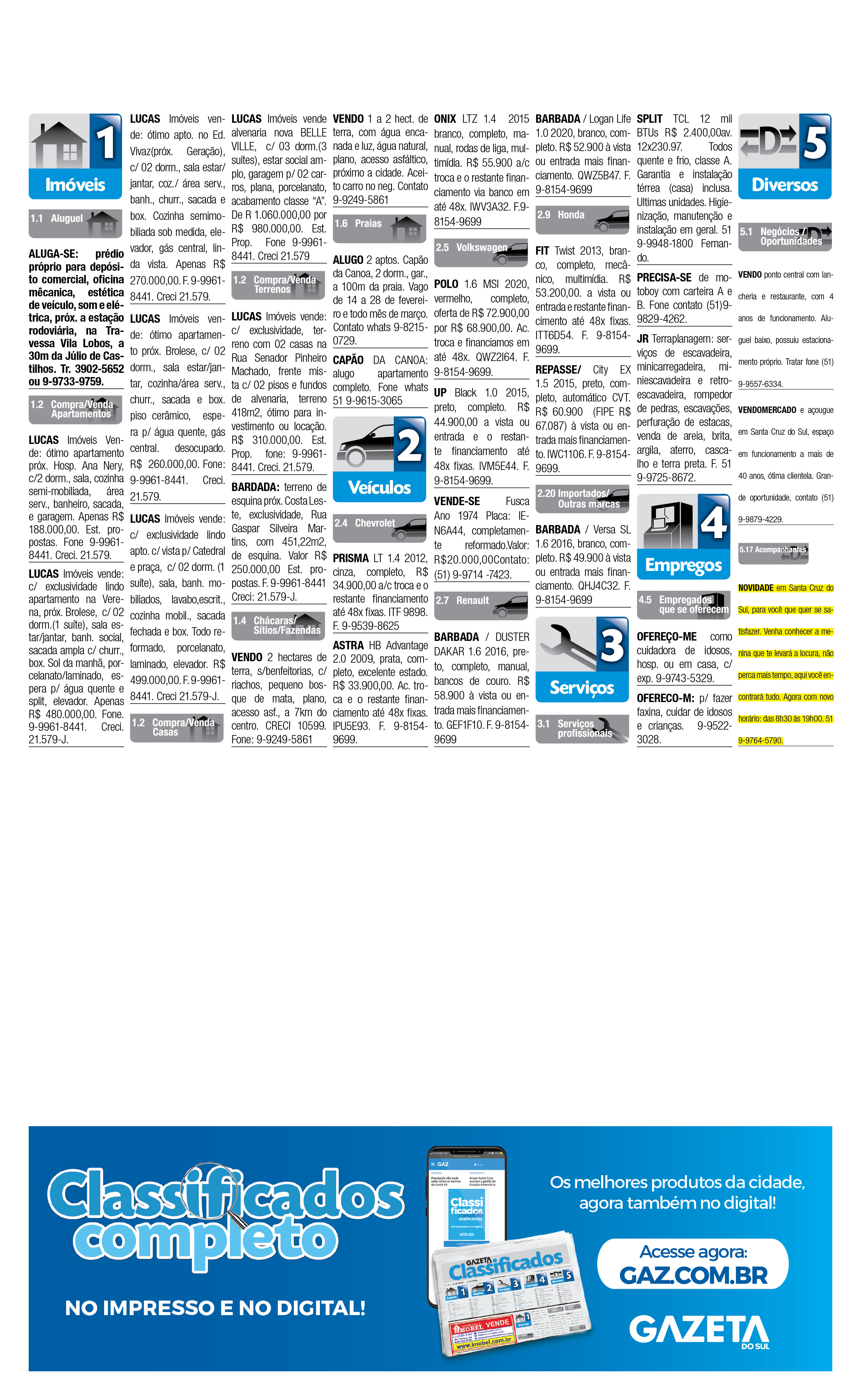 O suplemento de Classificados, que circula nas edições de terças, quintas e sábados, é um dos mais tradicionais da Gazeta do Sul, como vitrine e canal de negócios, de oferta, compra e venda em toda a região central do Rio Grande do Sul. E, para enriquecer pesquisas de produtos e serviços e possibilitar resultado ainda melhor a usuários e parceiros, nos anúncios de clientes cadastrados, o leitor tem acesso direto com link ao site do anunciante, onde poderá verificar mais detalhes sobre os itens. Confira as ofertas: