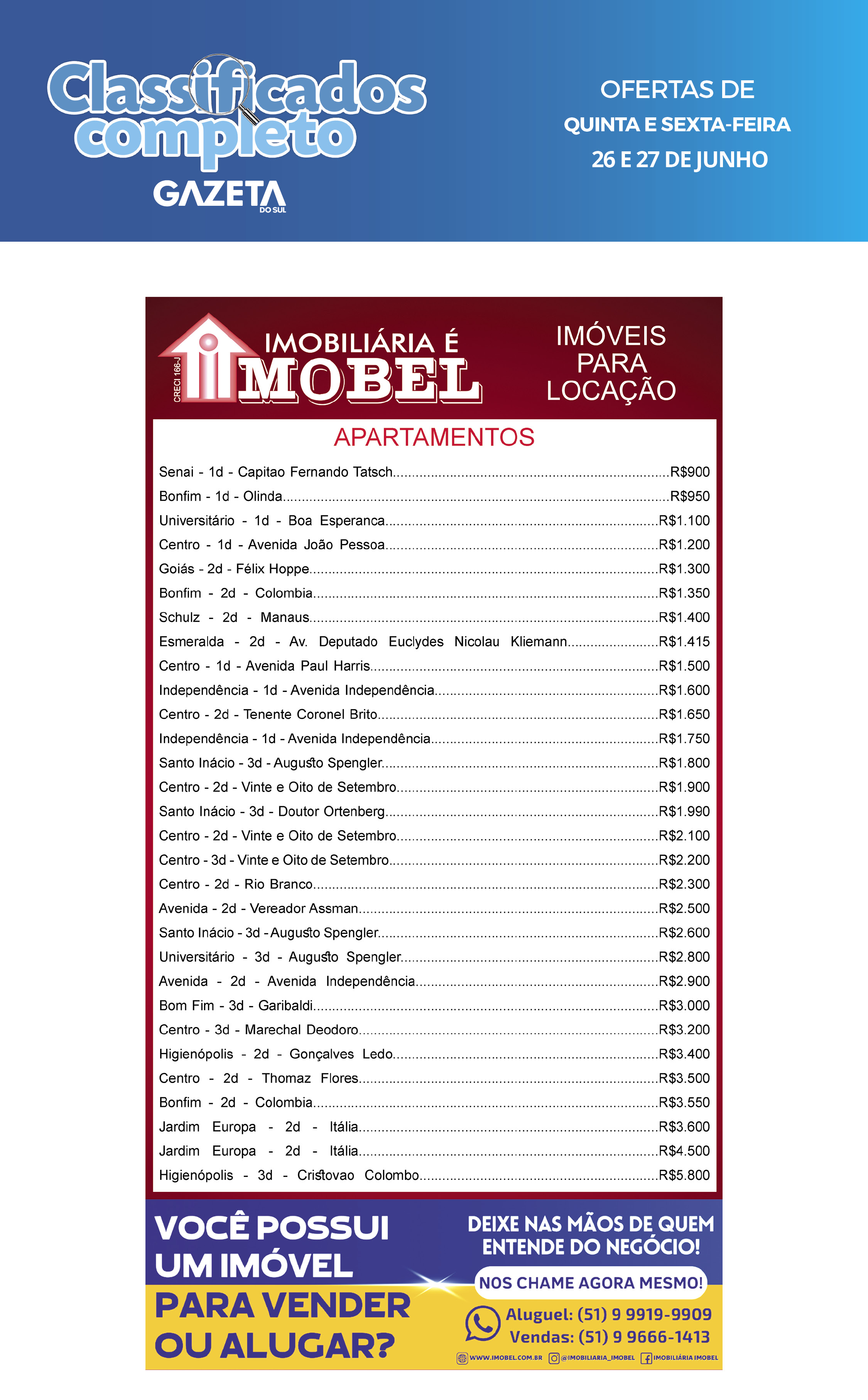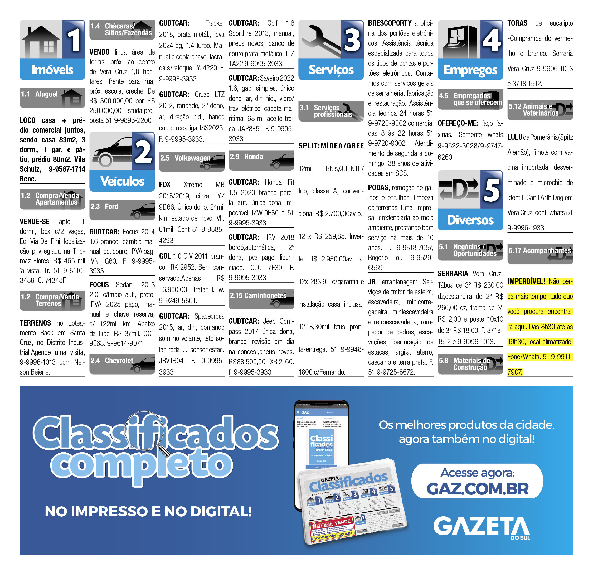 O suplemento de Classificados, que circula nas edições de terças, quintas e sábados, é um dos mais tradicionais da Gazeta do Sul, como vitrine e canal de negócios, de oferta, compra e venda em toda a região central do Rio Grande do Sul. E, para enriquecer pesquisas de produtos e serviços e possibilitar resultado ainda melhor a usuários e parceiros, nos anúncios de clientes cadastrados, o leitor tem acesso direto com link ao site do anunciante, onde poderá verificar mais detalhes sobre os itens. Confira as ofertas: