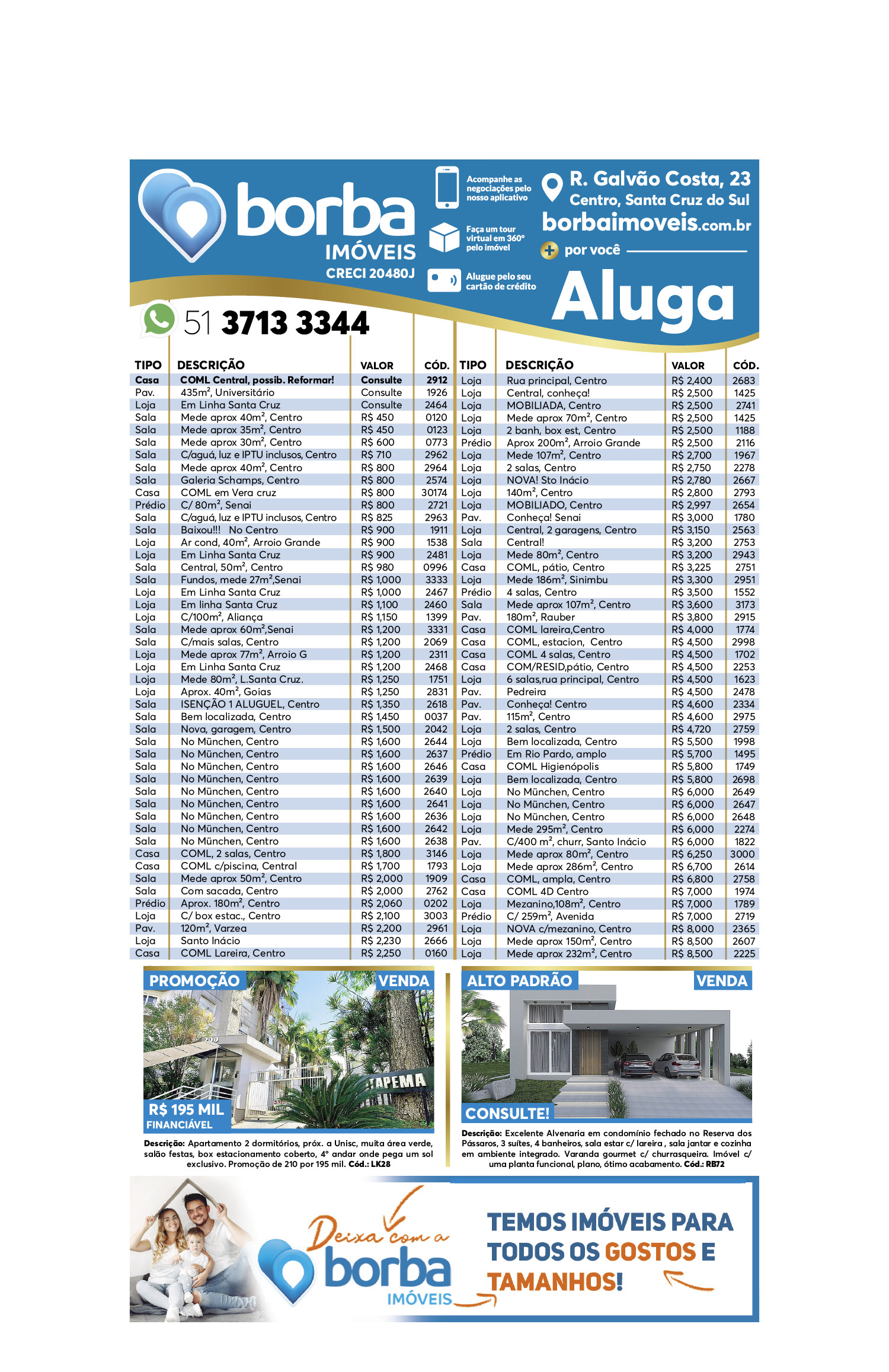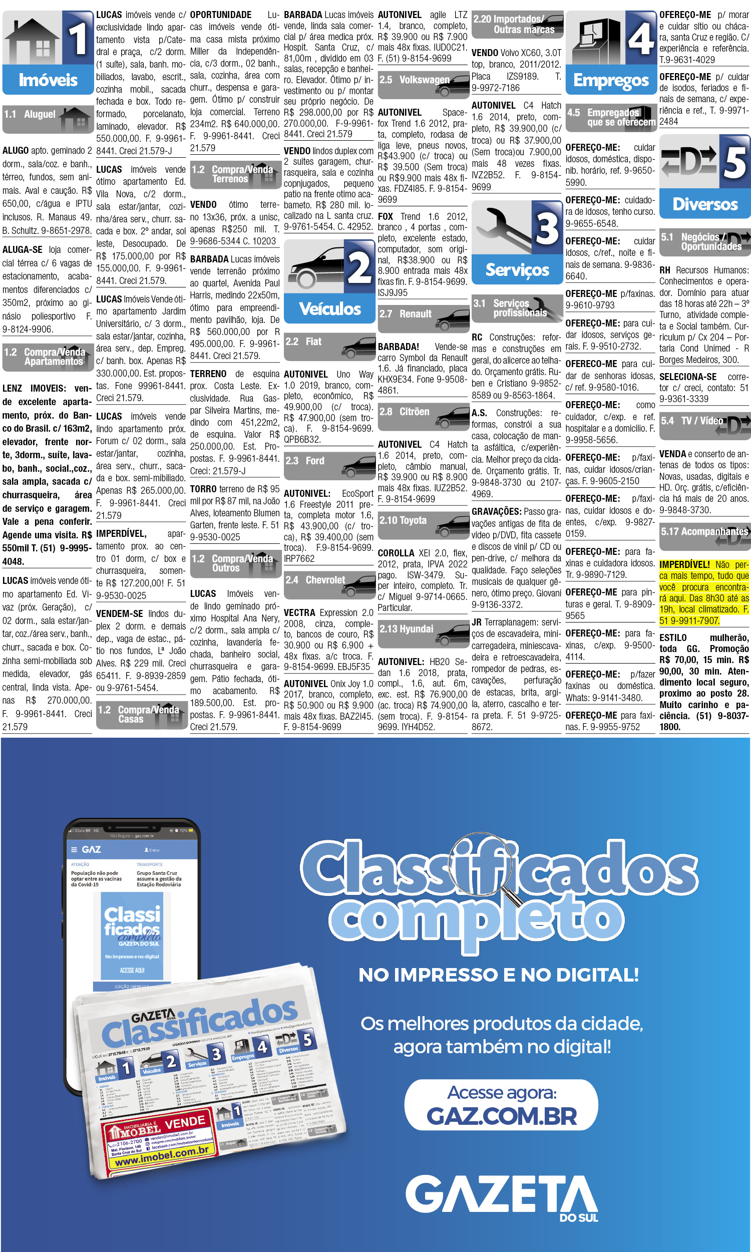 O suplemento de Classificados, que circula nas edições de terças, quintas e sábados, é um dos mais tradicionais da Gazeta do Sul, como vitrine e canal de negócios, de oferta, compra e venda em toda a região central do Rio Grande do Sul. E, para enriquecer pesquisas de produtos e serviços e possibilitar resultado ainda melhor a usuários e parceiros, nos anúncios de clientes cadastrados, o leitor tem acesso direto com link ao site do anunciante, onde poderá verificar mais detalhes sobre os itens. Confira as ofertas: